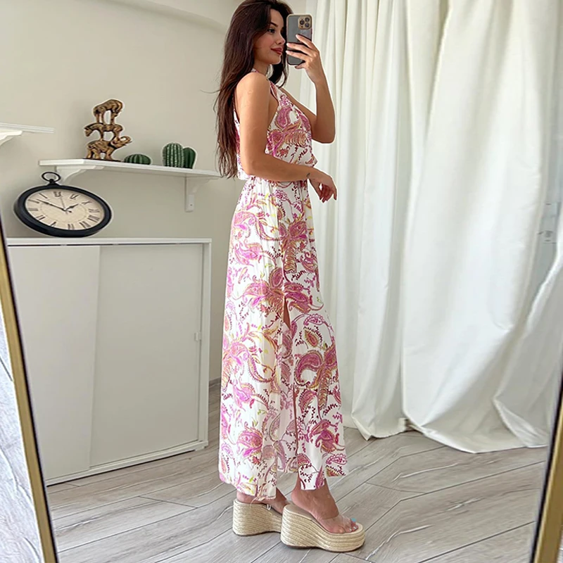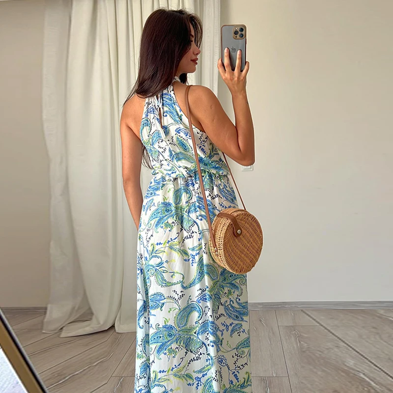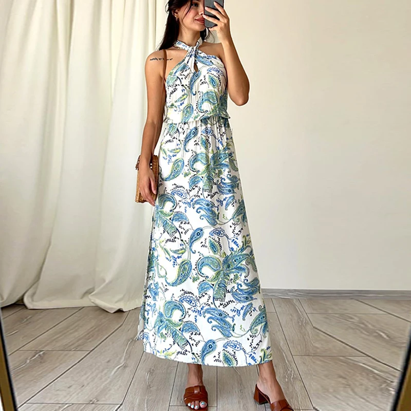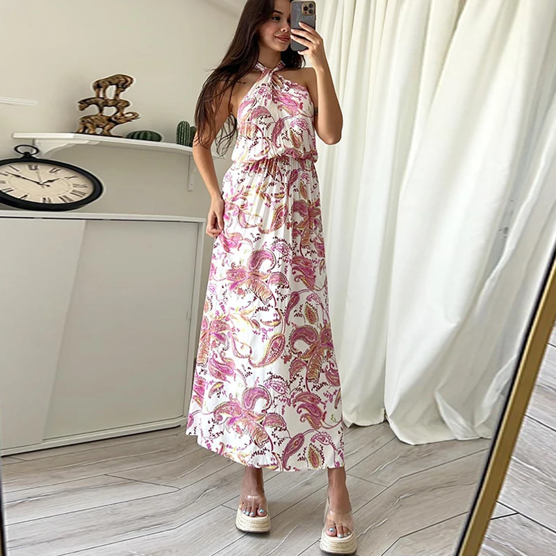 Advbridge - Elegant Off Shoulder Cross Halter Party Dress Fashion Pattern Print Loose Long Dress Lady Casual Sleeveless Backless Beach Dress