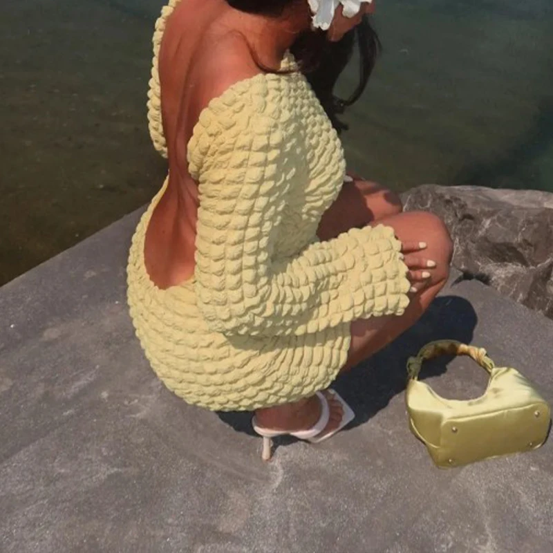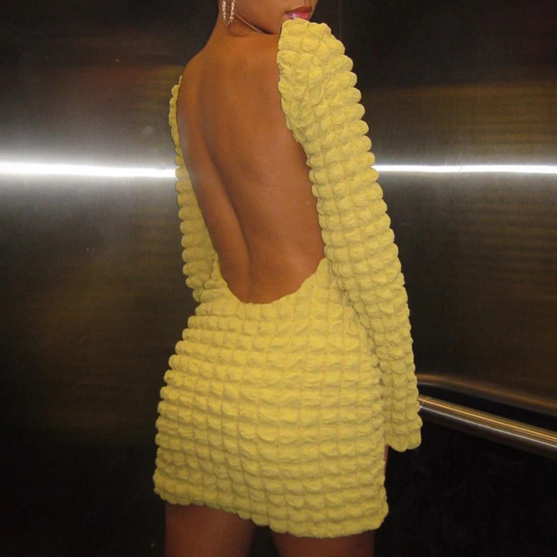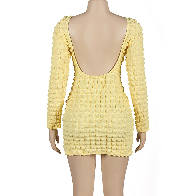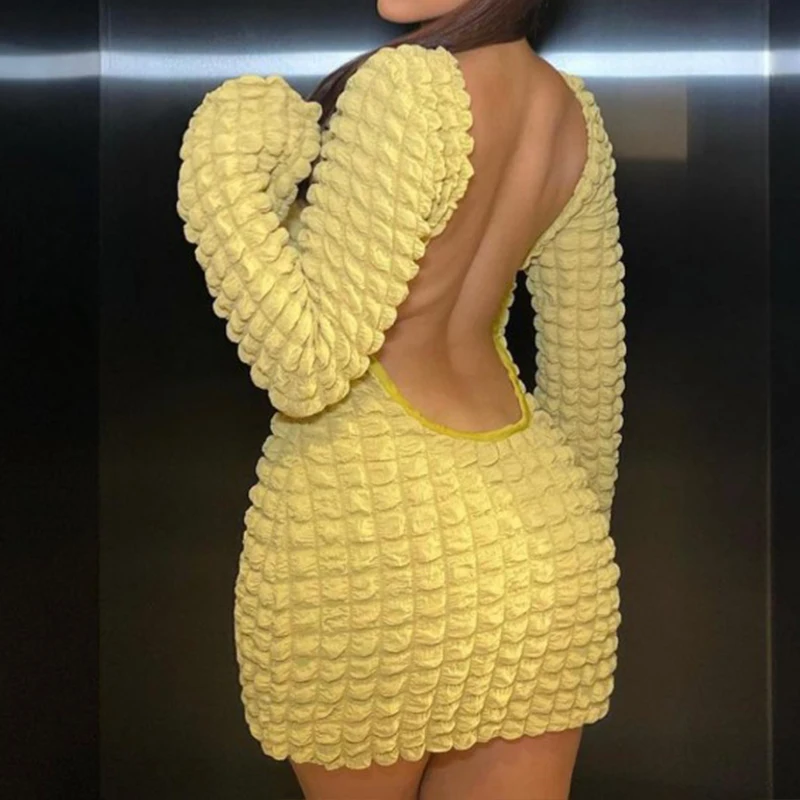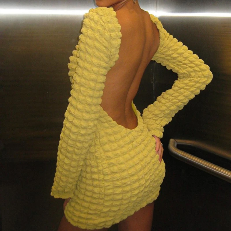 ADVBRIDGE - Autumn Yellow Sexy Open Back Popcorn Texture Short Dress Skinny High Waist Hipster Mini Dress Women Elegant Club Streetwear