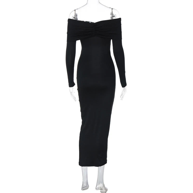 ADVBRIDGE - Black Elegant Slash Neck Off-shoulder Bodycon Fashion Women's Long-sleeve Pleated Sexy Long Dress Autumn Winter Party Gowns
