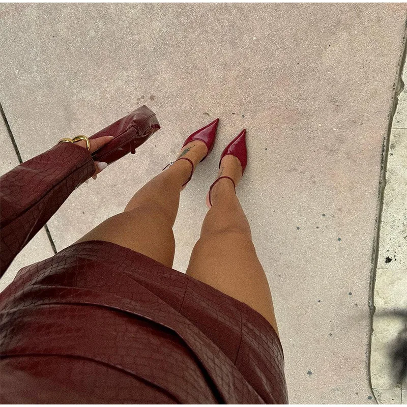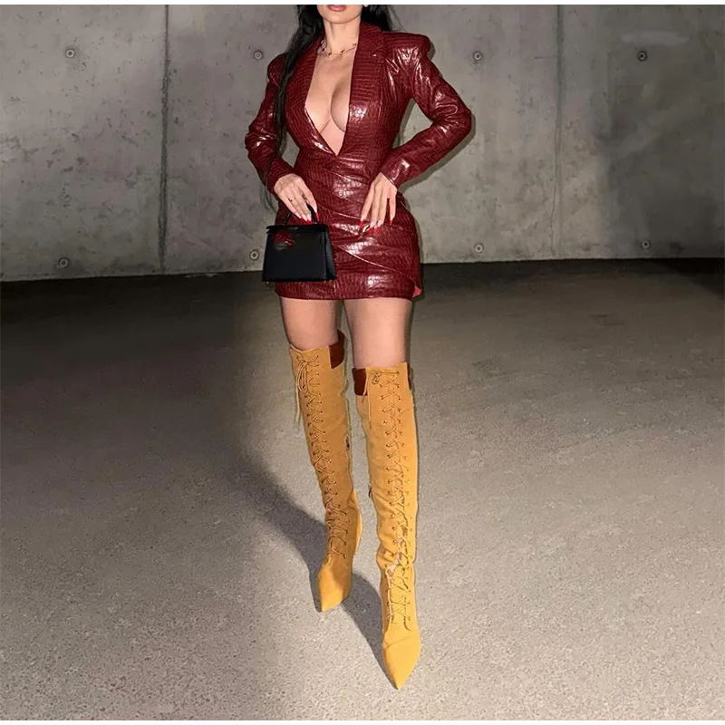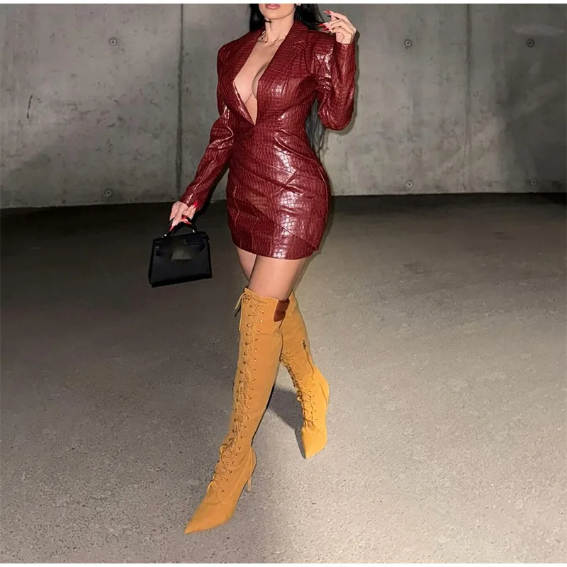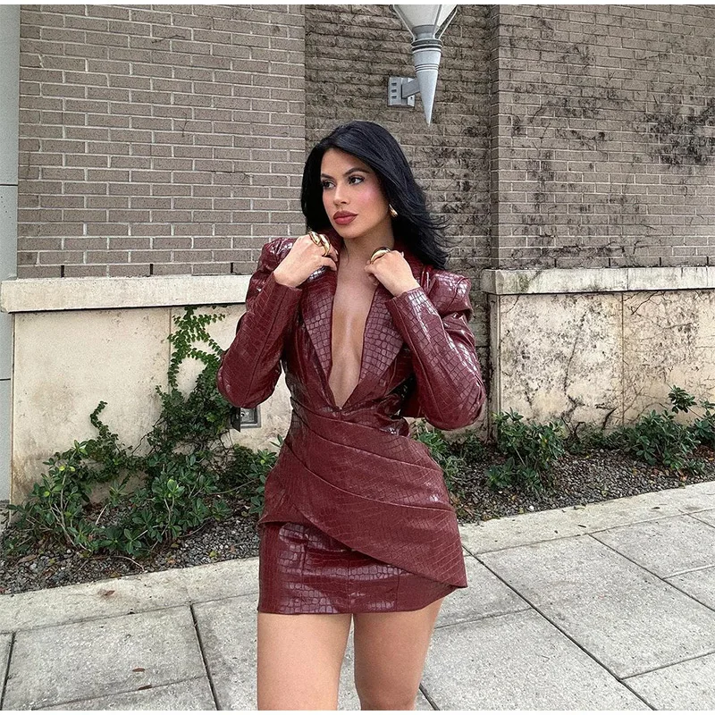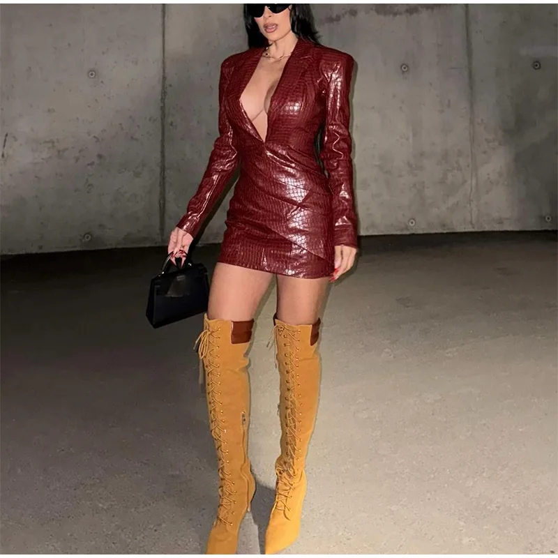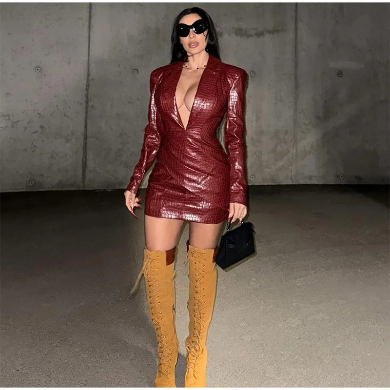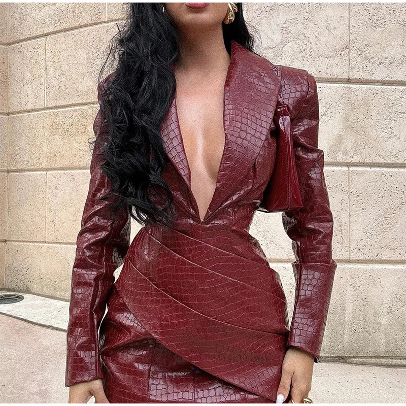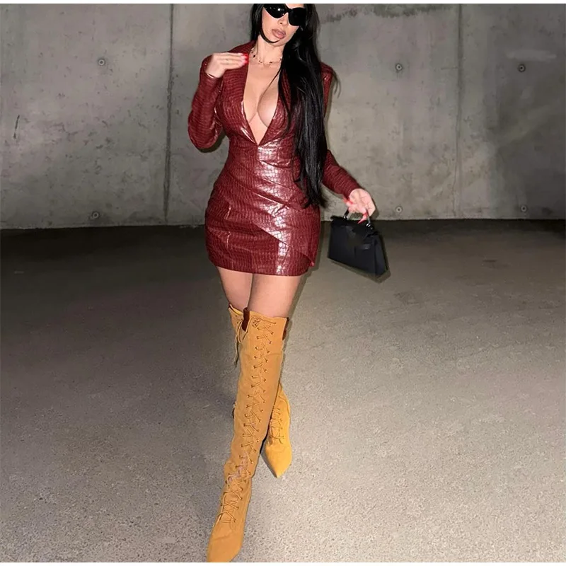 Advbridge Chic Burgundy Women's Deep V-neck Leather Mini Dress Elegant Long Sleeved Slim Fit High Waist Dresses Lady 2024 High Streetwear