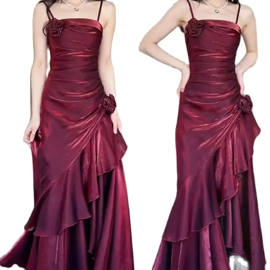 Advbridge Custom Sexy Wine Red Spaghetti Strap Satin Prom Gowns Tiered 3D Flowers Sleeveless Party Dress Women vestidos de festa