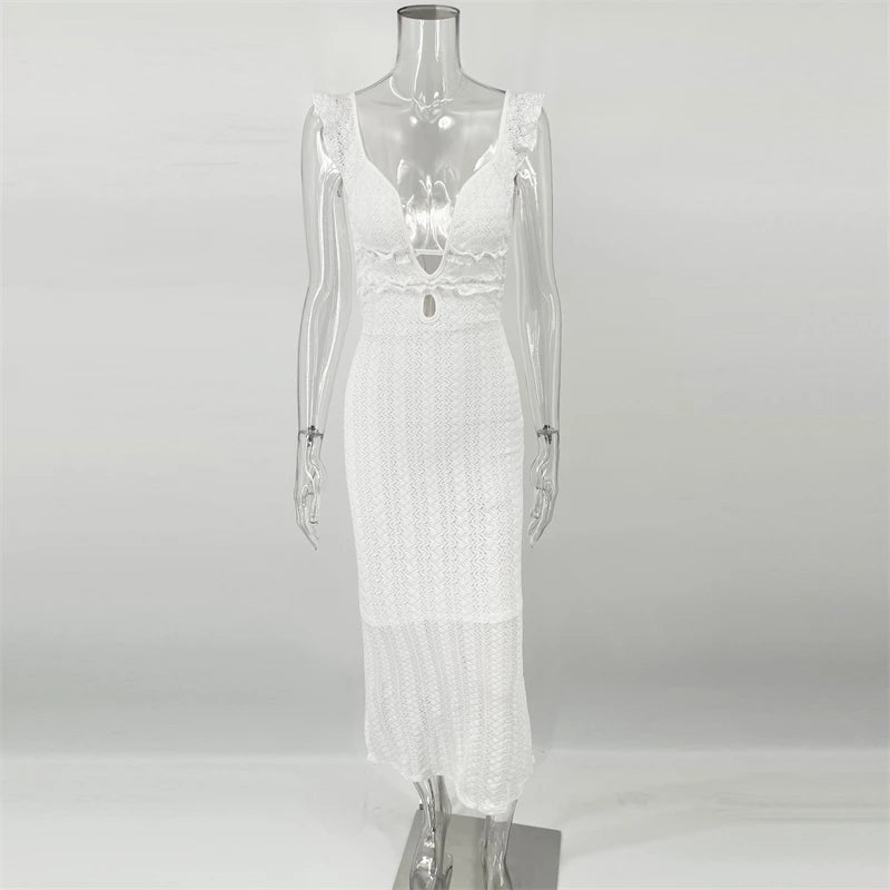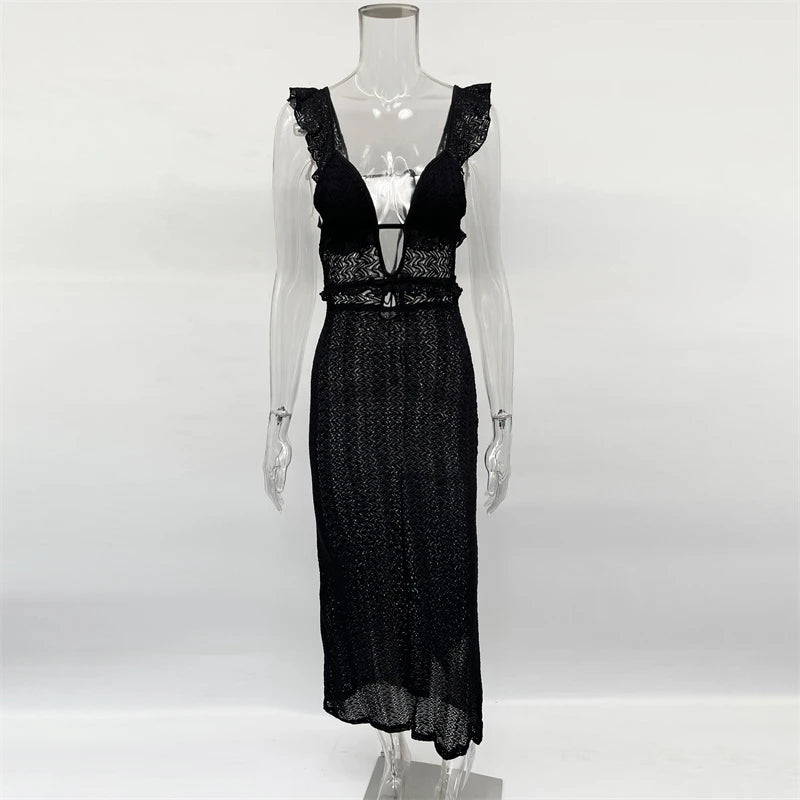 Advbridge Deep V Neck Sexy Dresses Women Sleeveless See Through High Waist Long Cover Up Dress Femme Holiday Knitted Beach Dress