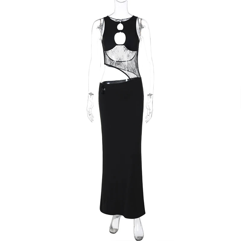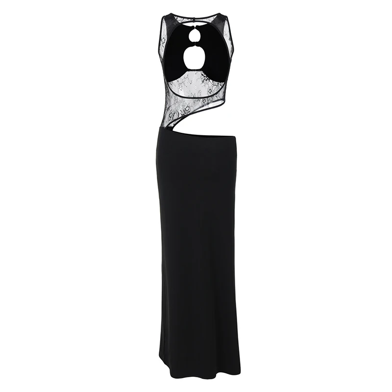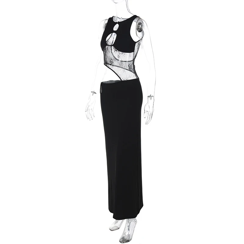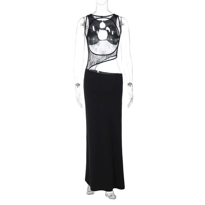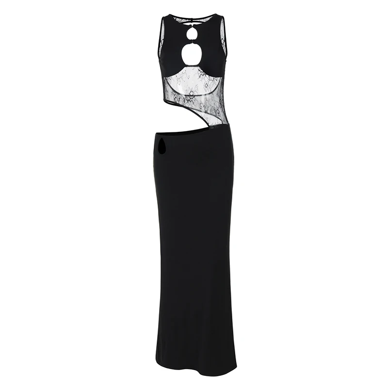 ADVBRIDGE -  Elegant Black Floral Pattern Irregular Hollow Out Round Neck Open Back Bodycon Women's Dress Party Mesh Summer Tank Dresses