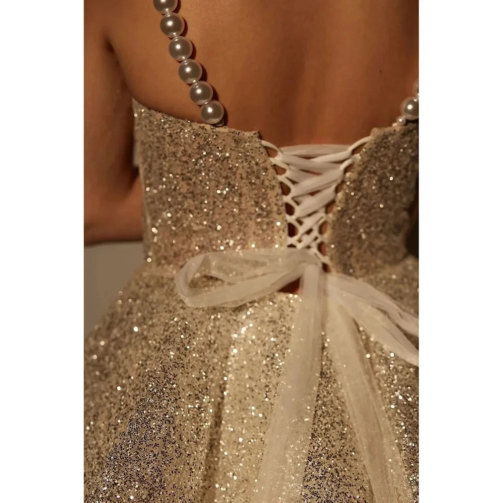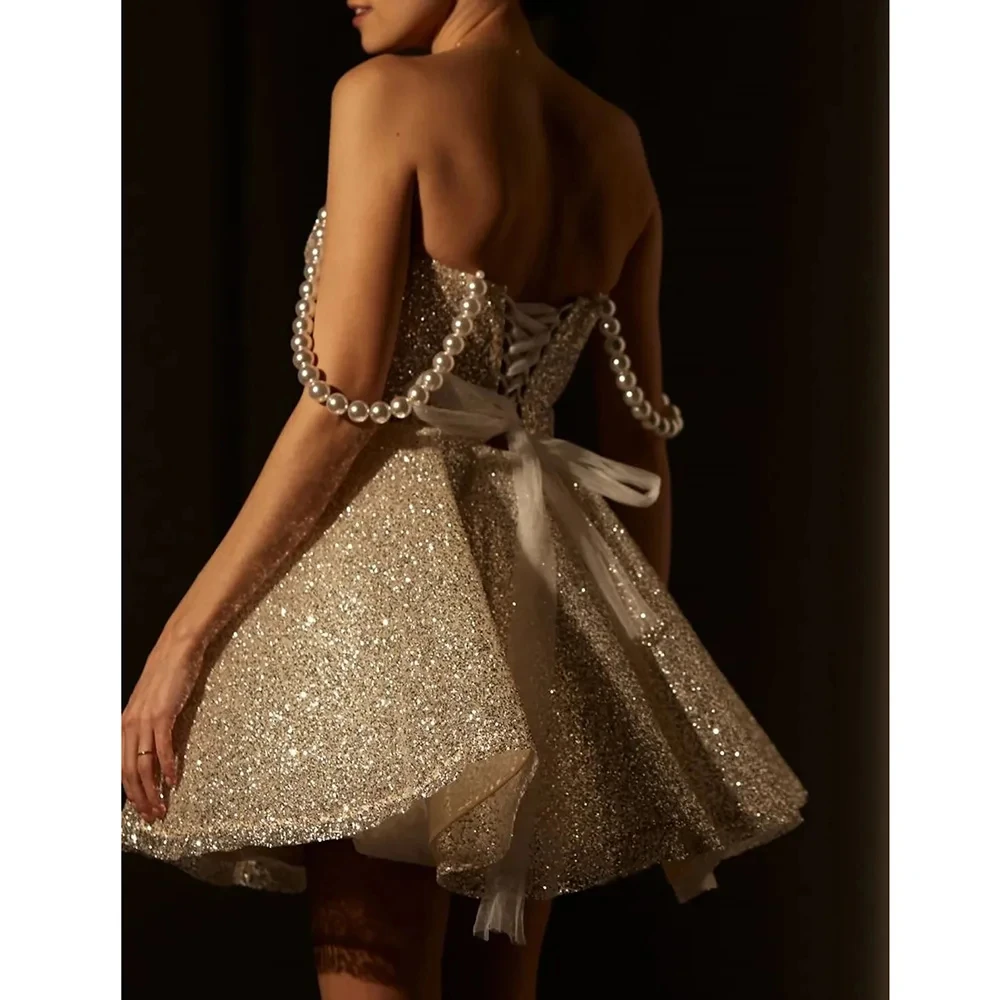 Advbridge Elegant Gold Mini Evening Party Gown with Pearl Shoulder Straps Sleeveless Short Prom Dress Cocktail Dresses for Women Banquet