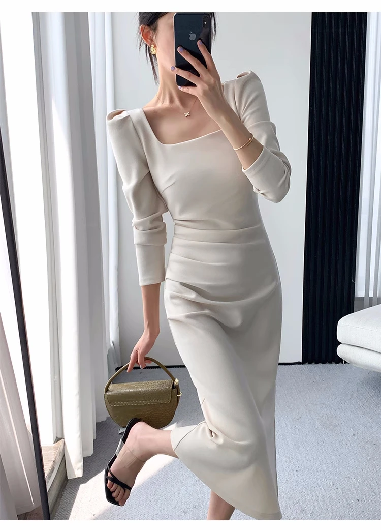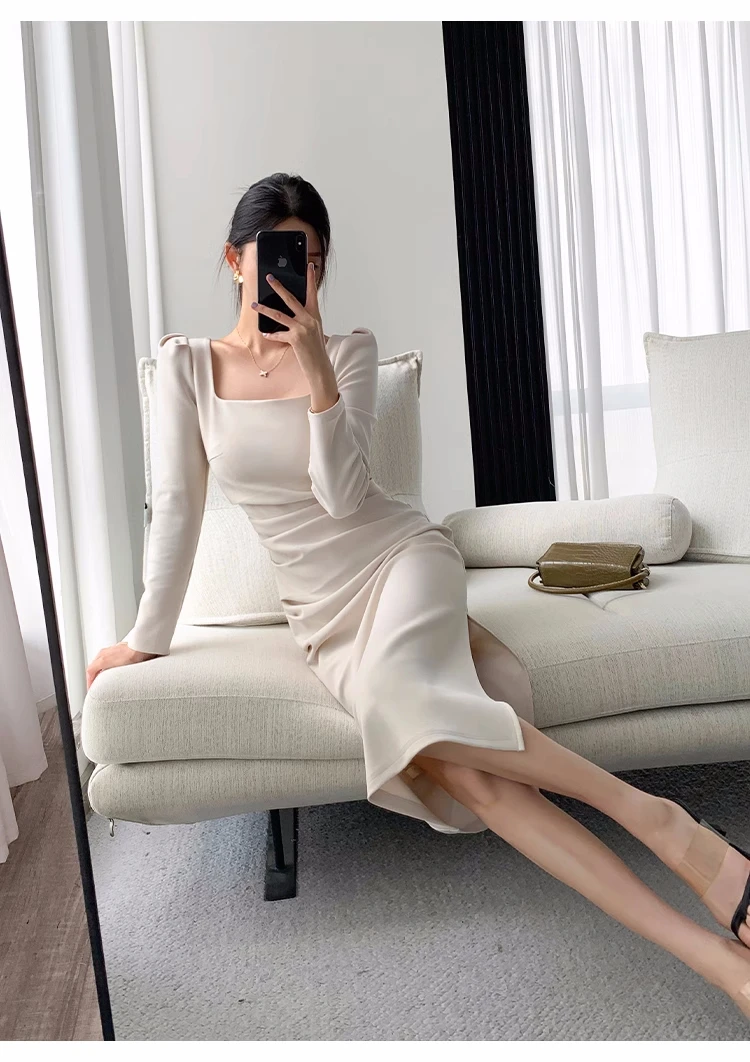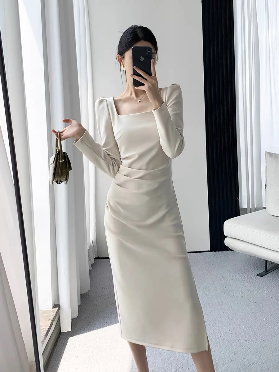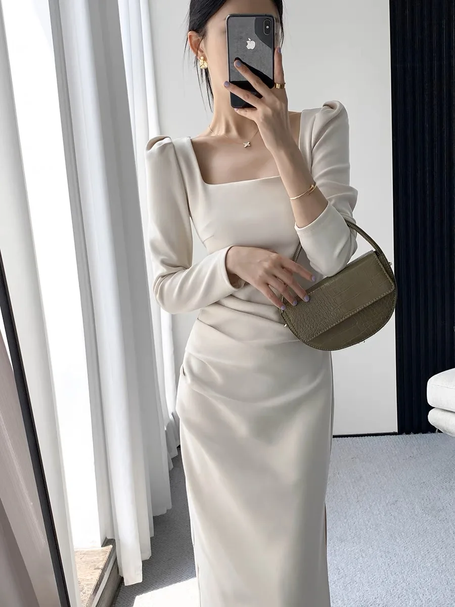 Advbridge Elegant Long Sleeve Midi Dresses for Women Square Collar Slim Waist Bodycon Split Dress Autumn New Solid Office Lady Vestidos