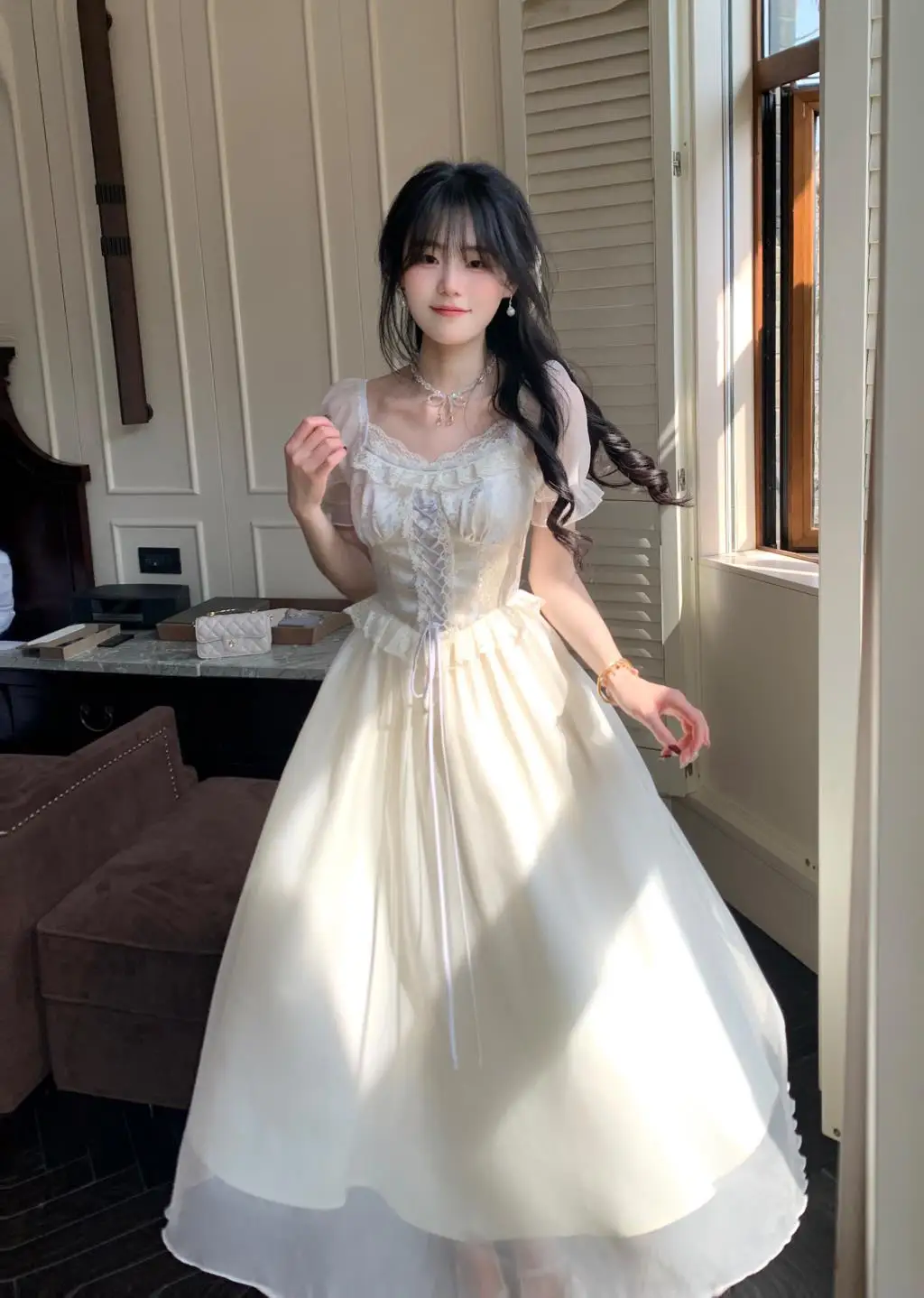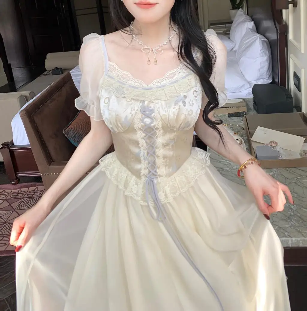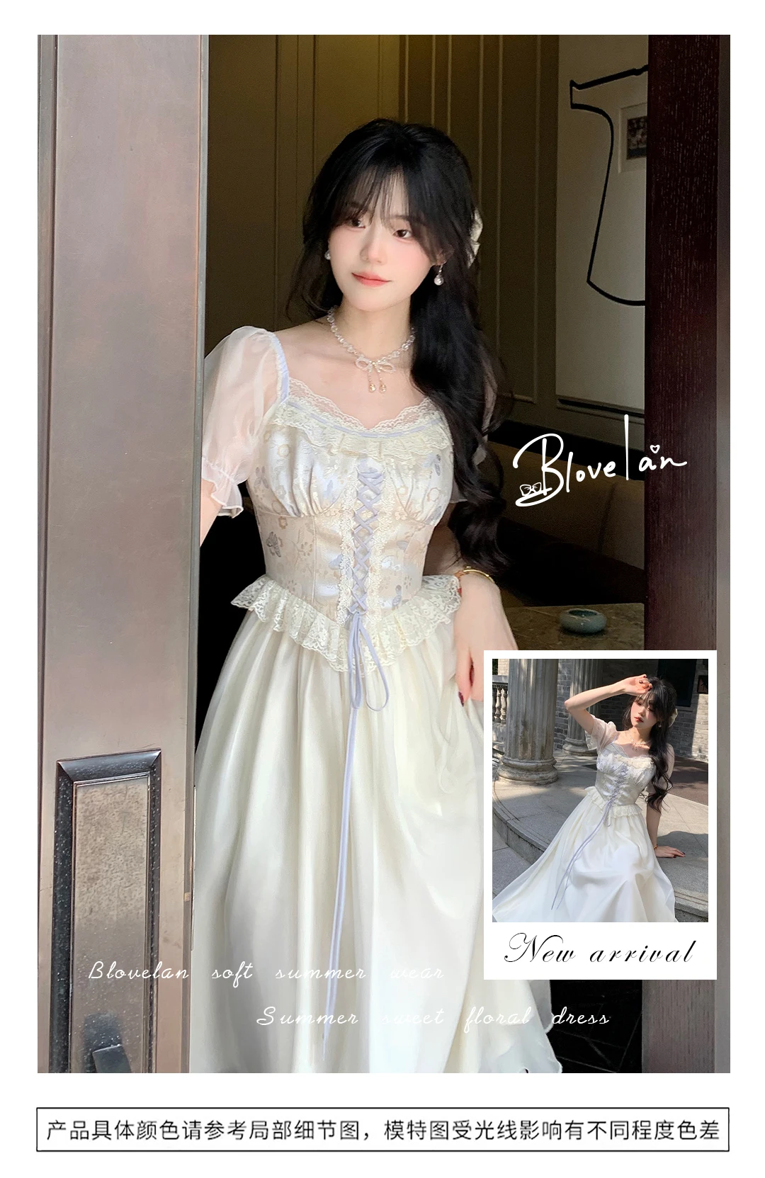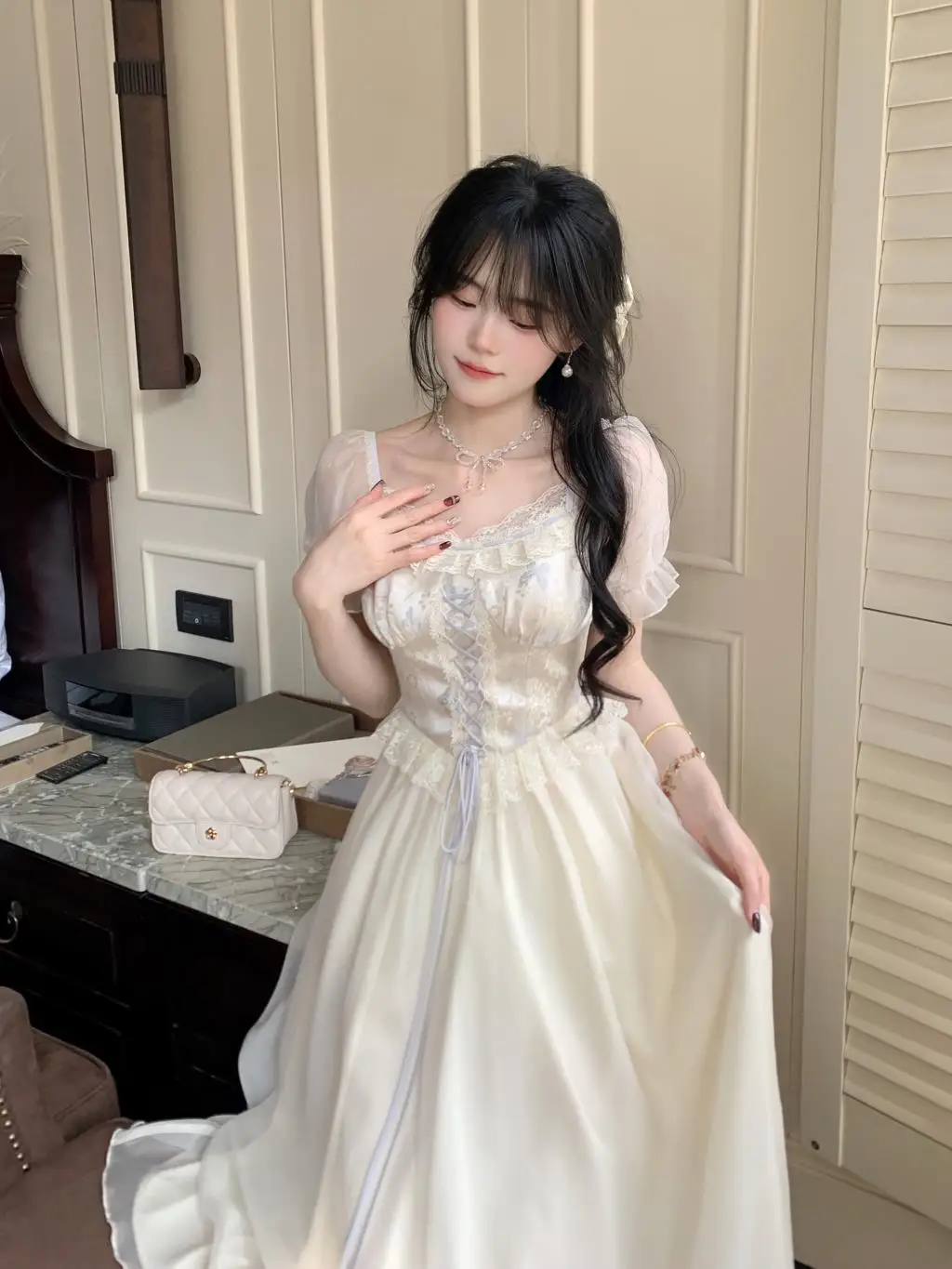 Advbridge Elegant Princess Birthday Party Dress Puff Sleeve Lace-up A-line Midi Dresses for Women Square Collar Prom Robe Vestidos Mujer