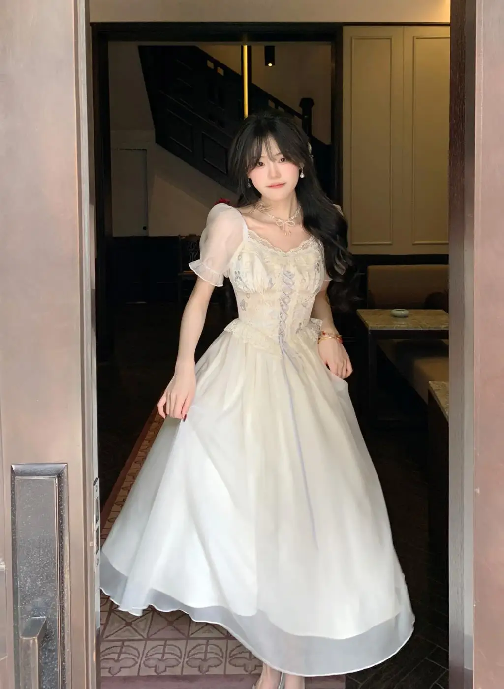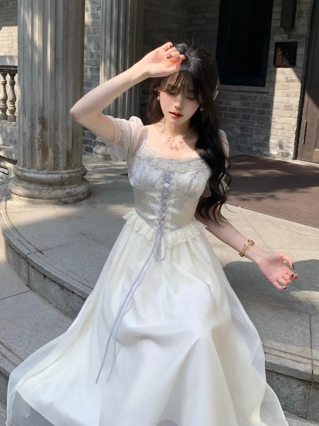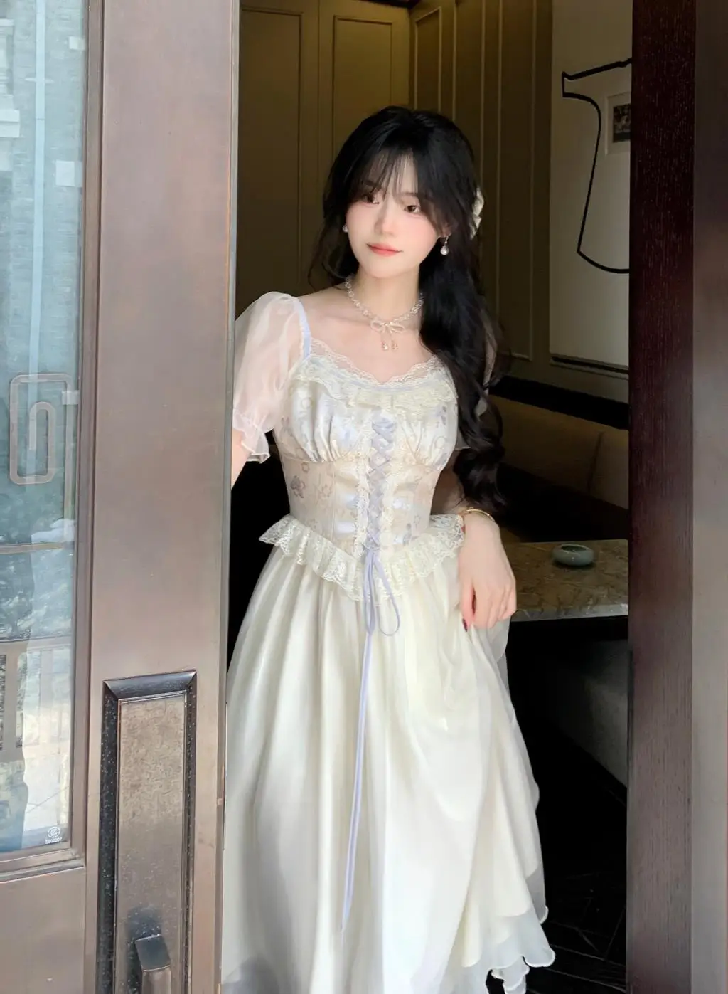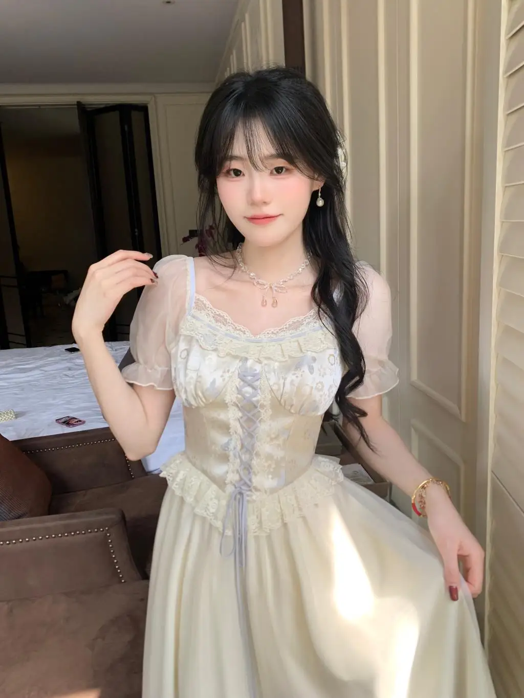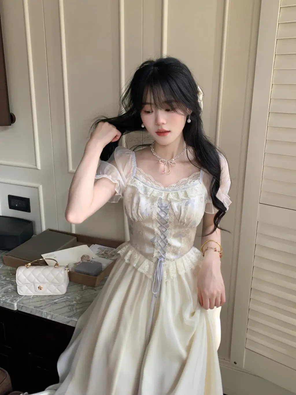 Advbridge Elegant Princess Birthday Party Dress Puff Sleeve Lace-up A-line Midi Dresses for Women Square Collar Prom Robe Vestidos Mujer