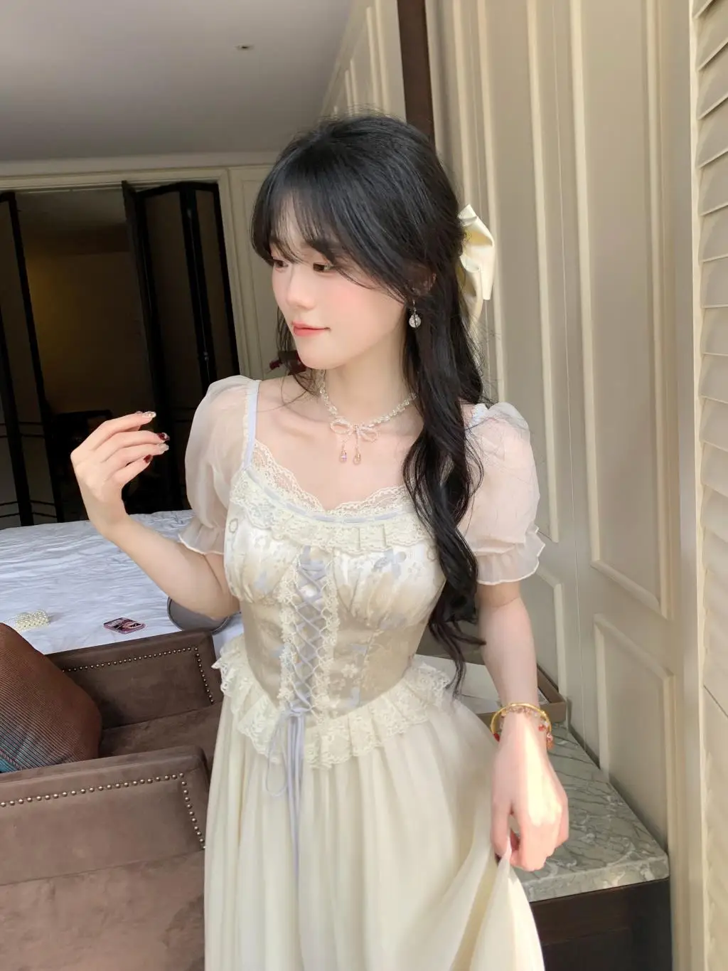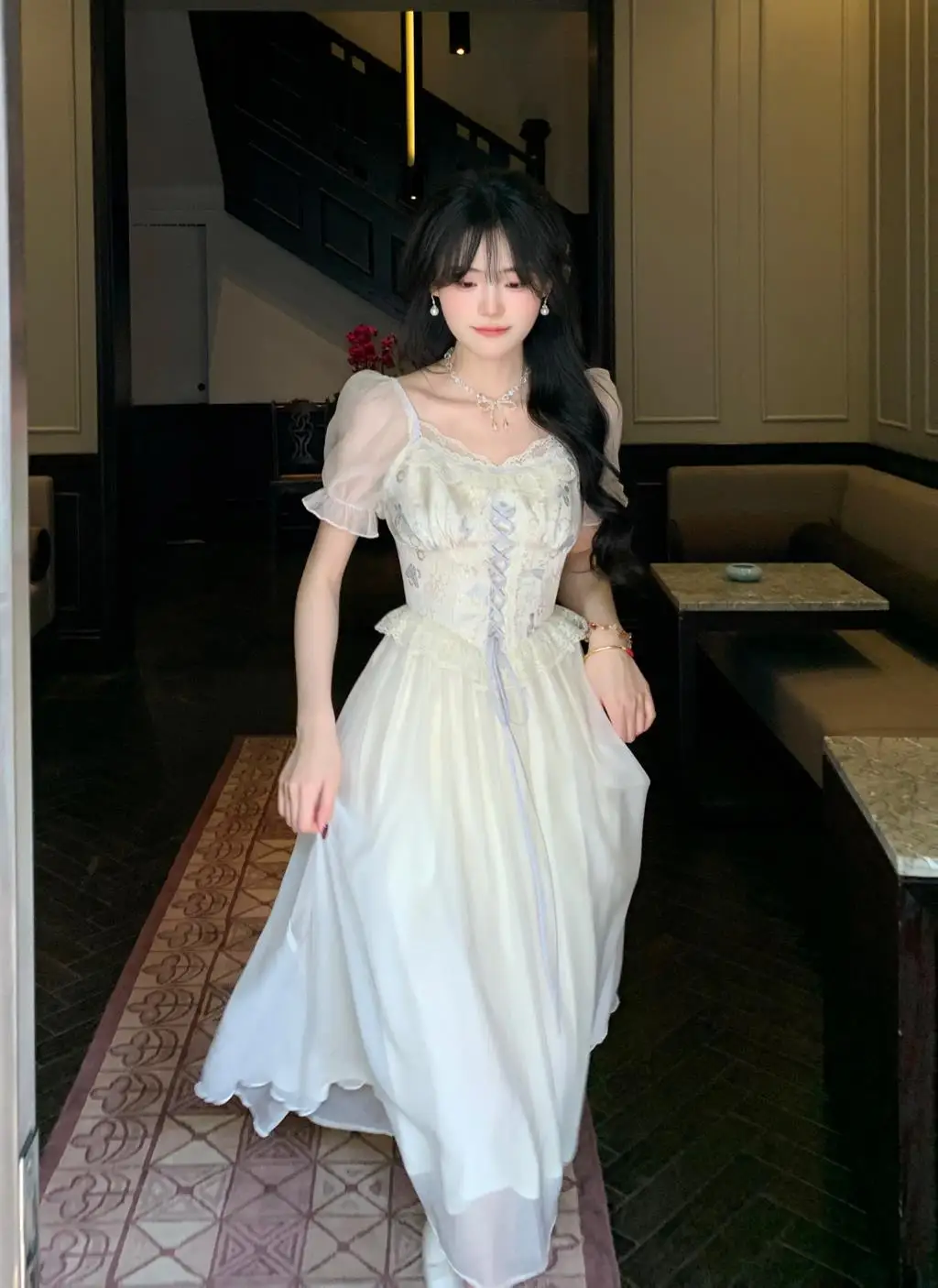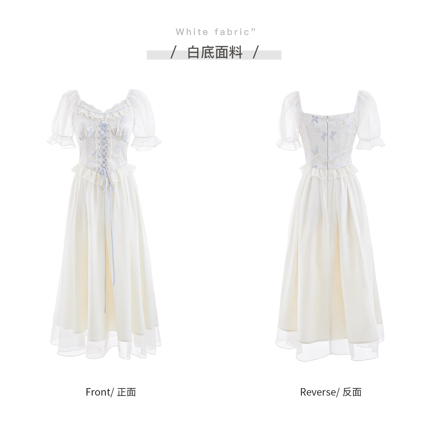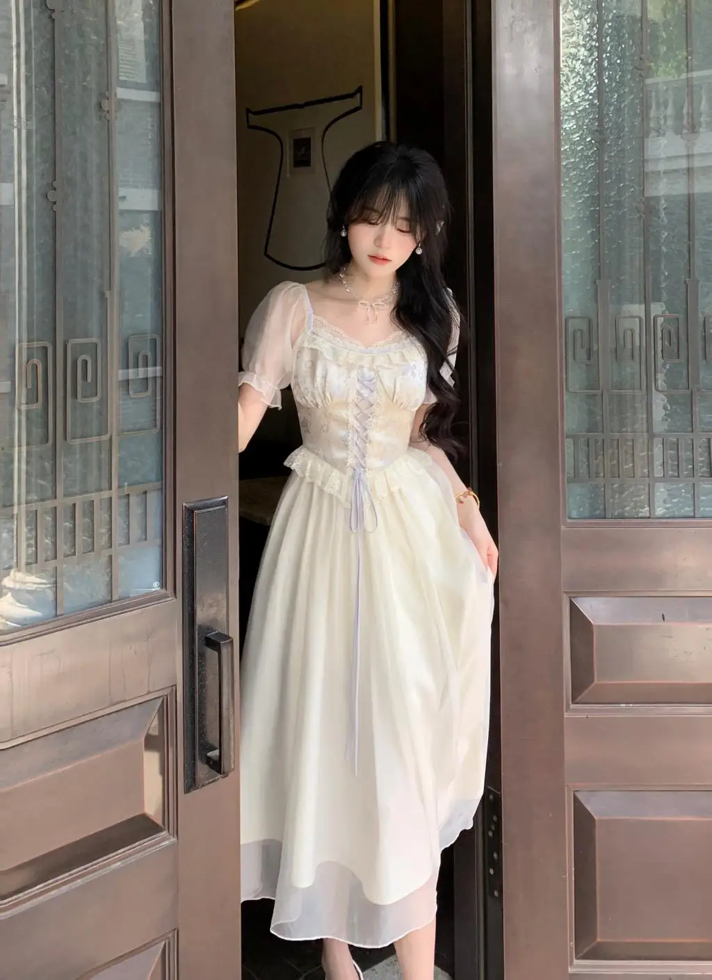 Advbridge Elegant Princess Birthday Party Dress Puff Sleeve Lace-up A-line Midi Dresses for Women Square Collar Prom Robe Vestidos Mujer