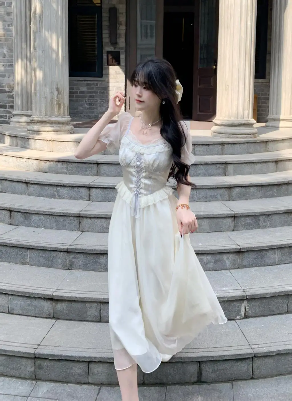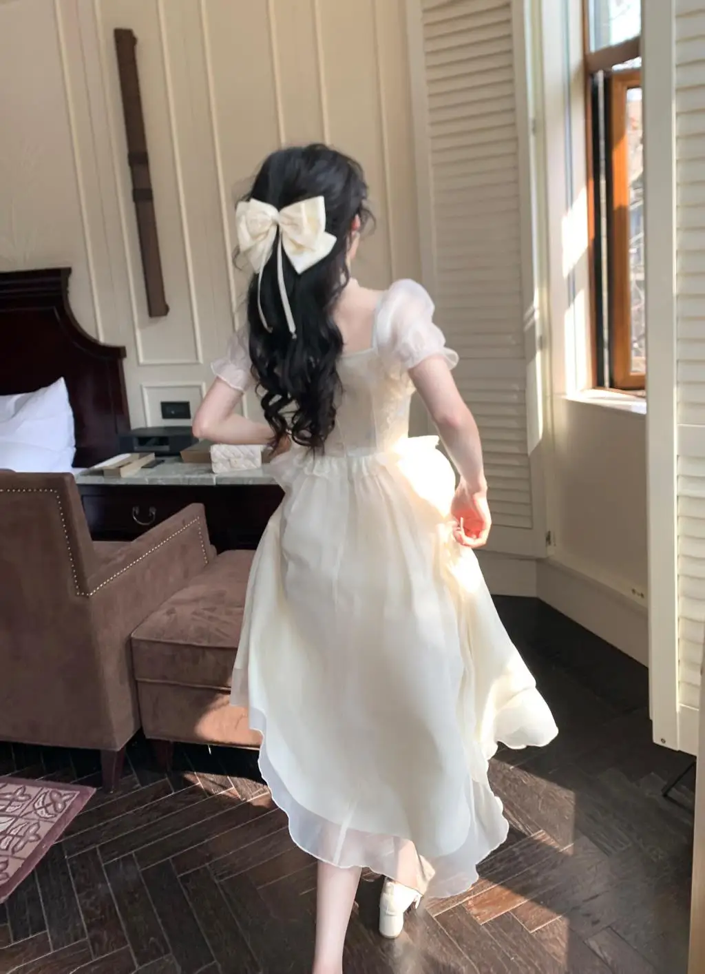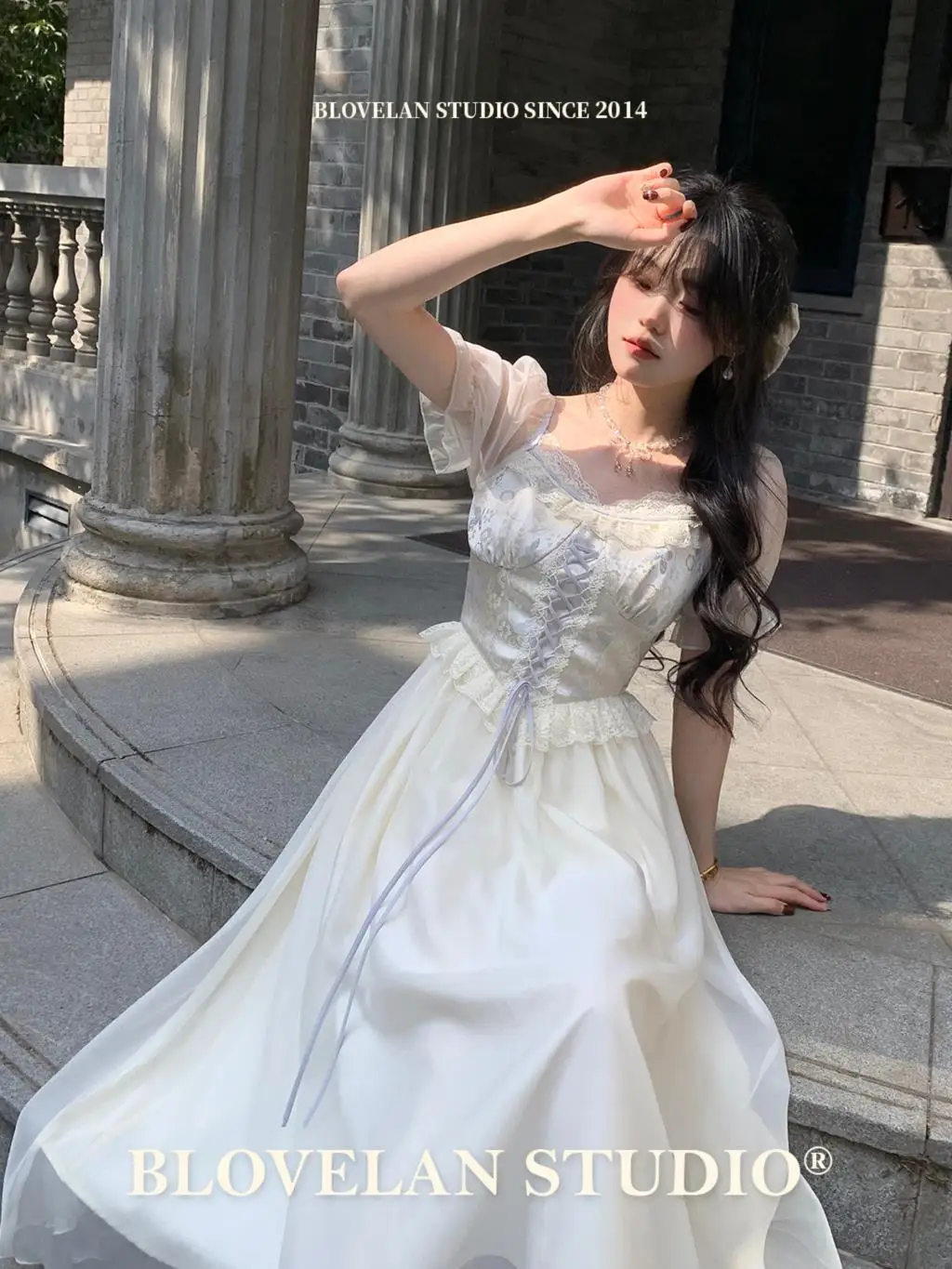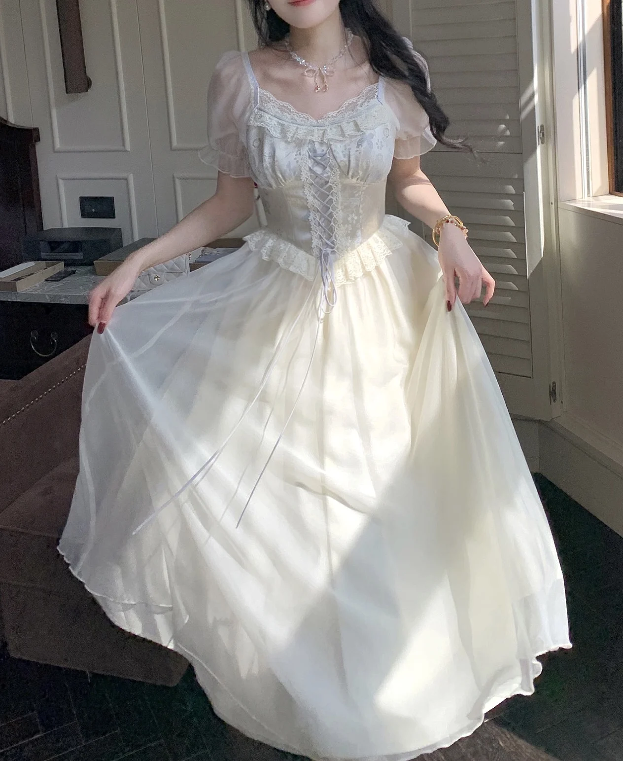 Advbridge Elegant Princess Birthday Party Dress Puff Sleeve Lace-up A-line Midi Dresses for Women Square Collar Prom Robe Vestidos Mujer