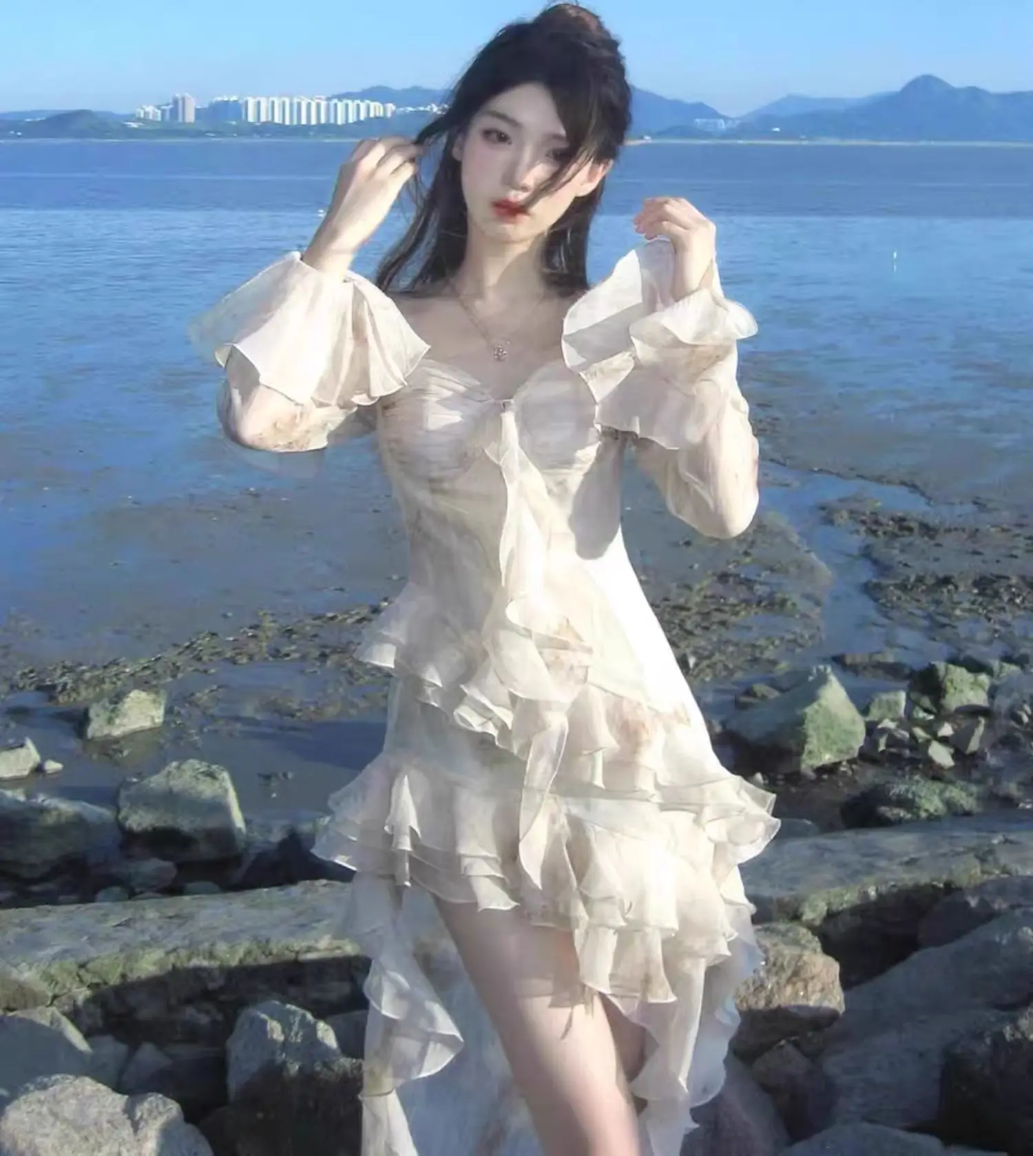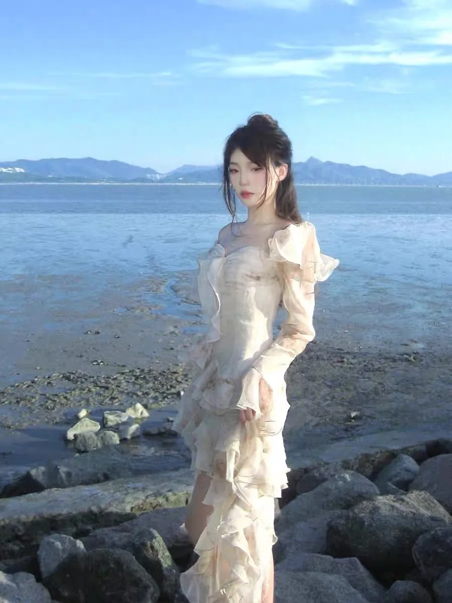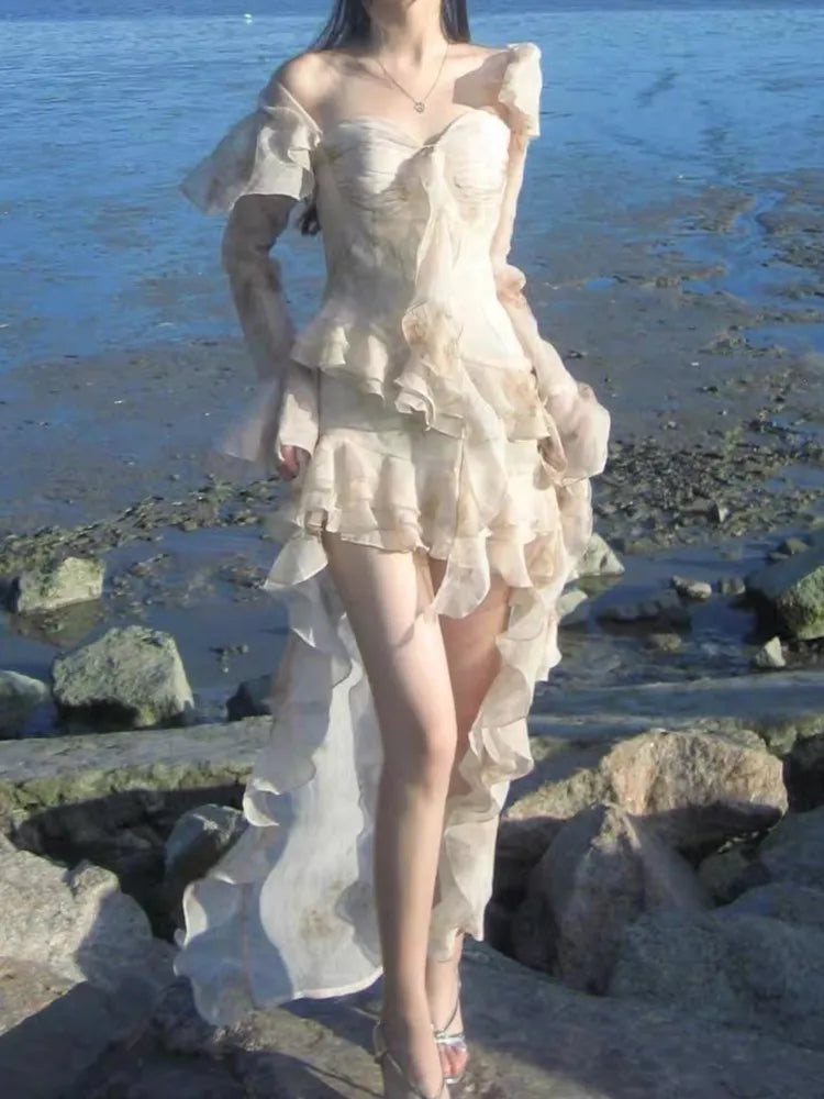 Advbridge Fashion New Women Chiffon Ruffle Beach Dress Spring Summer Vintage Chic Solid Elegant Sexy Vestidos Female Holiday Clothes