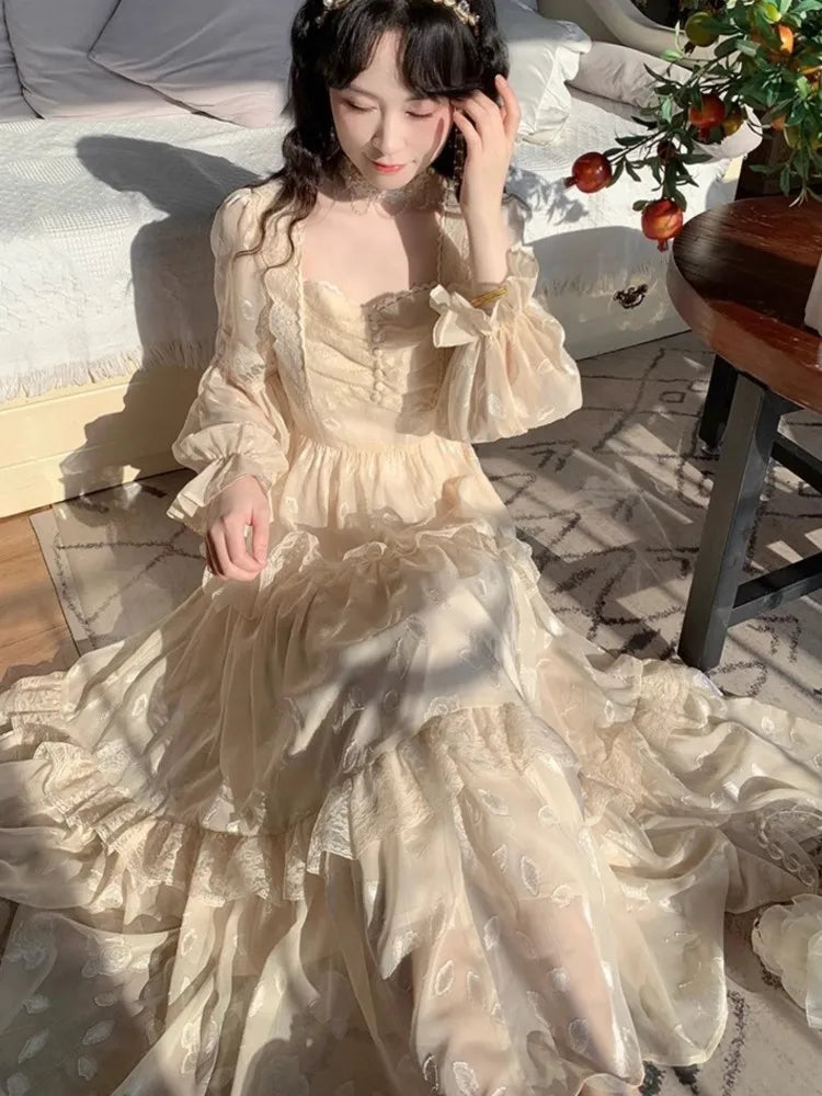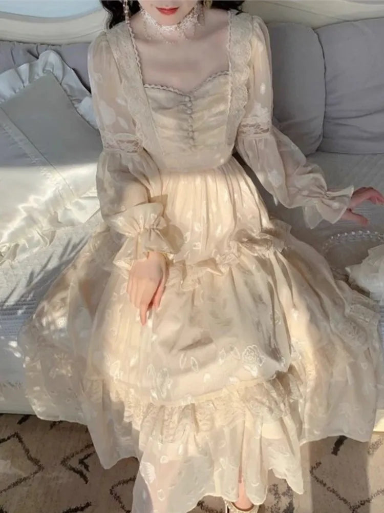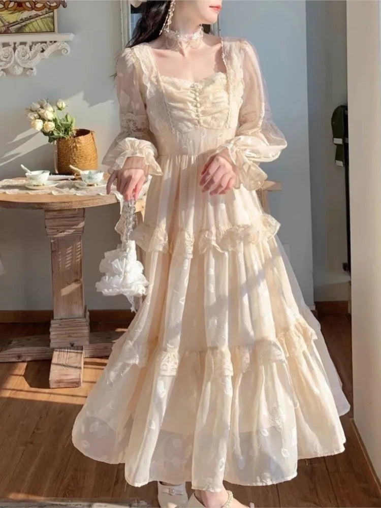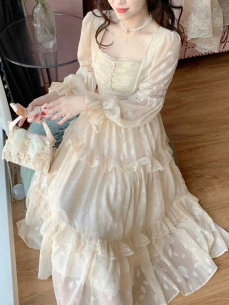 Advbridge French Elegant Fairy Lace Dress Women Autumn Sweet Ruffles Petal Sleeve High Waist Princess Clothing Vintage Evening Party Mjuer