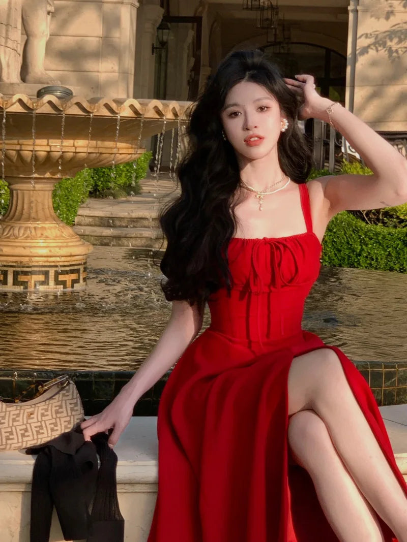 Advbridge French Elegant White Strap Midi Dress Summer New Casual Evening Party Dress Women Beach Sleeveless Lace-up Red Dress Korean