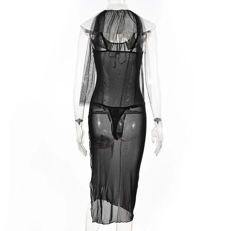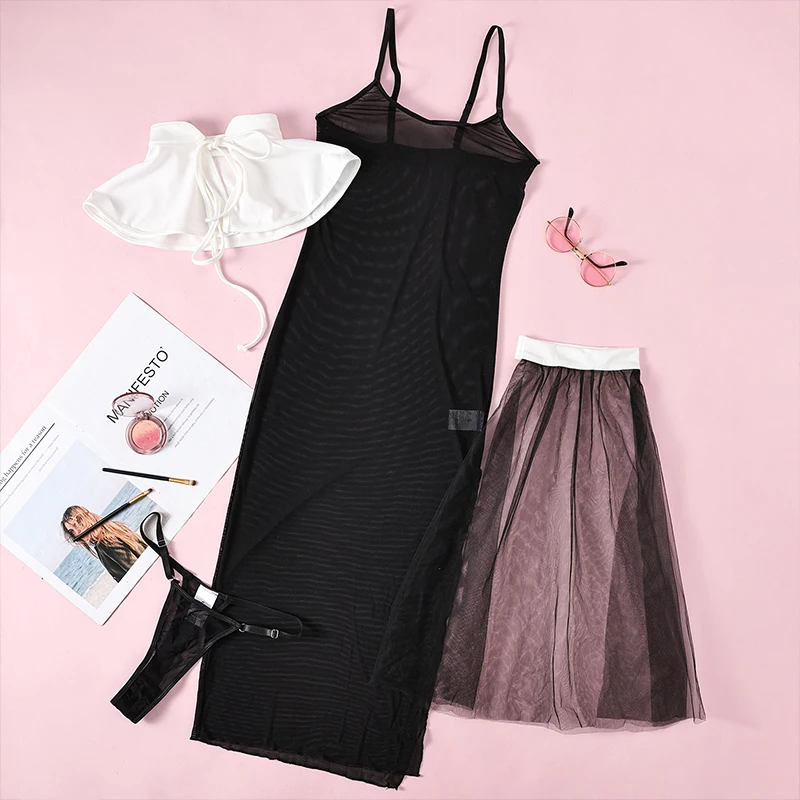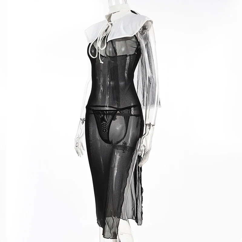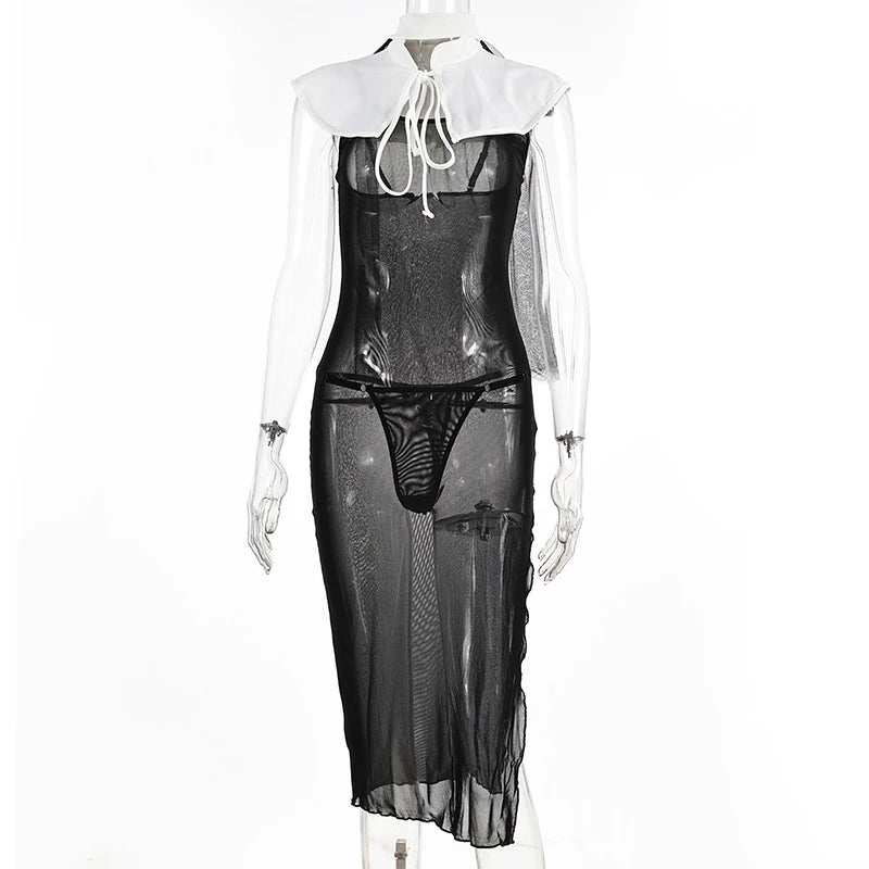 ADVBRIDGE - Halloween Mesh Temptation Set Women Sexy 4-pieces Erotic Cosplay Home Nightwear Headdress+White Shawl+G-thong+Sling Dresses
