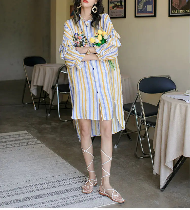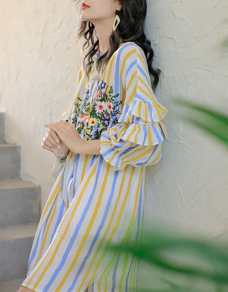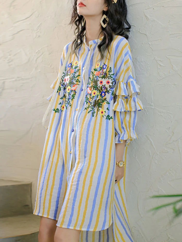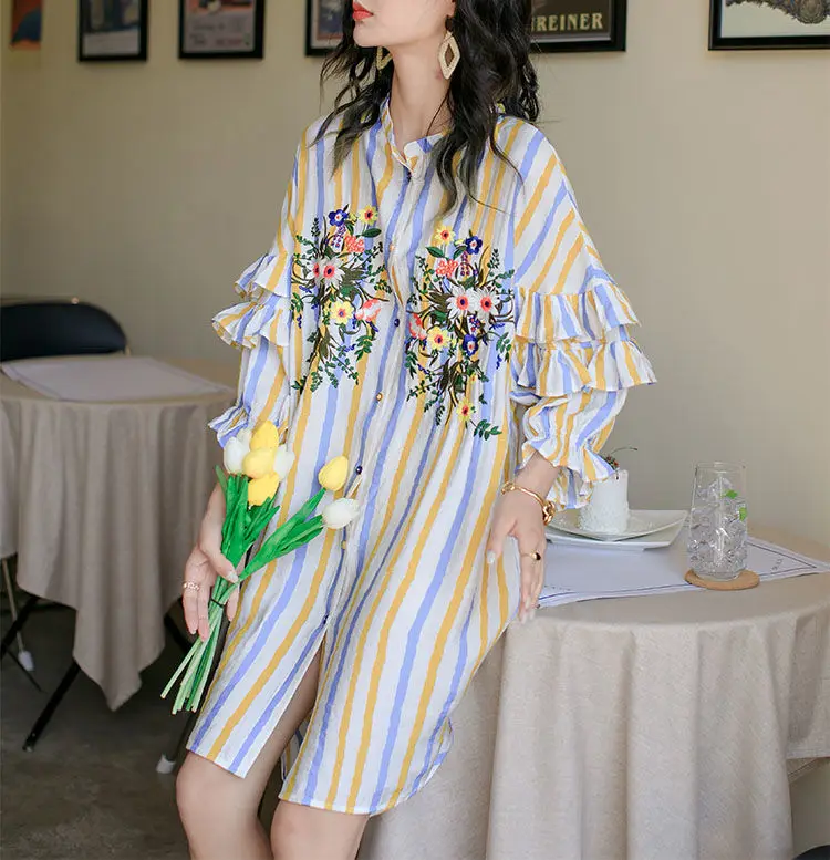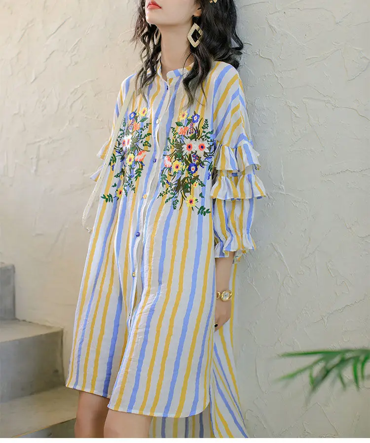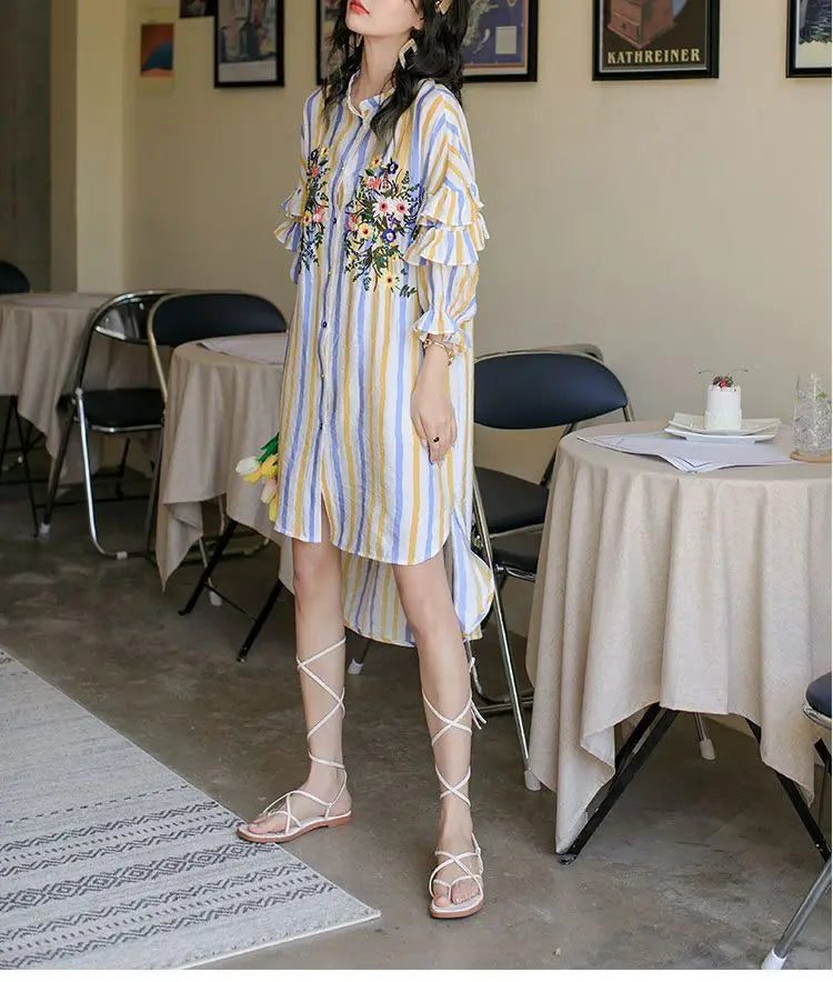 Advbridge Holiday Style Shirt Dress Embroidered Print Loose Dresses Women Irregular Stripes Top Korean Fashion Vestidos Para Mujer