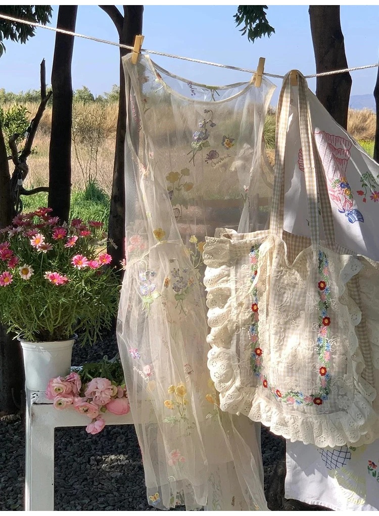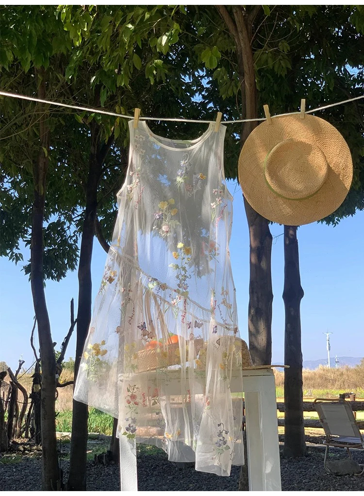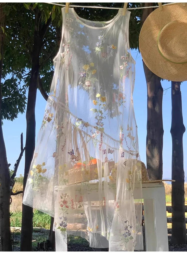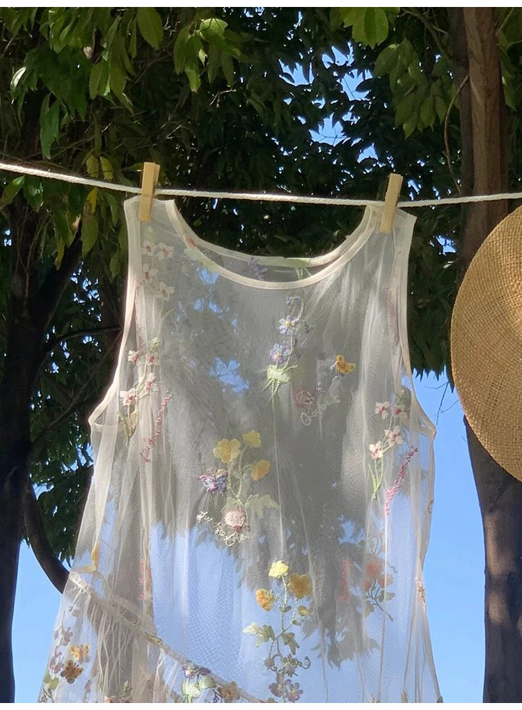 Advbridge Korean Mesh Embroidery Sleeveless Dress Women's Clothing Vestidos Summer Loose Fold Sundress Sweet Style Y2k Dresses