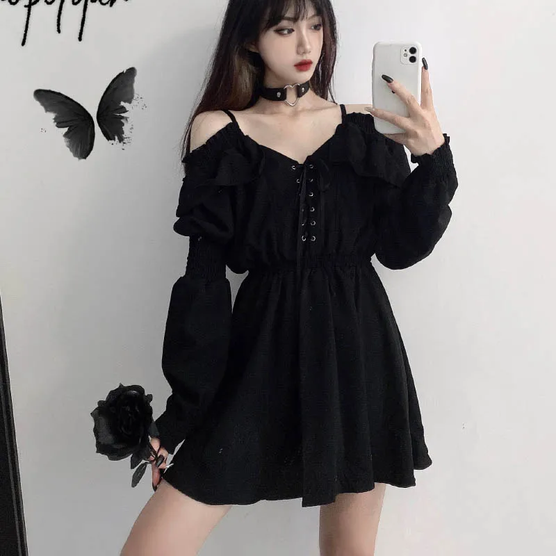 Advbridge Large Size Gothic Women Black Mini Dress Sexy Off Shoulder High Waist Tunic Ladies Party Dress Long Sleeve V Neck Vestidos