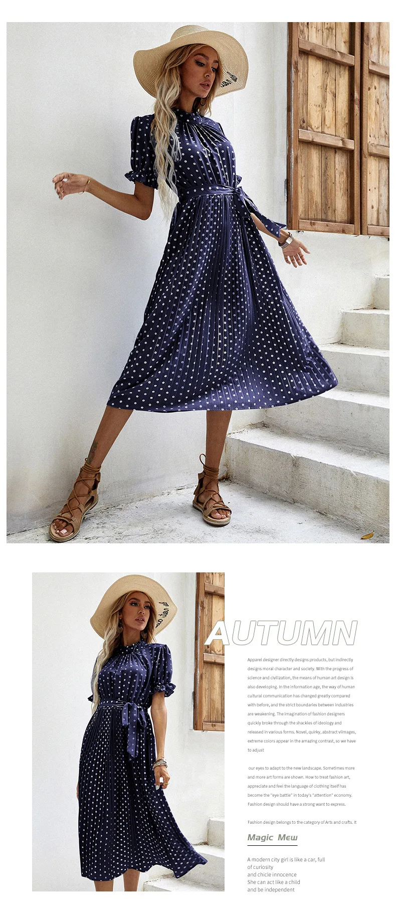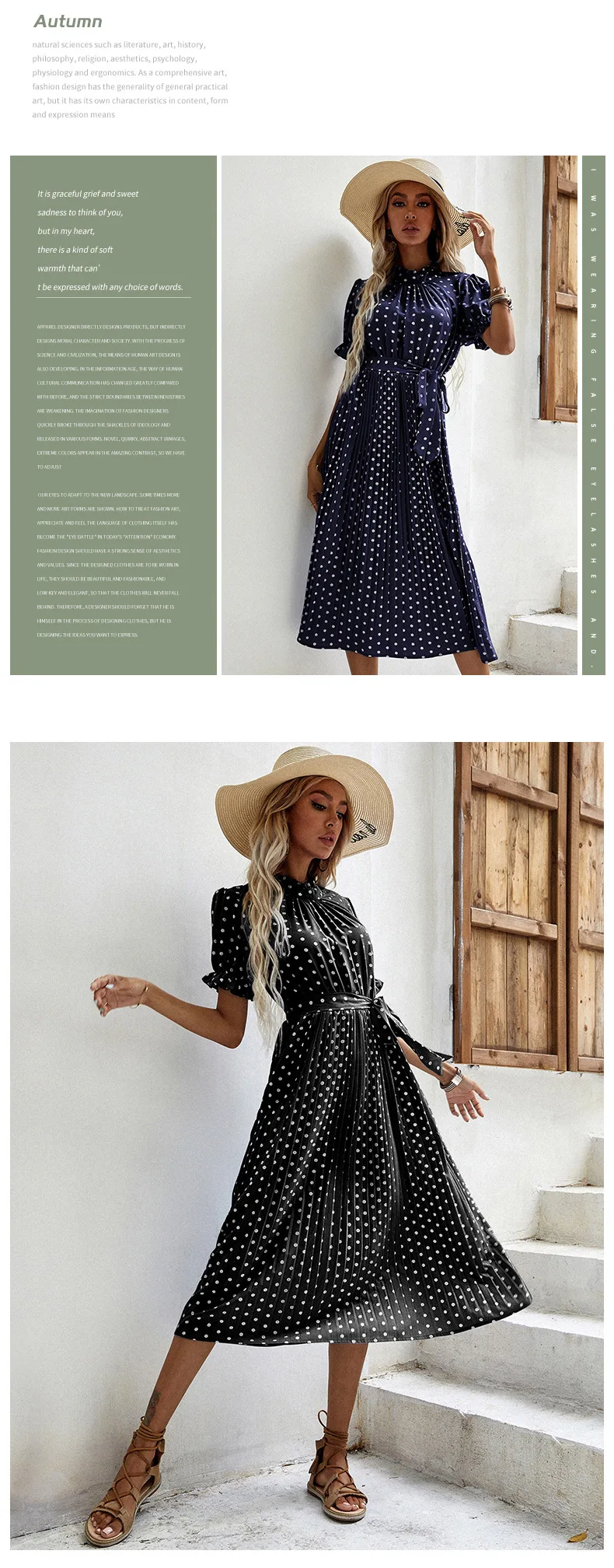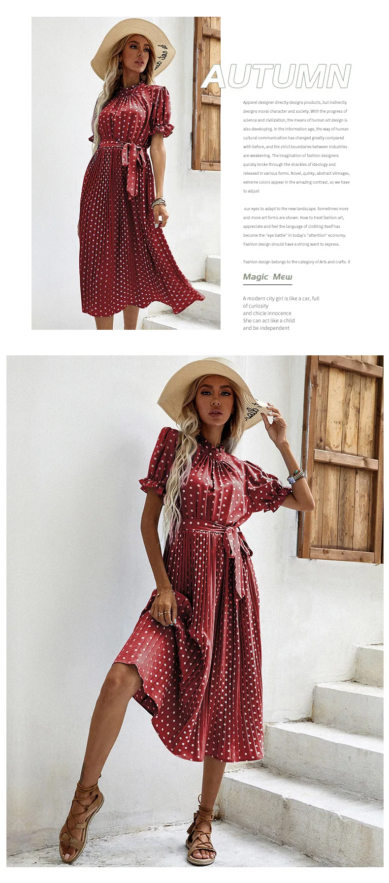 Advbridge New Women's Short-sleeved Polka-dot Pleated Dress Round Neck Tie-up Elegant Dresses for Women Flare Sleeve Summer Dress