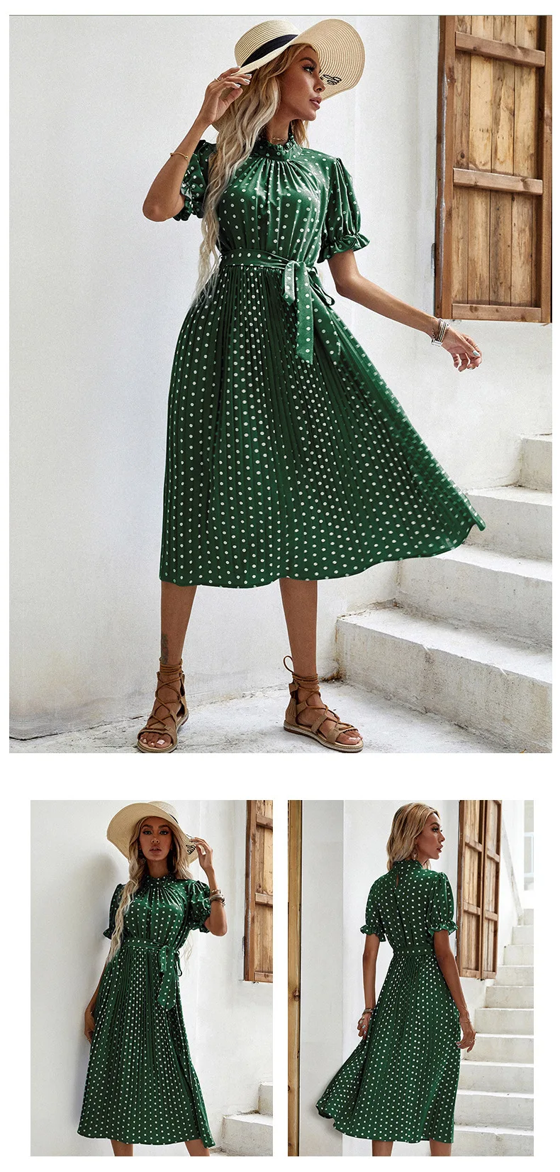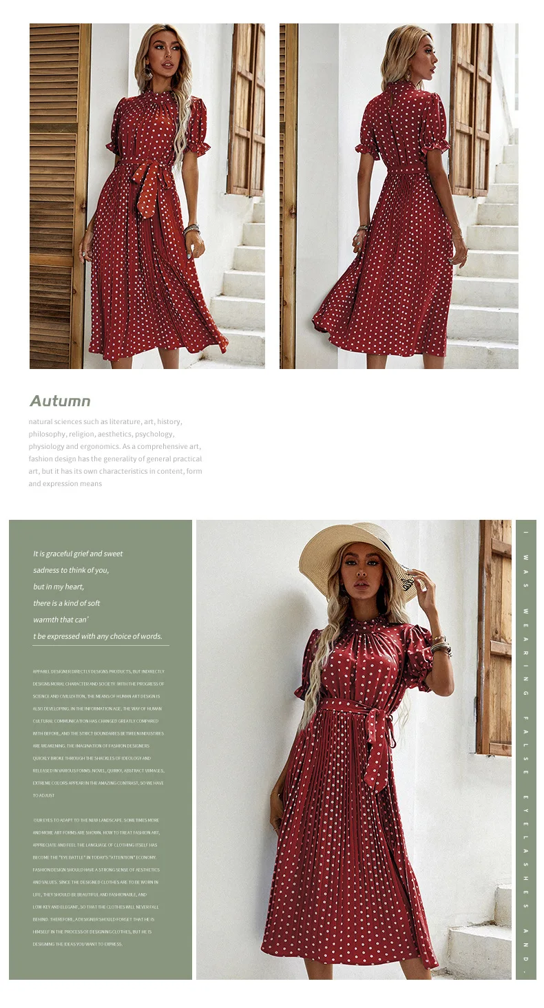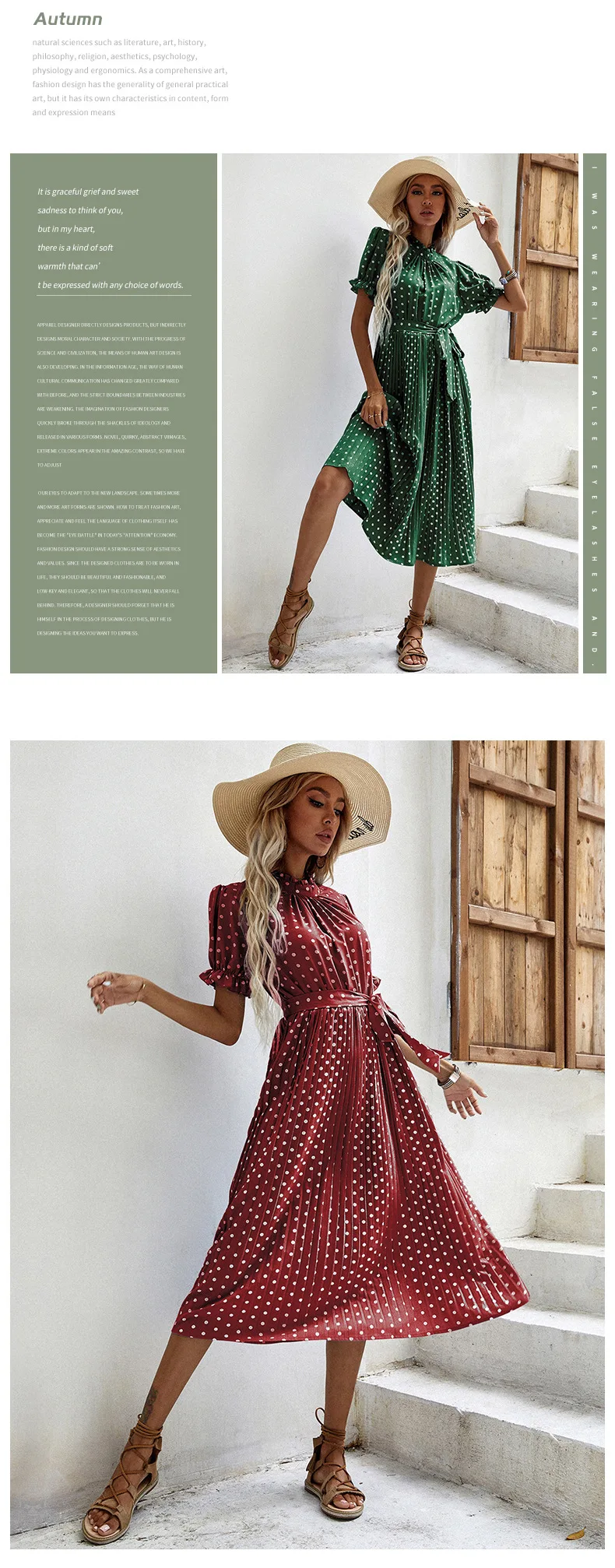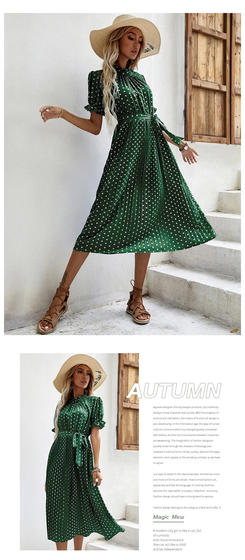 Advbridge New Women's Short-sleeved Polka-dot Pleated Dress Round Neck Tie-up Elegant Dresses for Women Flare Sleeve Summer Dress