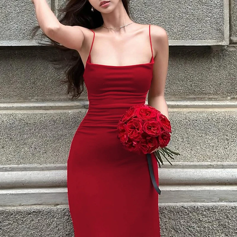 ADVBRIDGE - Party Club Spaghetti Strap Temperament Long Dress Women Simple Criss-cross Solid Color Sleeveless Open Back Sheath Vestidos