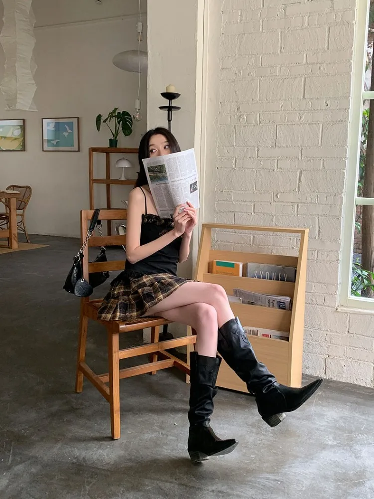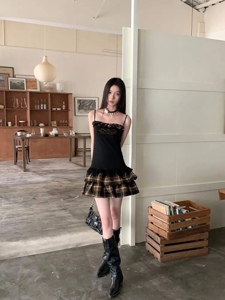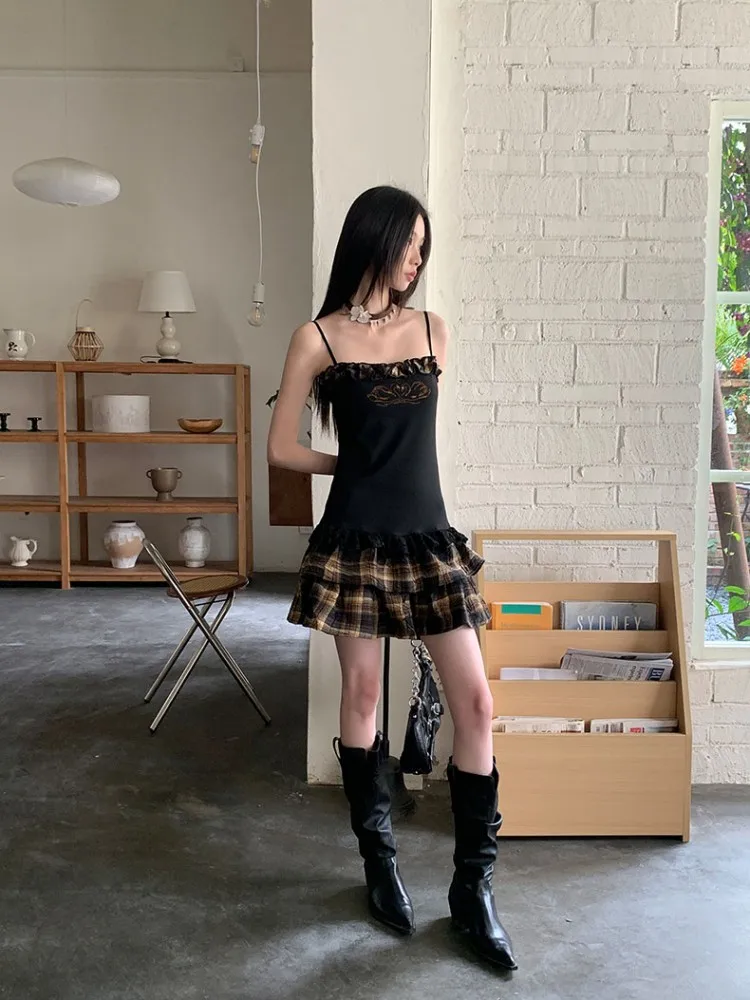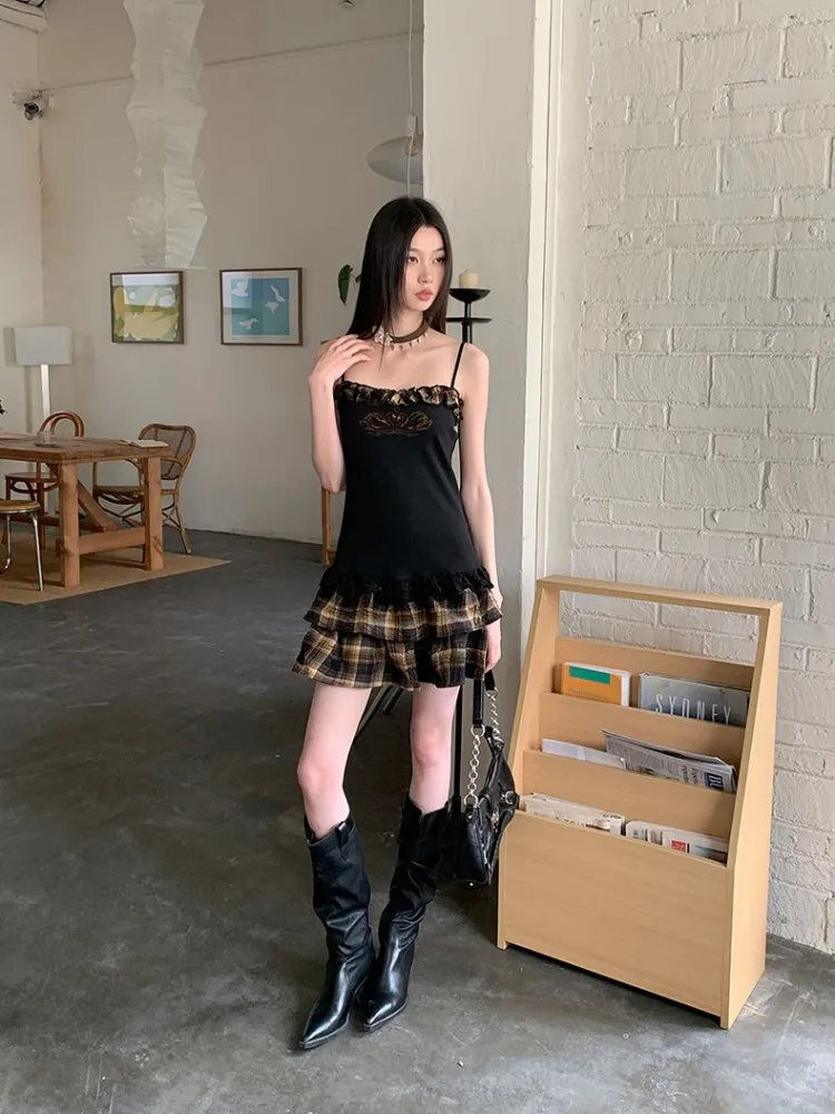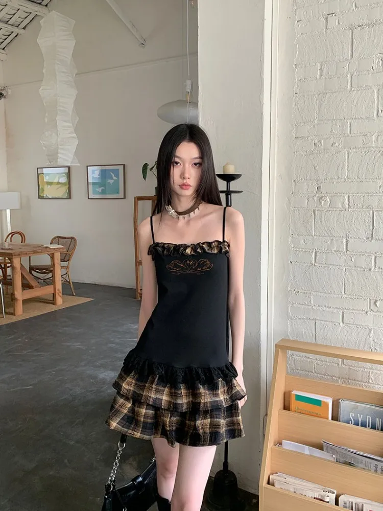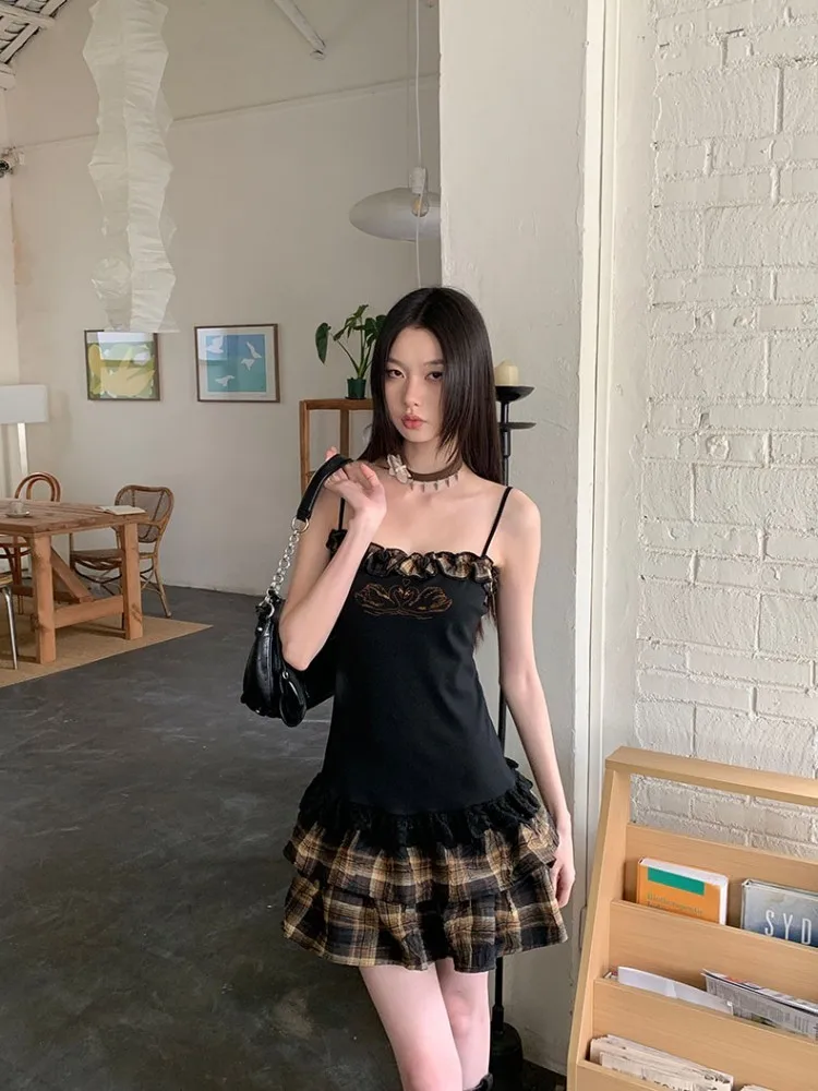 Advbridge Retro Embroidered Camisole Dress For Women'S Summer New Ballet Plaid A-Line Bra Chic Slim Fit Dress