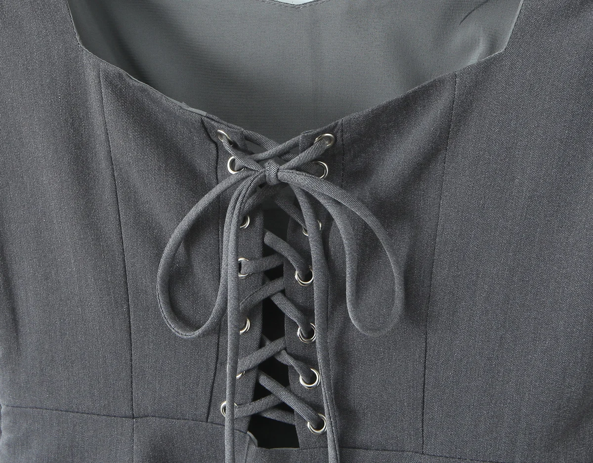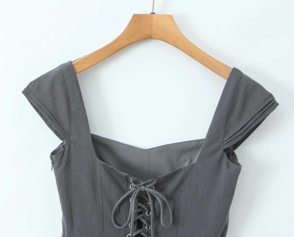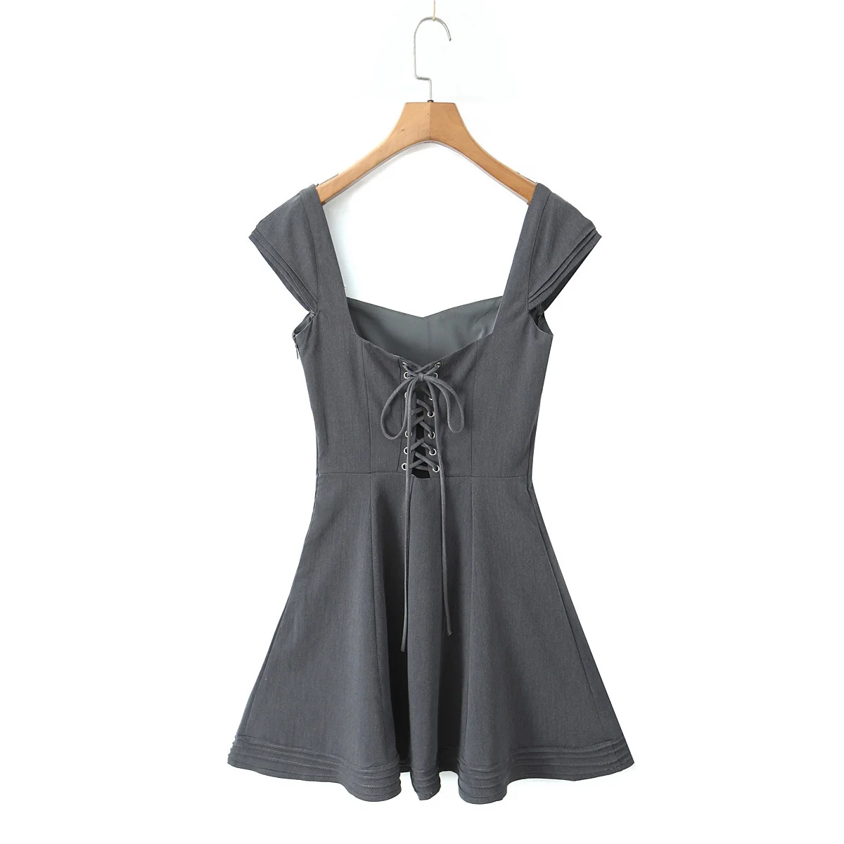 Advbridge Retro French Gray V Low Chest Bodycoon Corset style Mini Dress Women Cross Lacing up Back Short Sleeve A-line Party Robe Summer