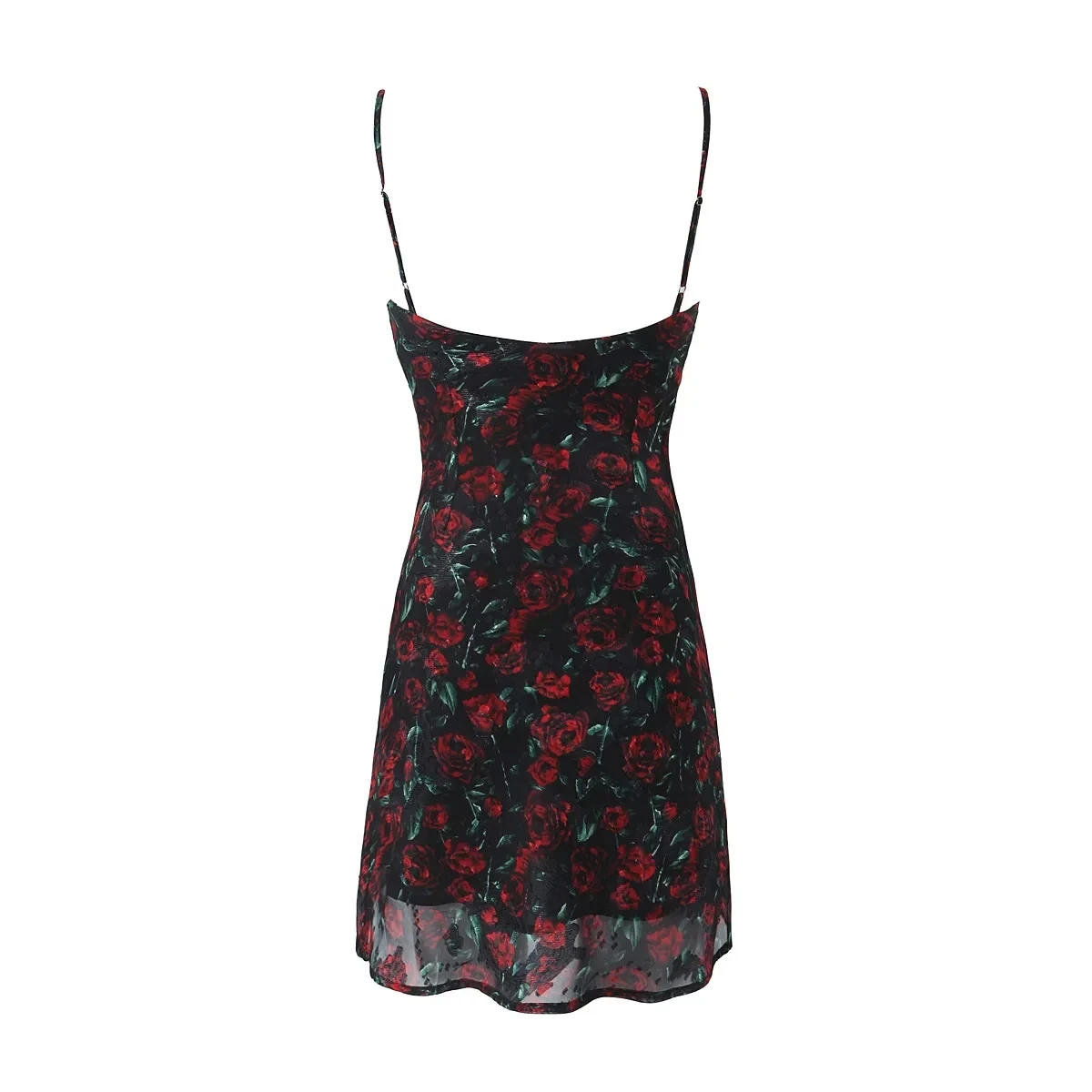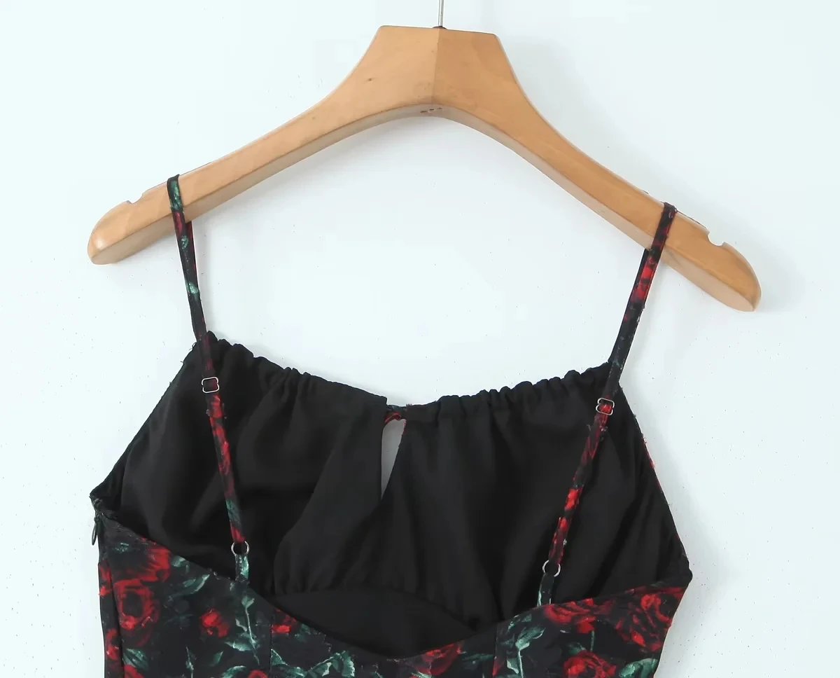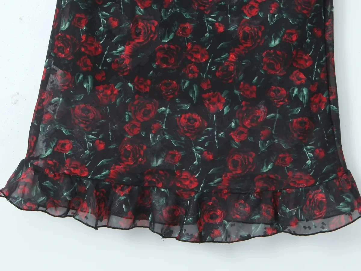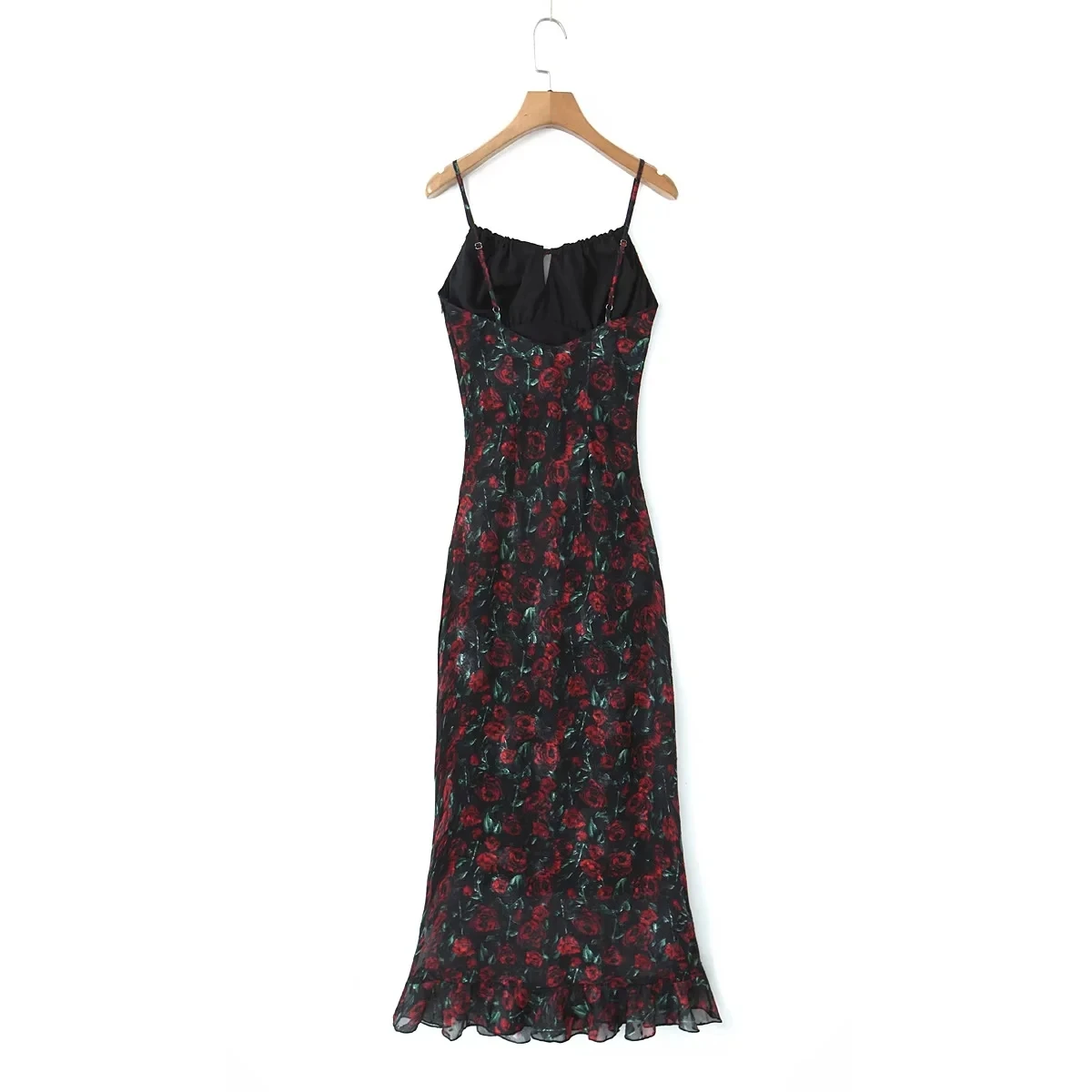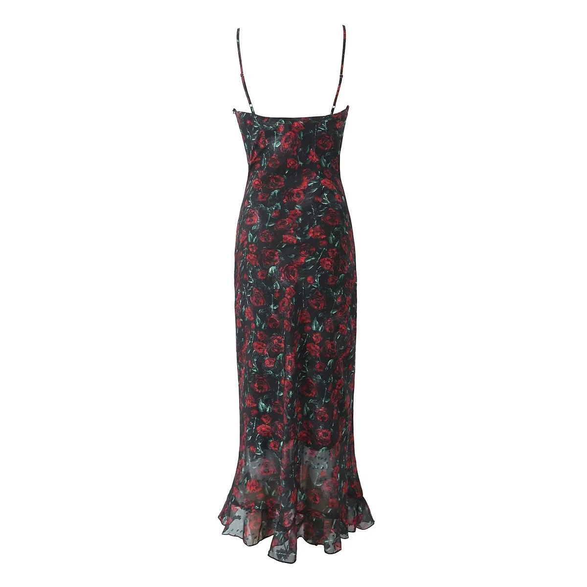 Advbridge Rose Red Flower Printed Black Bodycon Summer Dress Women 2024 Beach Boho Maxi Slip Sundress Ruffles Sleeveless Long Floral Dress