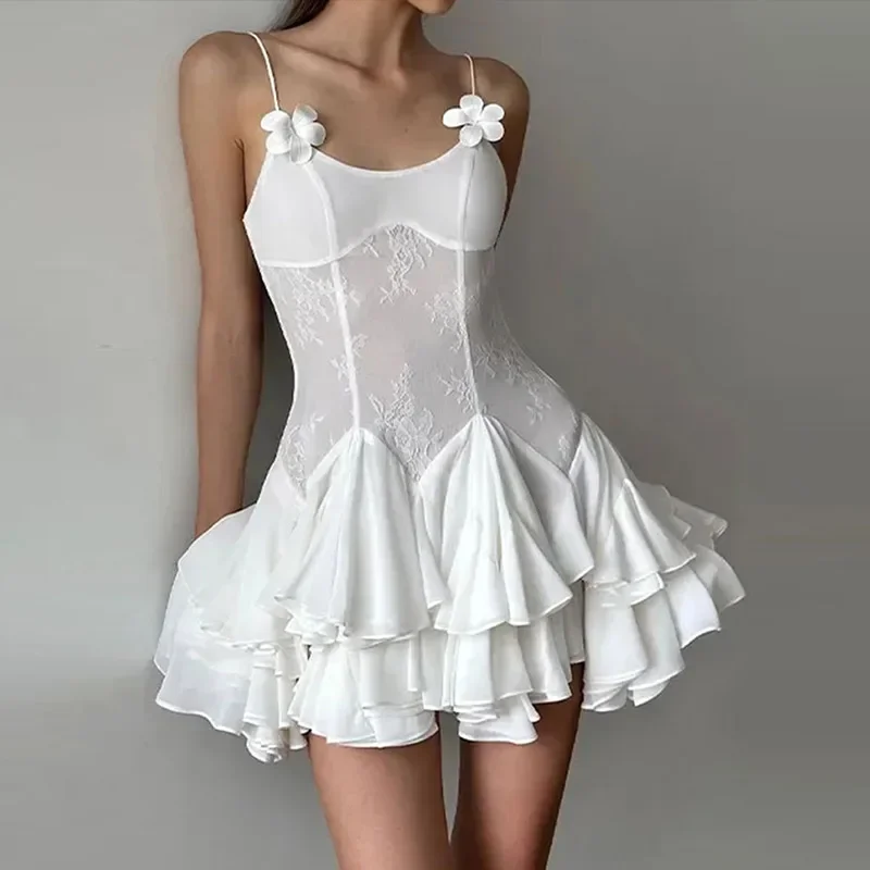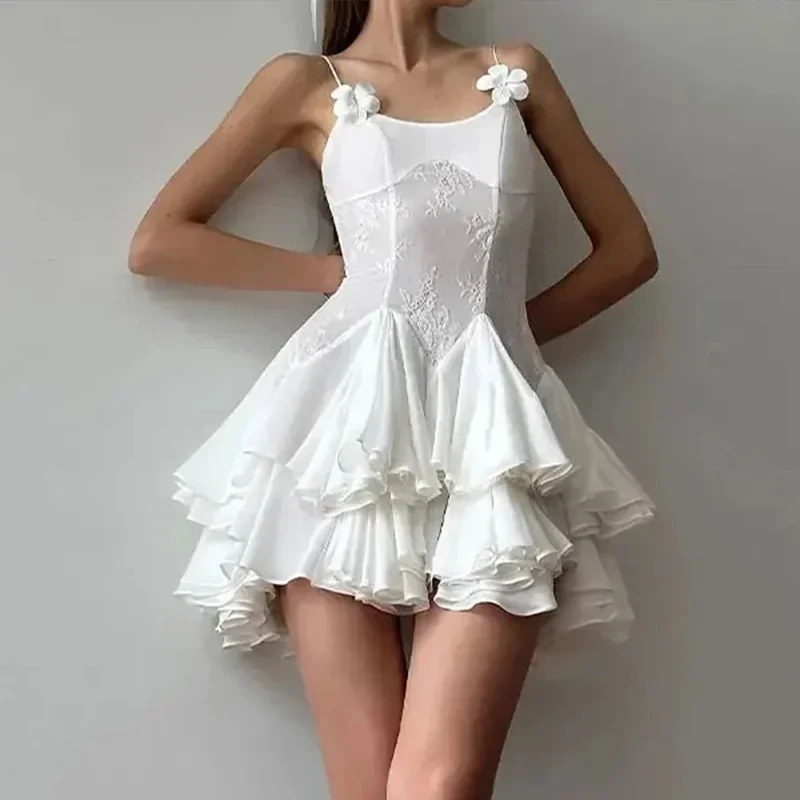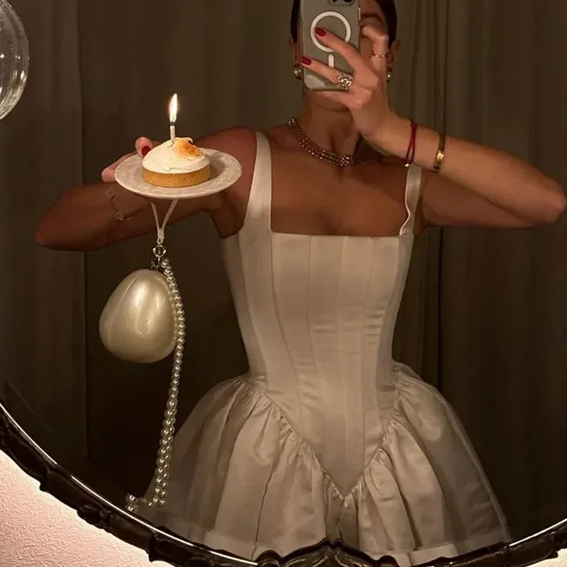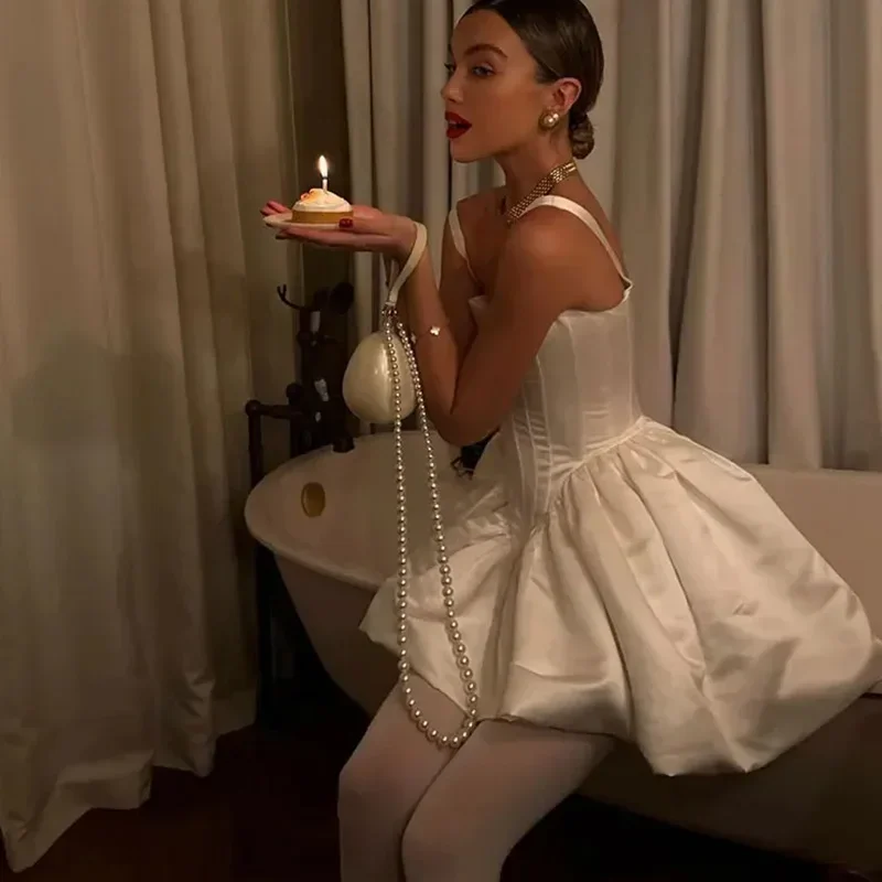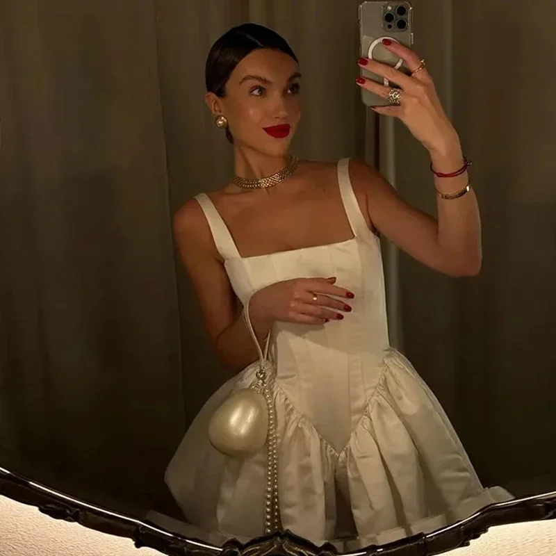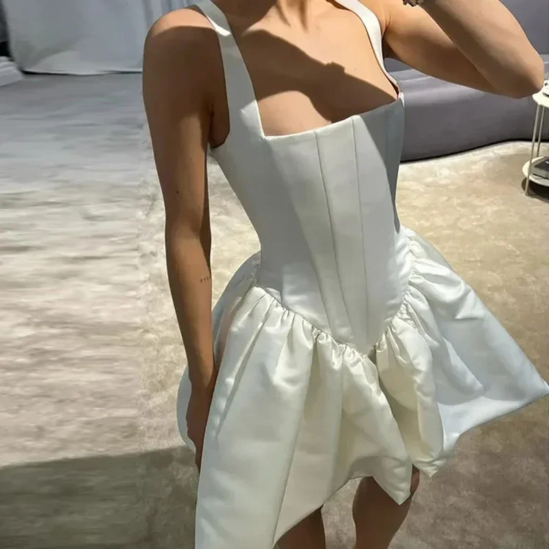 Advbridge Satin Mini White Dress Women Spaghetti Strap Ruffles Backless Pleated A-line Dresses 2024 Summer Banquet Evening Party Looks