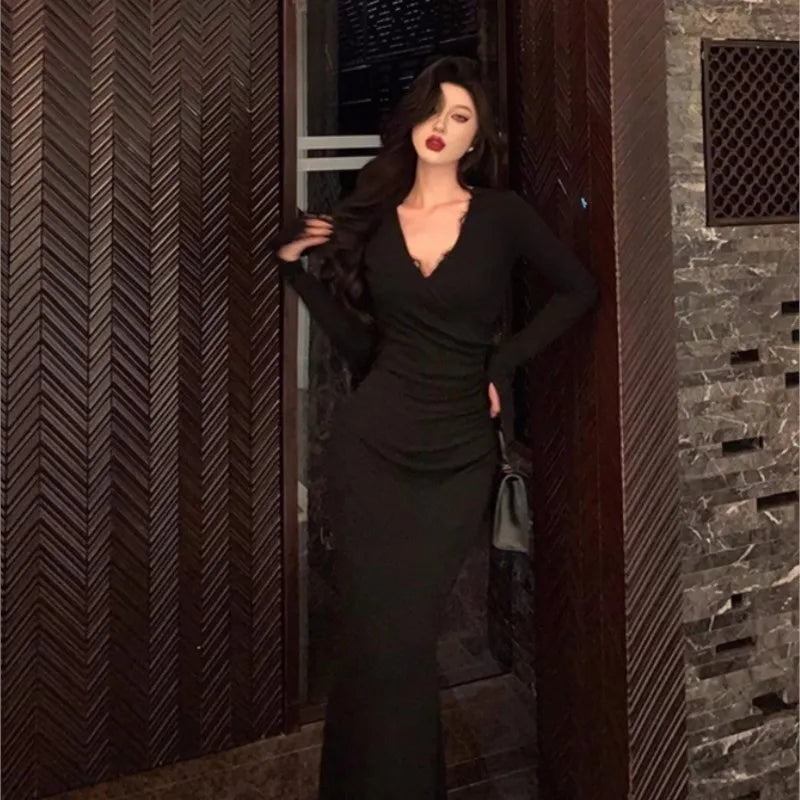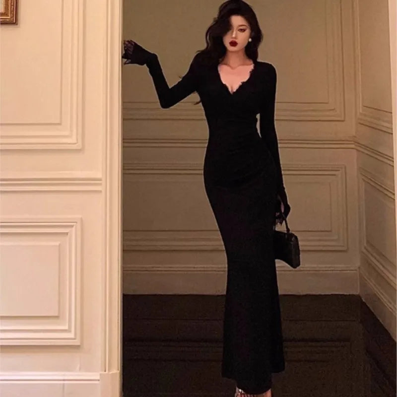 Advbridge Sexy Bodycon Black Lace Maxi Dresses for Women Flare Sleeve V-neck Slim Mermaid Evening Party Dress Prom Robe Fishtail Vestidos