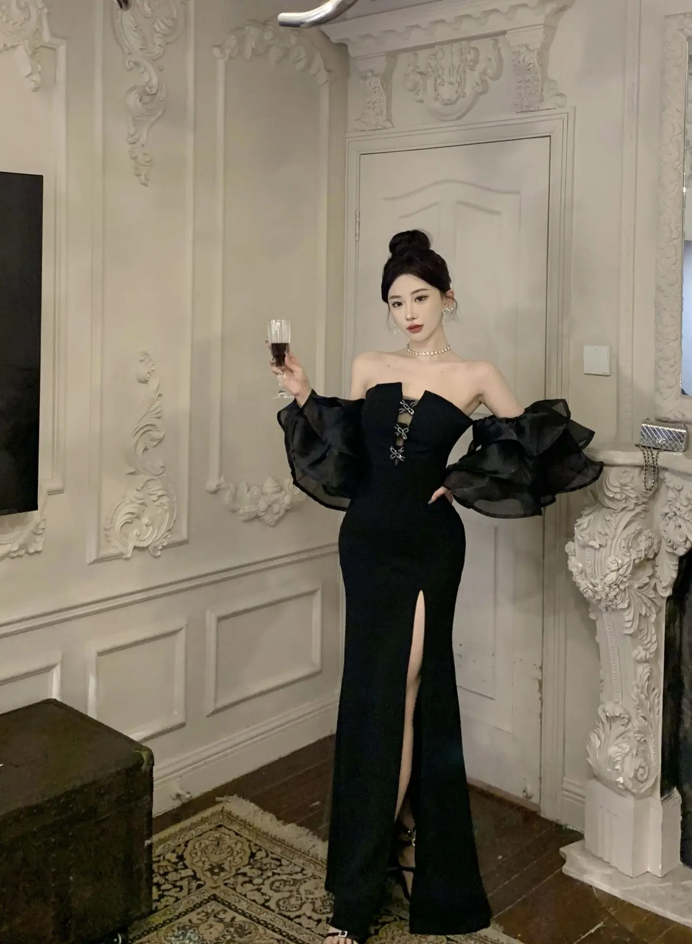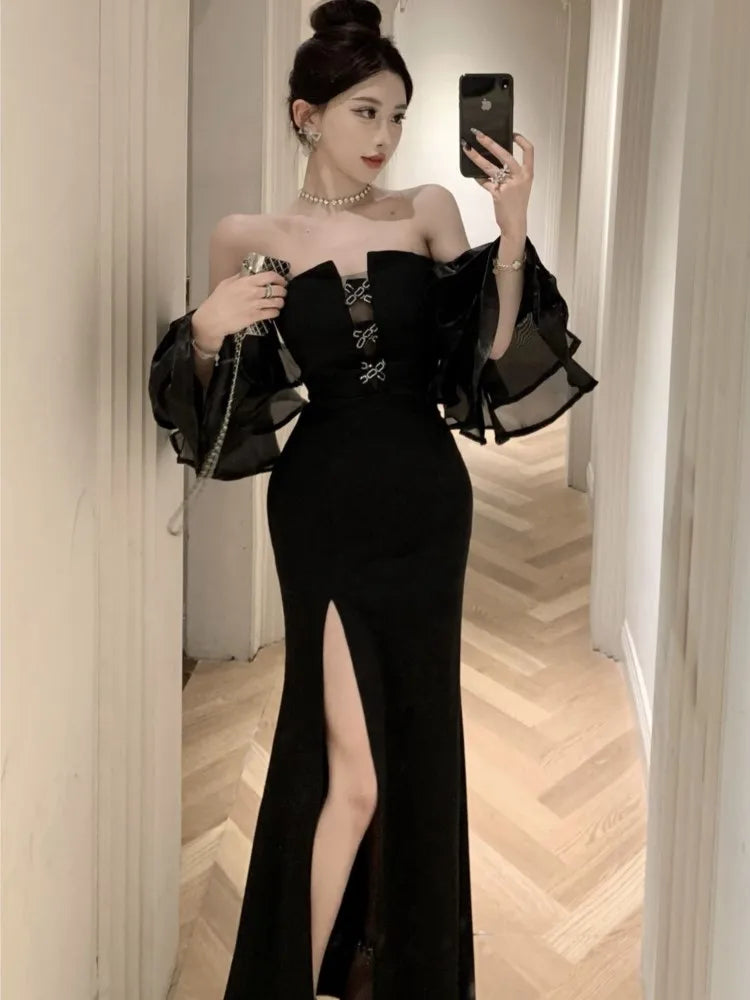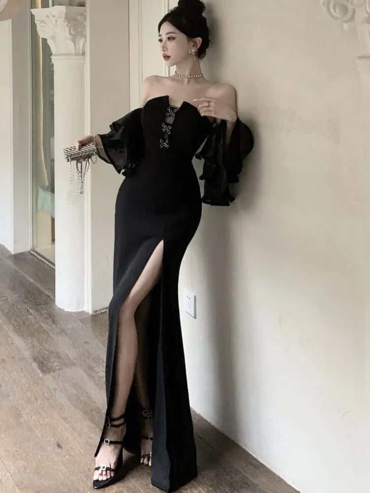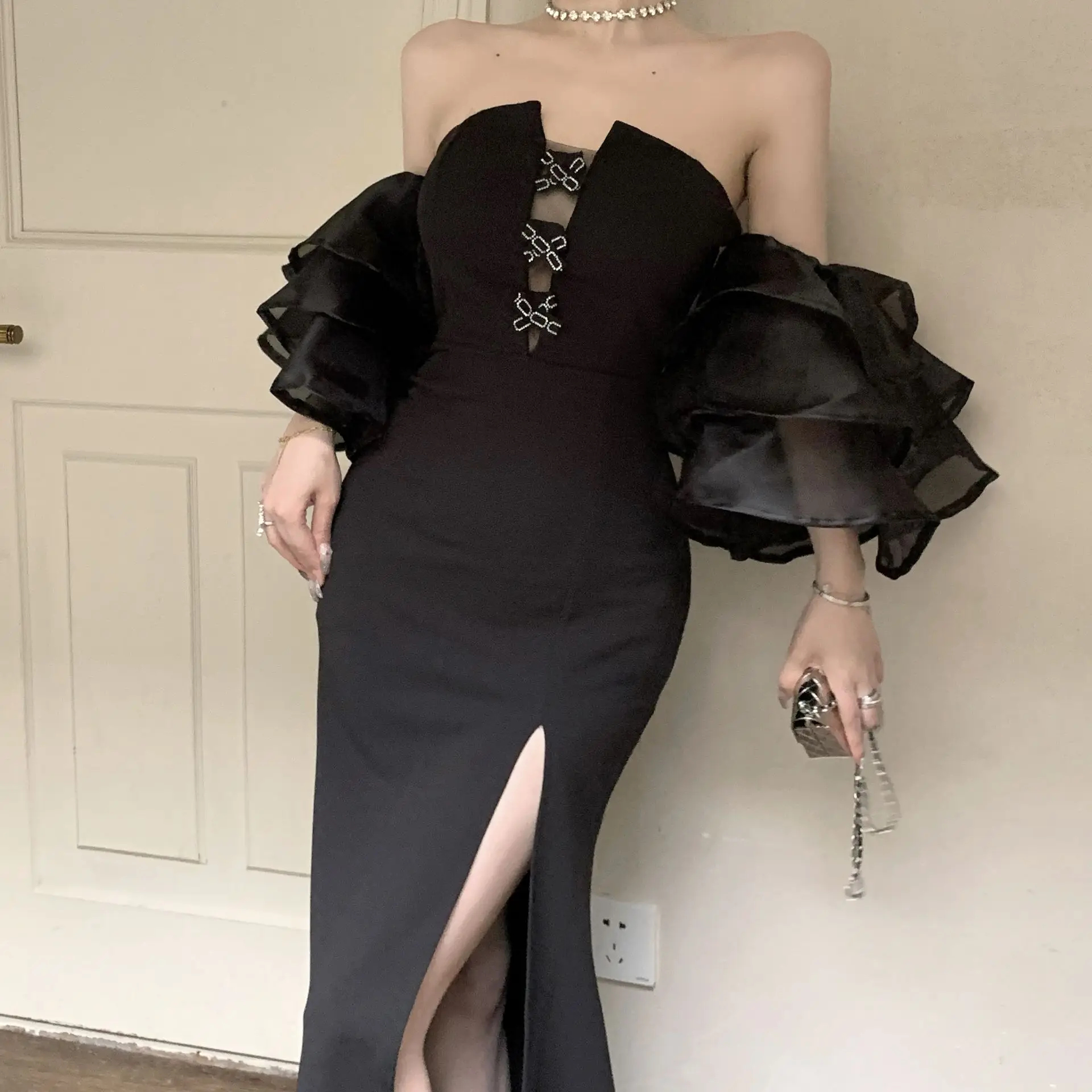 Advbridge Sexy Bodycon Evening Party Dresses for Women Ruffles Strapless High Split Black Mermaid Korean Fashion Prom Robe Vestidos New