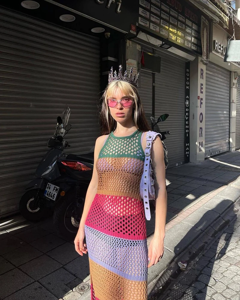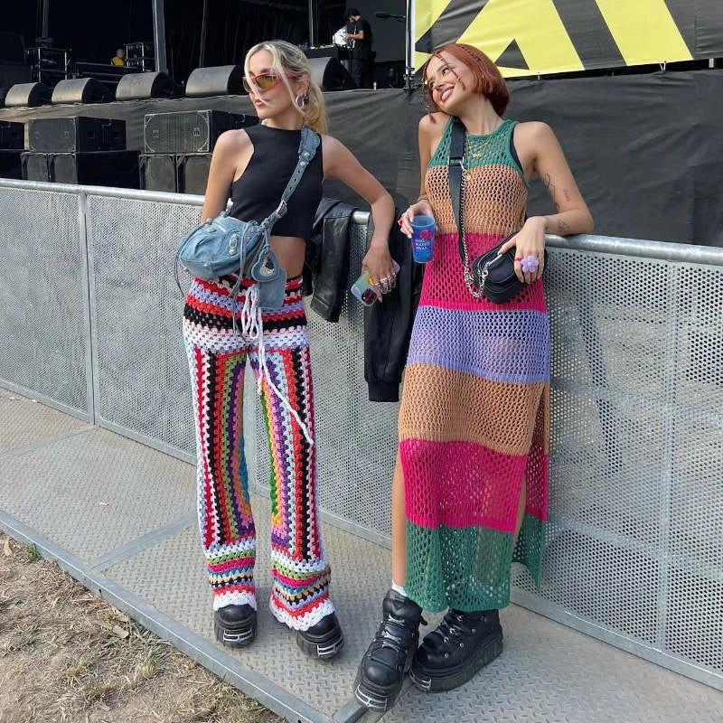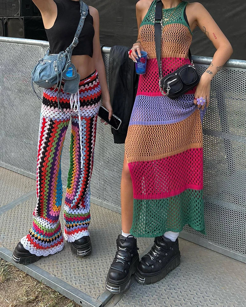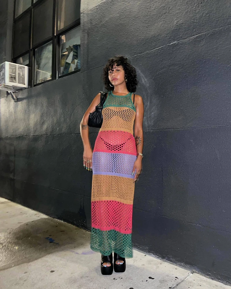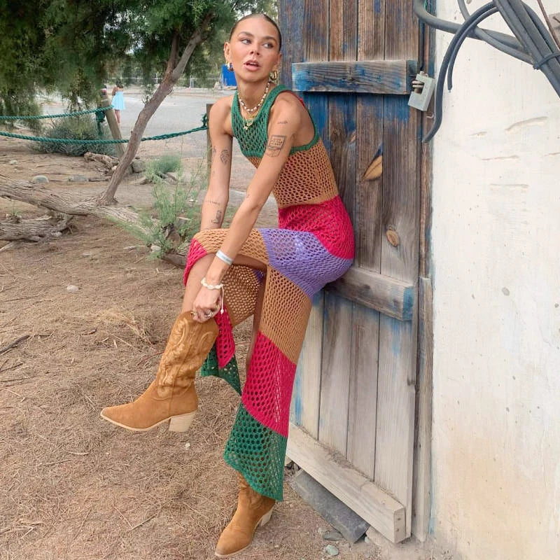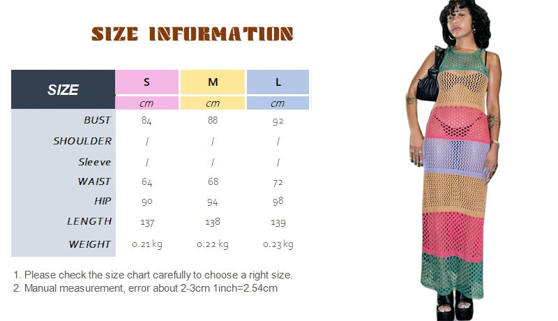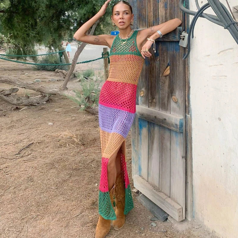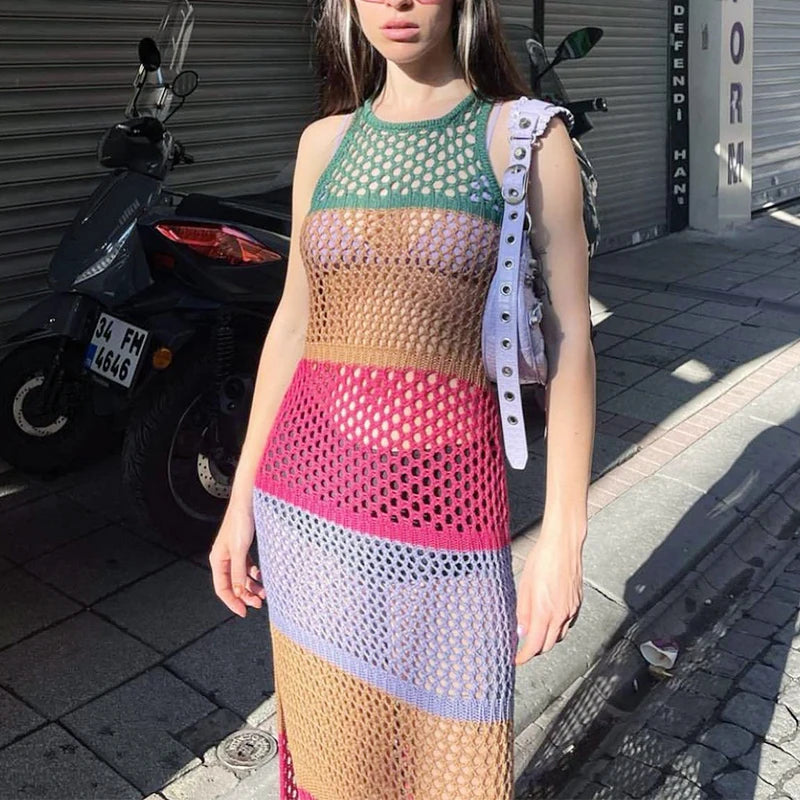 ADVBRIDGE  - Sexy See Through Knitted Dress Fashion Women Sleeveless Tank Mix Dresses Female Patchwork Elegant Beach Holiday Long Robes