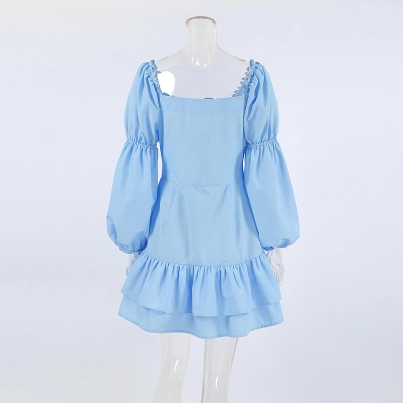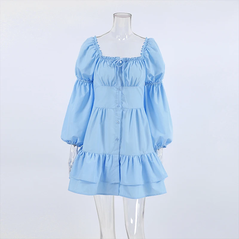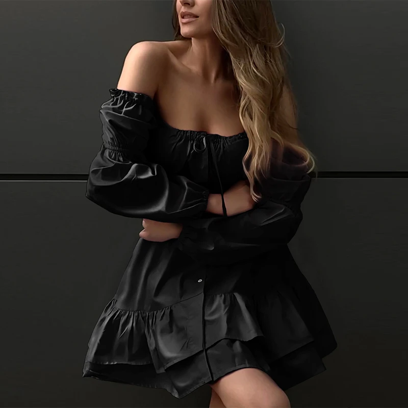 Advbridge Sexy Tie-up Hollow Party Dress Women Elegant Off Shoulder Ruffle Mini Dress Sweet New Solid Long Sleeves Buttoned Beach Dress
