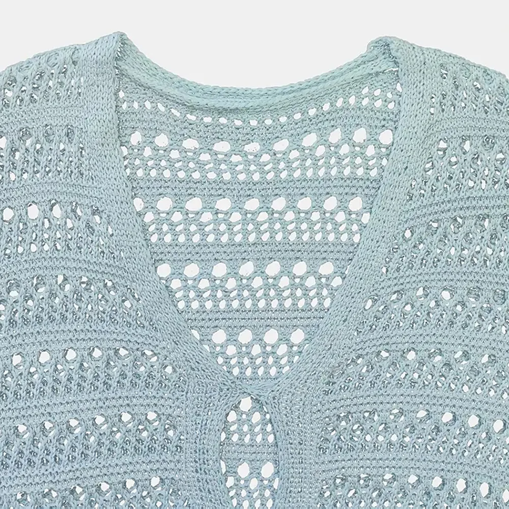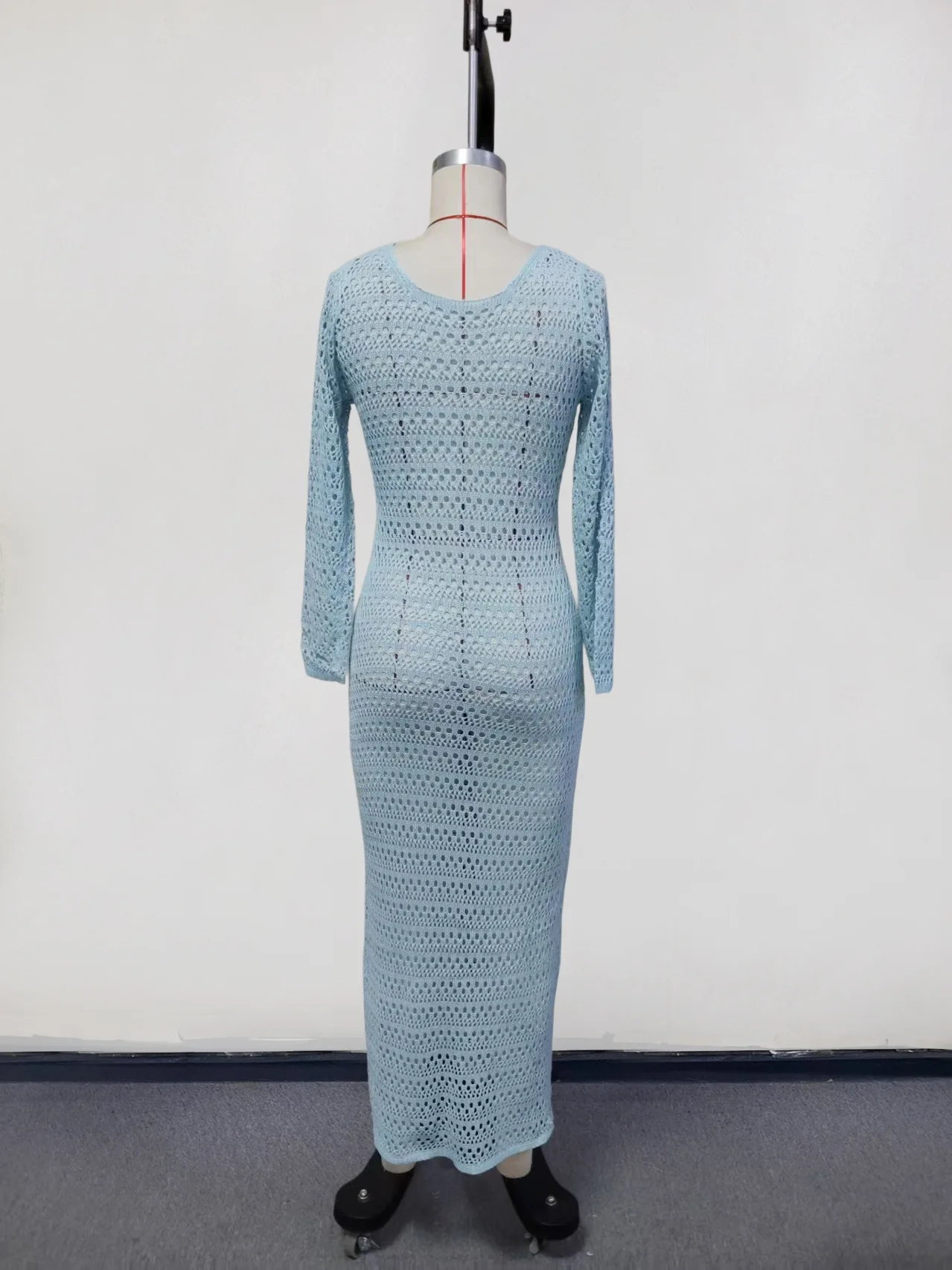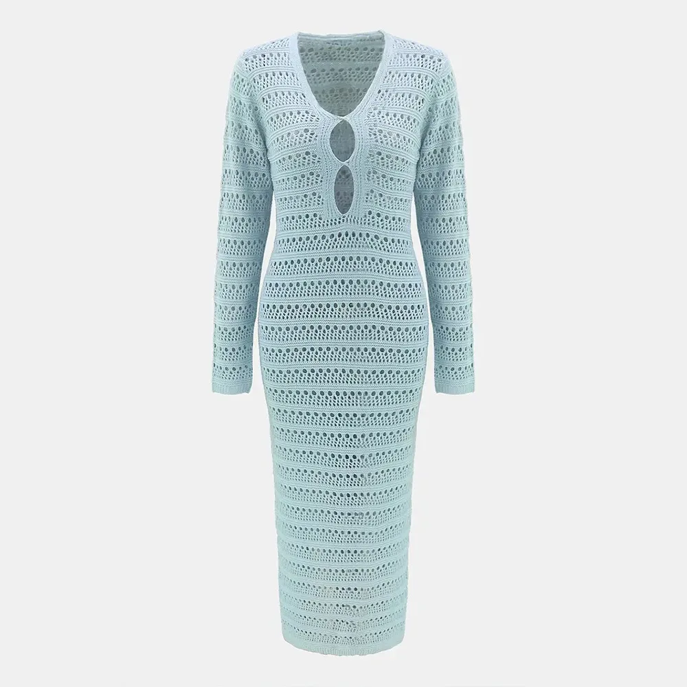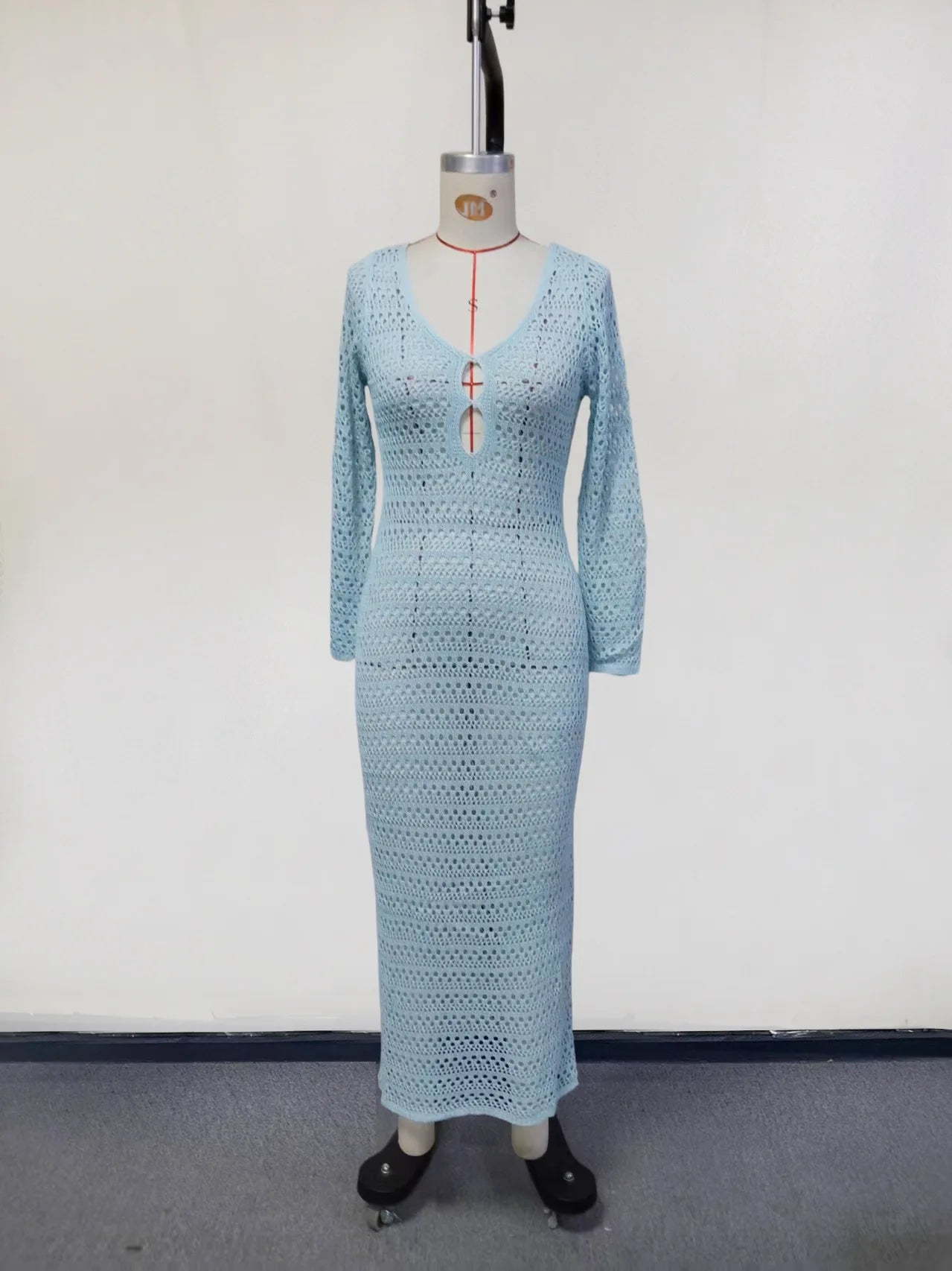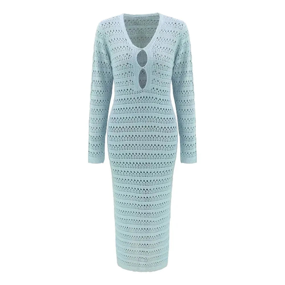 ADVBRIDGE - Sexy Women Solid Long Knit Sleeve Bikin Fashion Cover up Female See-Through Deep V-Neck Hollow-Out Beach Knitwear Maxi Dress