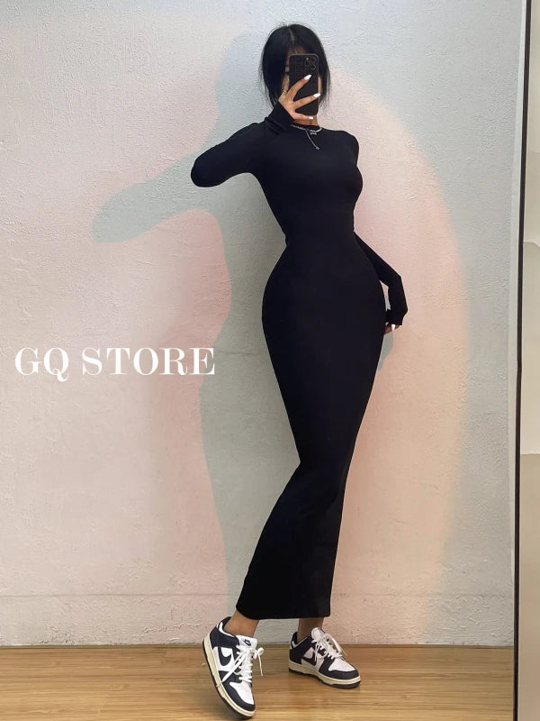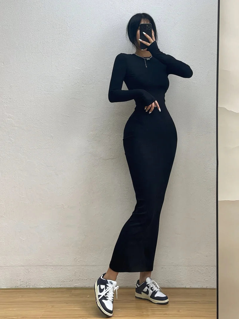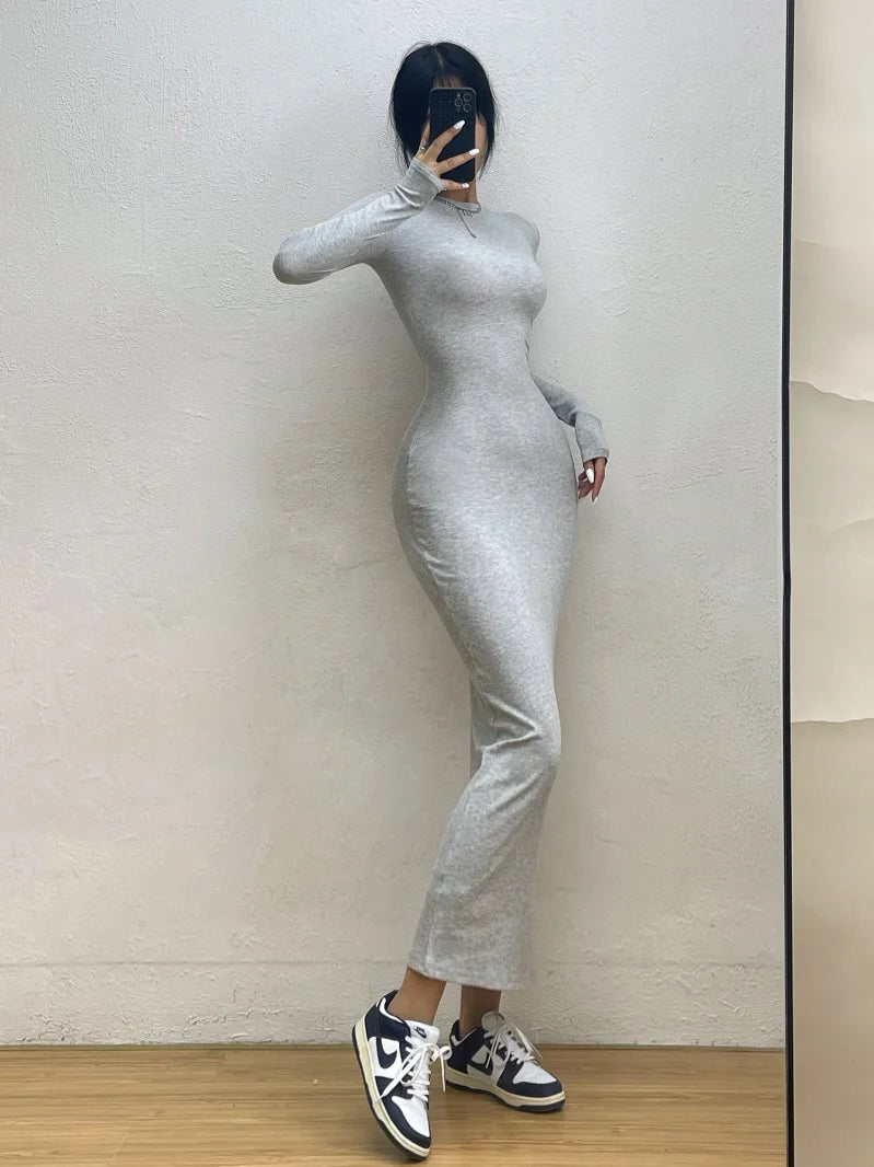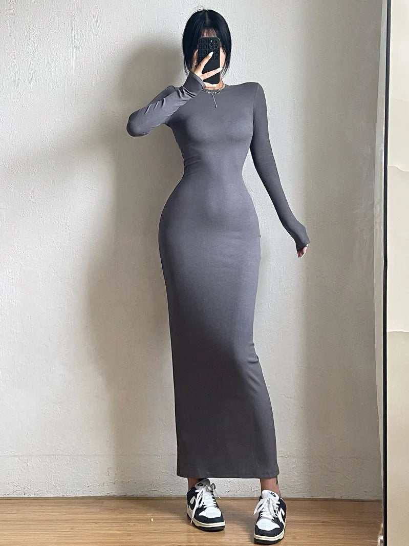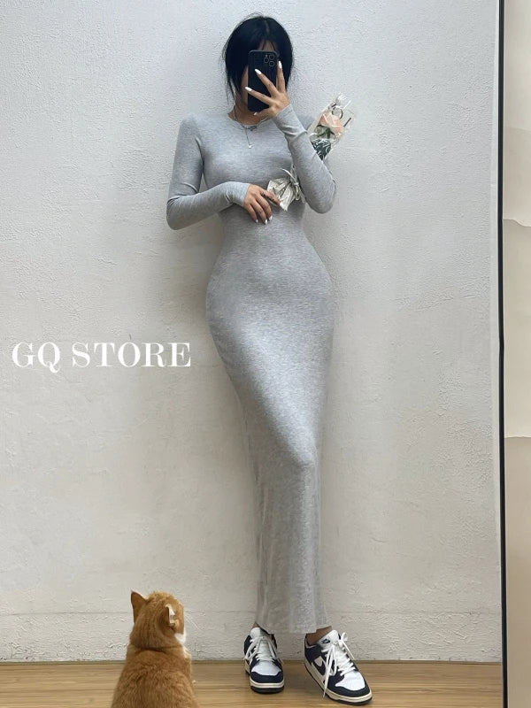 Advbridge Simple Maxi Long Dress Round Neck Long Sleeve Tight Slim Maxi Dresses Elegant Fashion Korean Women Robe DEH8