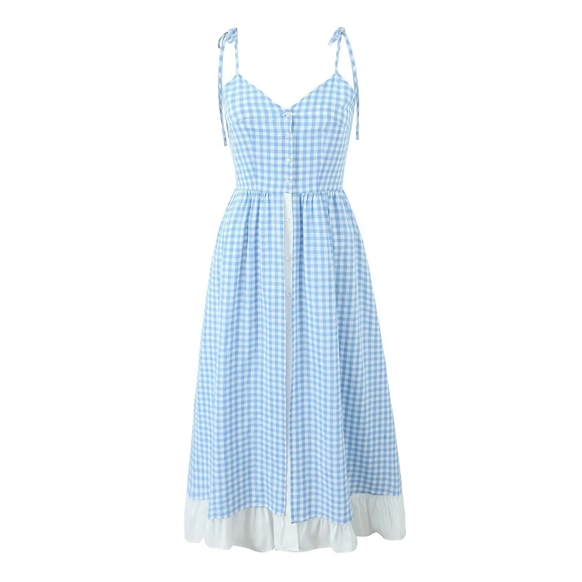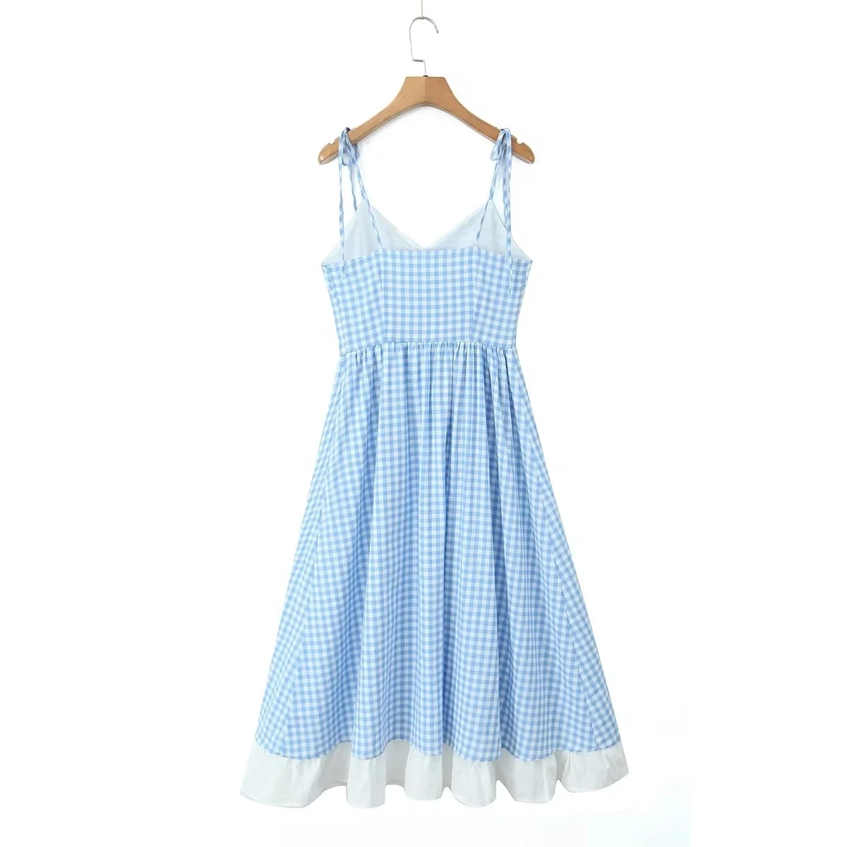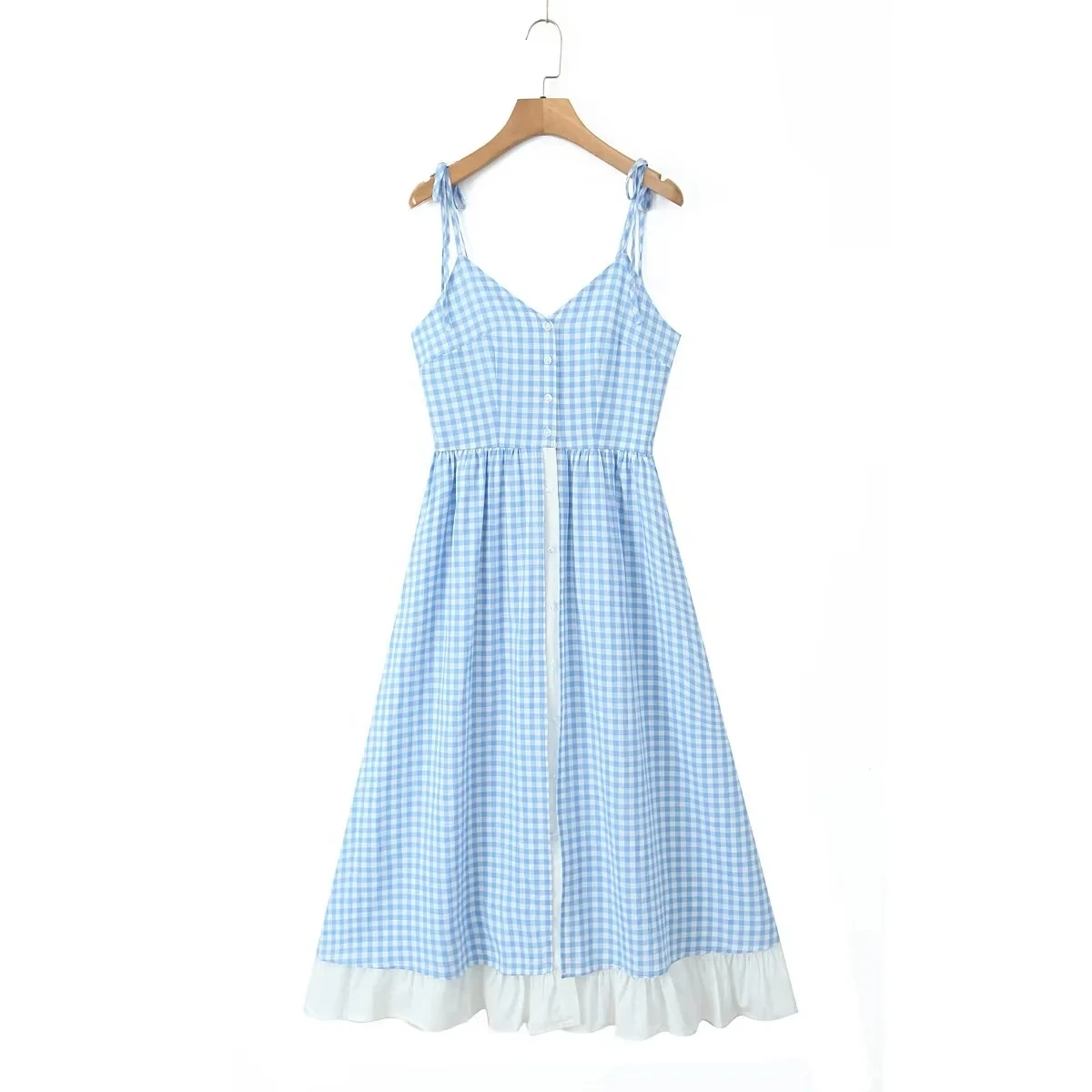 Advbridge Single Breasted Plaid Blue Summer Women Dress Spaghetti Strap Midi Casual Female Vestidos 2024 Cotton Slip Dress New