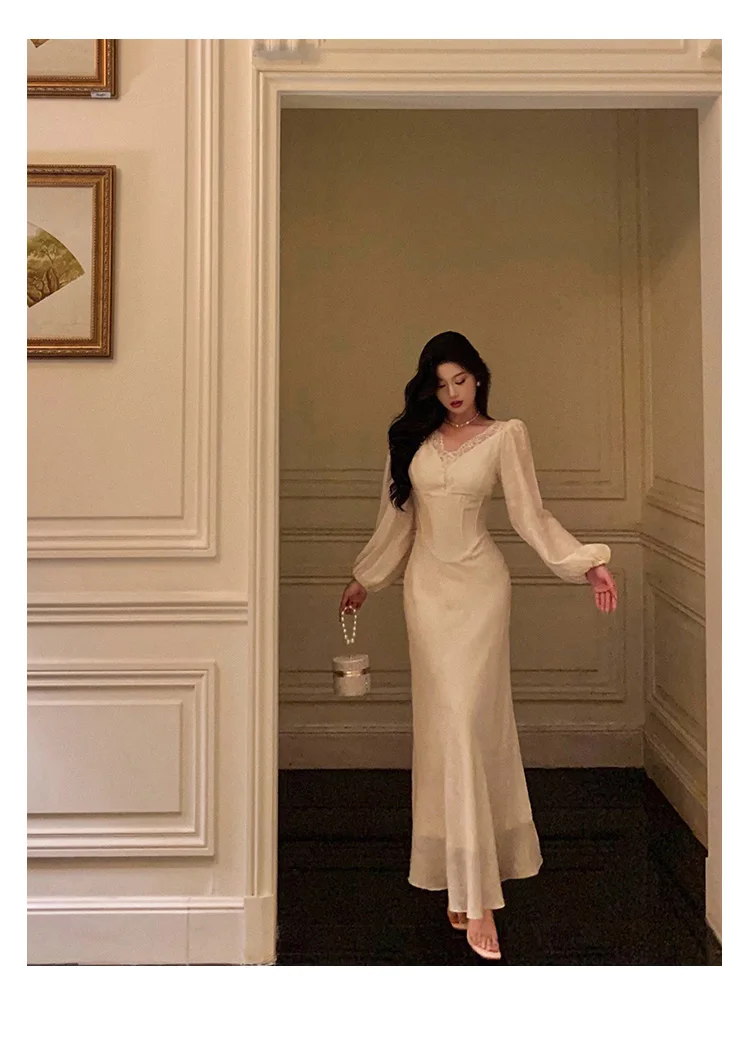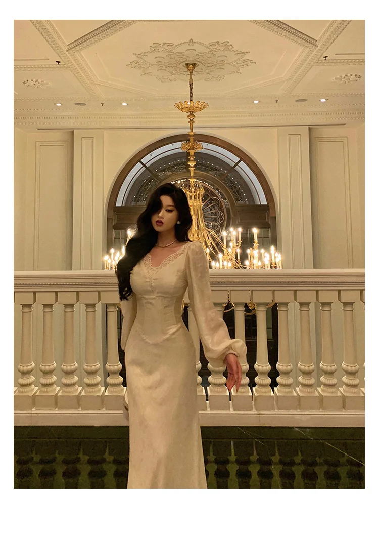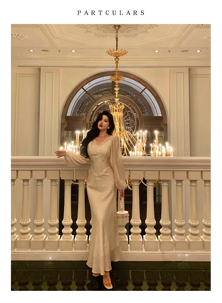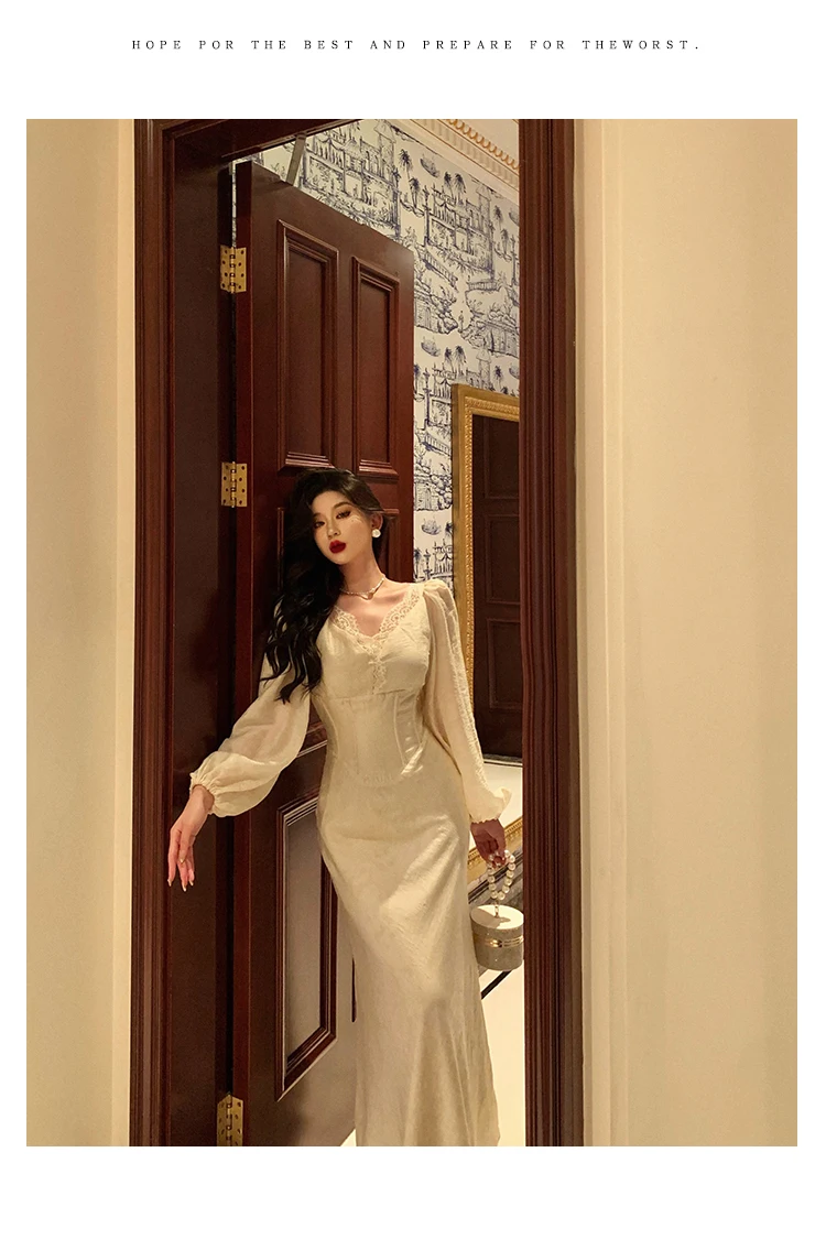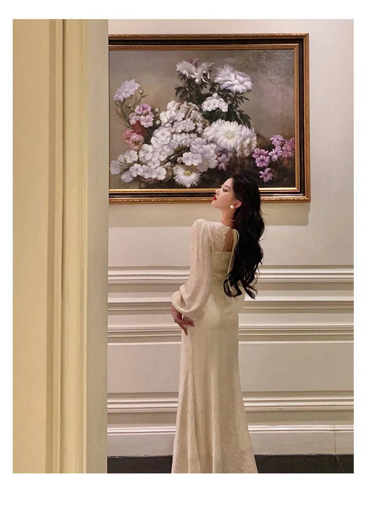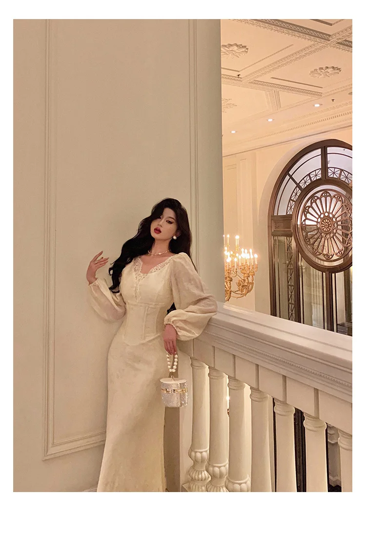 Advbridge Spring Women New Vintage Elegant Slim Lace Dress Long Puff Sleeve Backless Clothing French Vintage Evening Party Robe