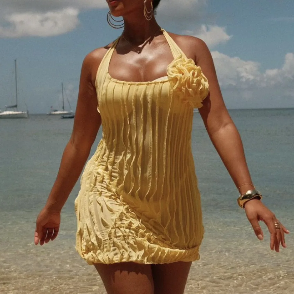 Advbridge Spring Yellow Sexy Fold Mini Dress for Women Elegant Halter Sleeveless Bodycon Beach Dress Fashion Floral Backless Dress 2025