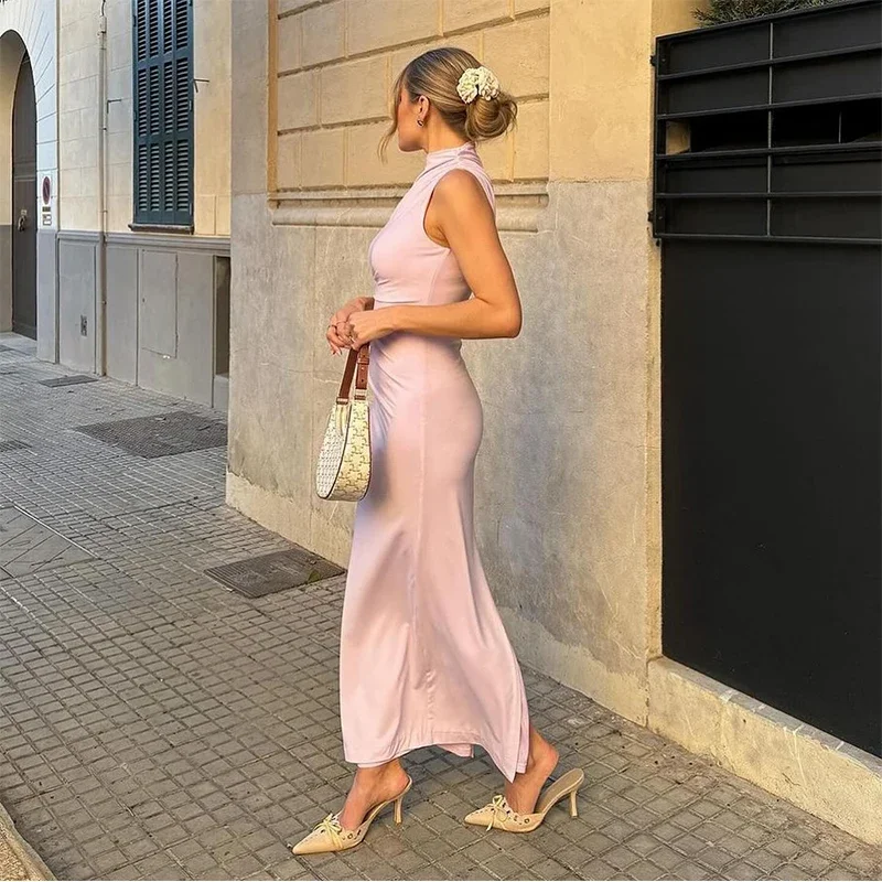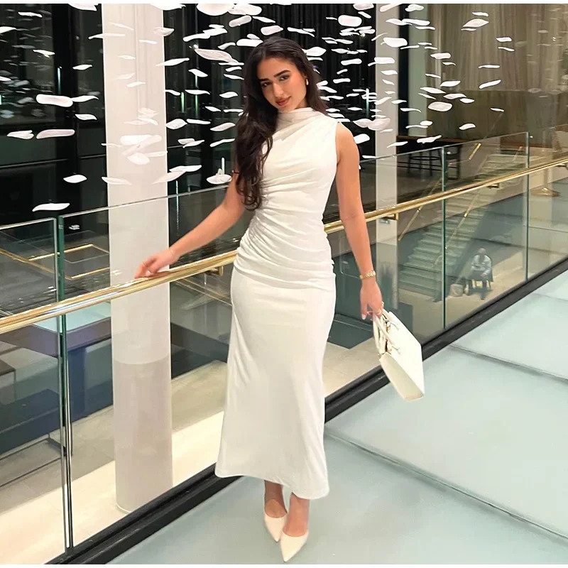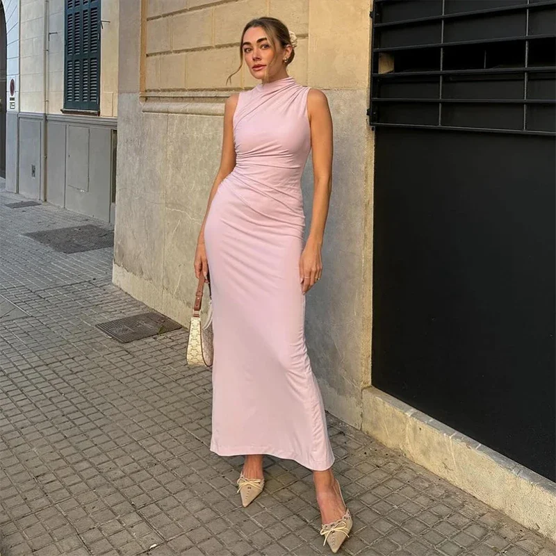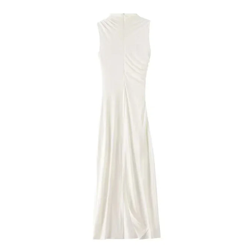 Advbridge Summer Pleated Long Dress Women Bodycon Sleeveless Half High Collar Zipper Split Long Dresses New Lady Party All-matching Robes