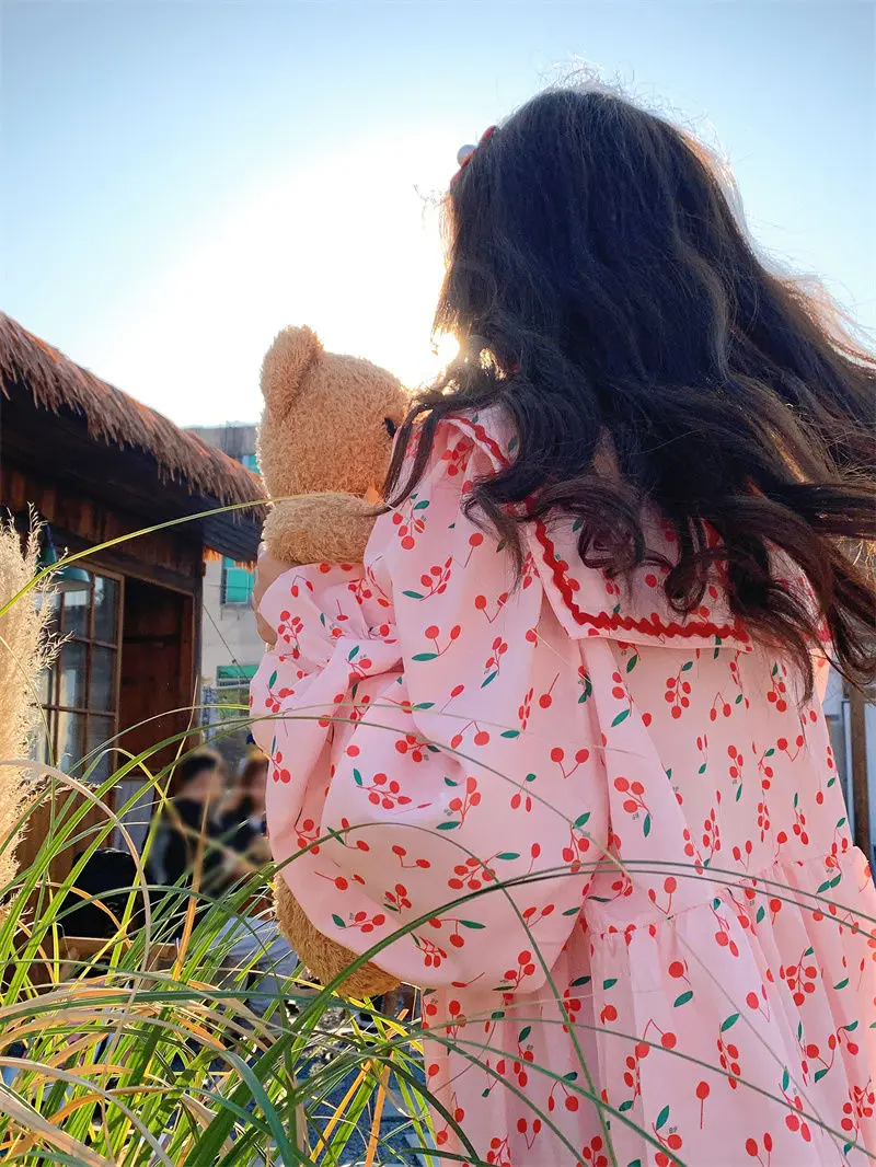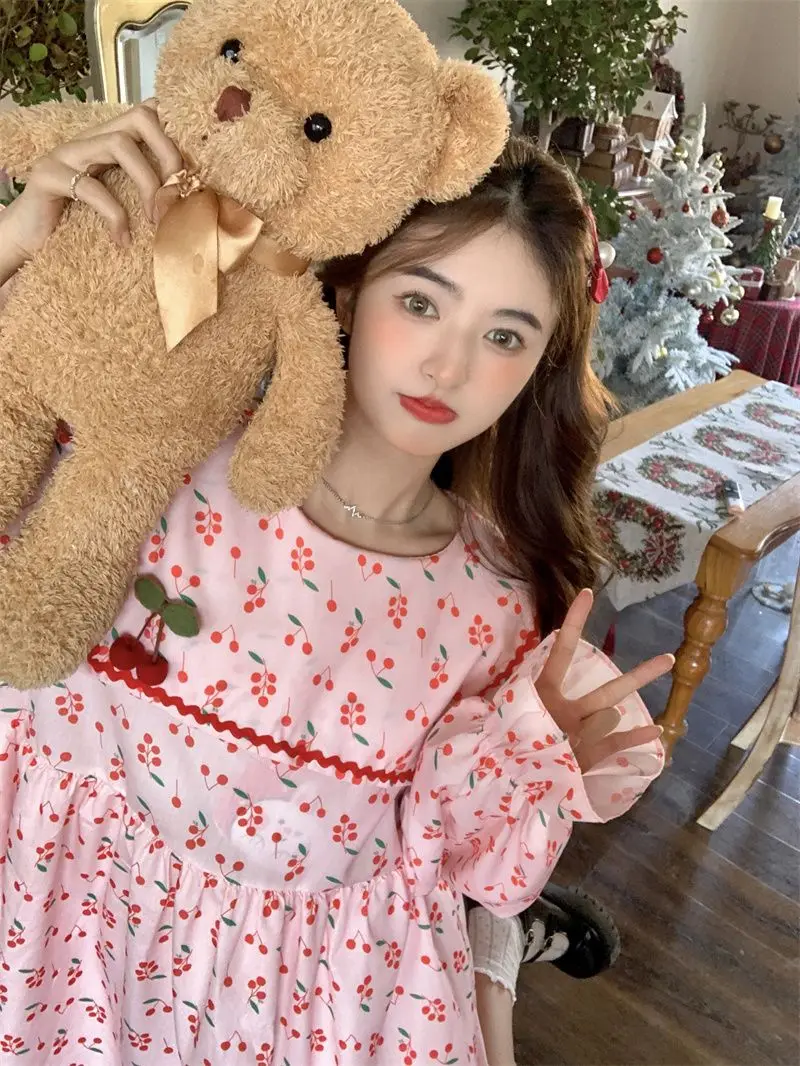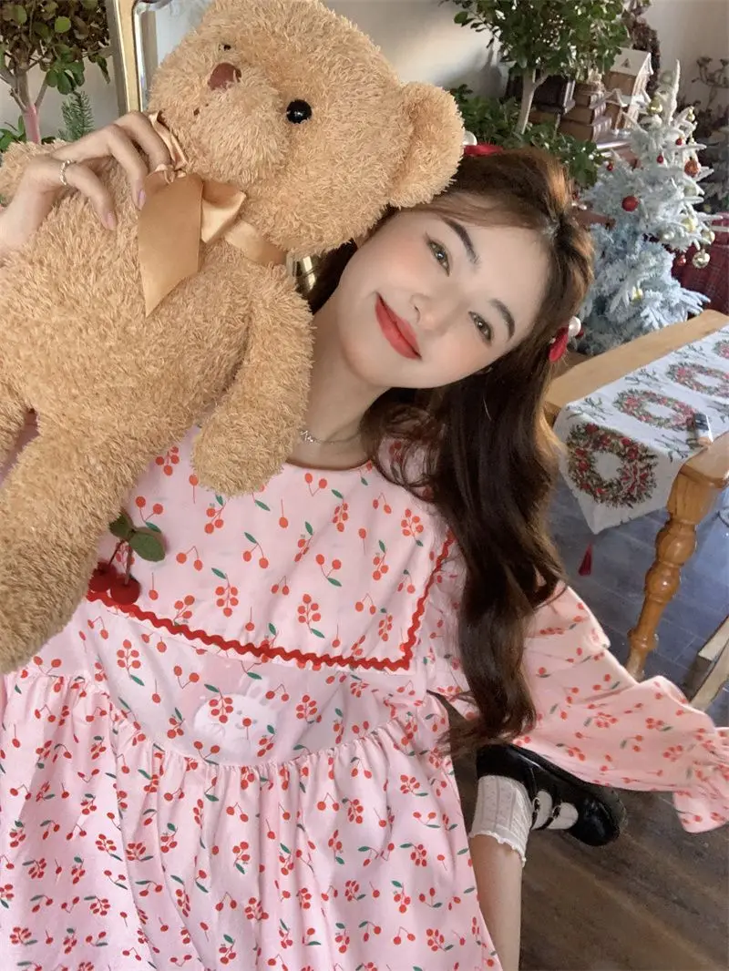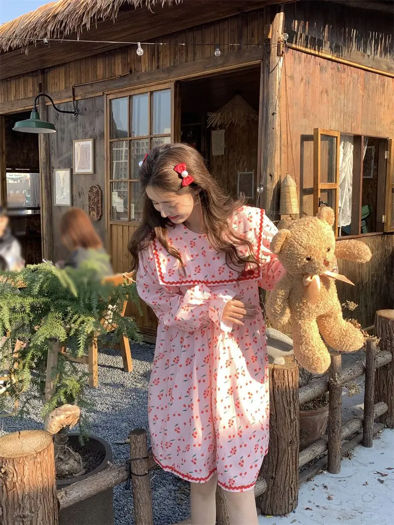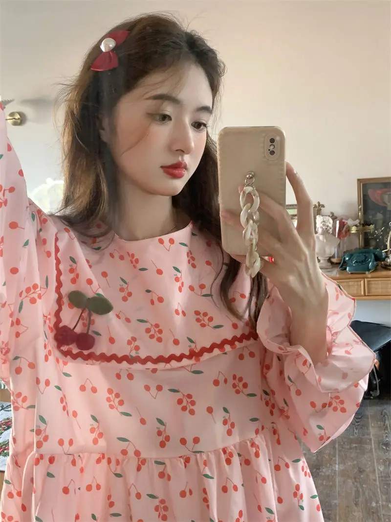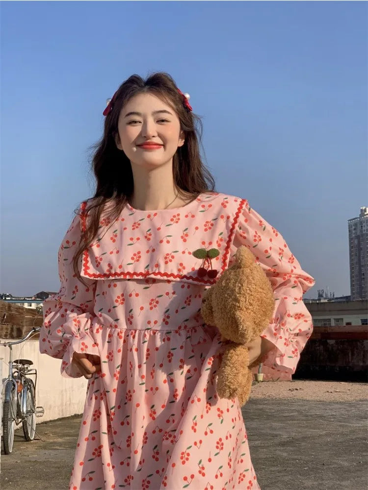Advbridge Sweet Cherry Printed Long Sleeve Dress Women Ruffle Big Lapel Loose A Line Short Dresses Japanese Kawaii Casual Vestido