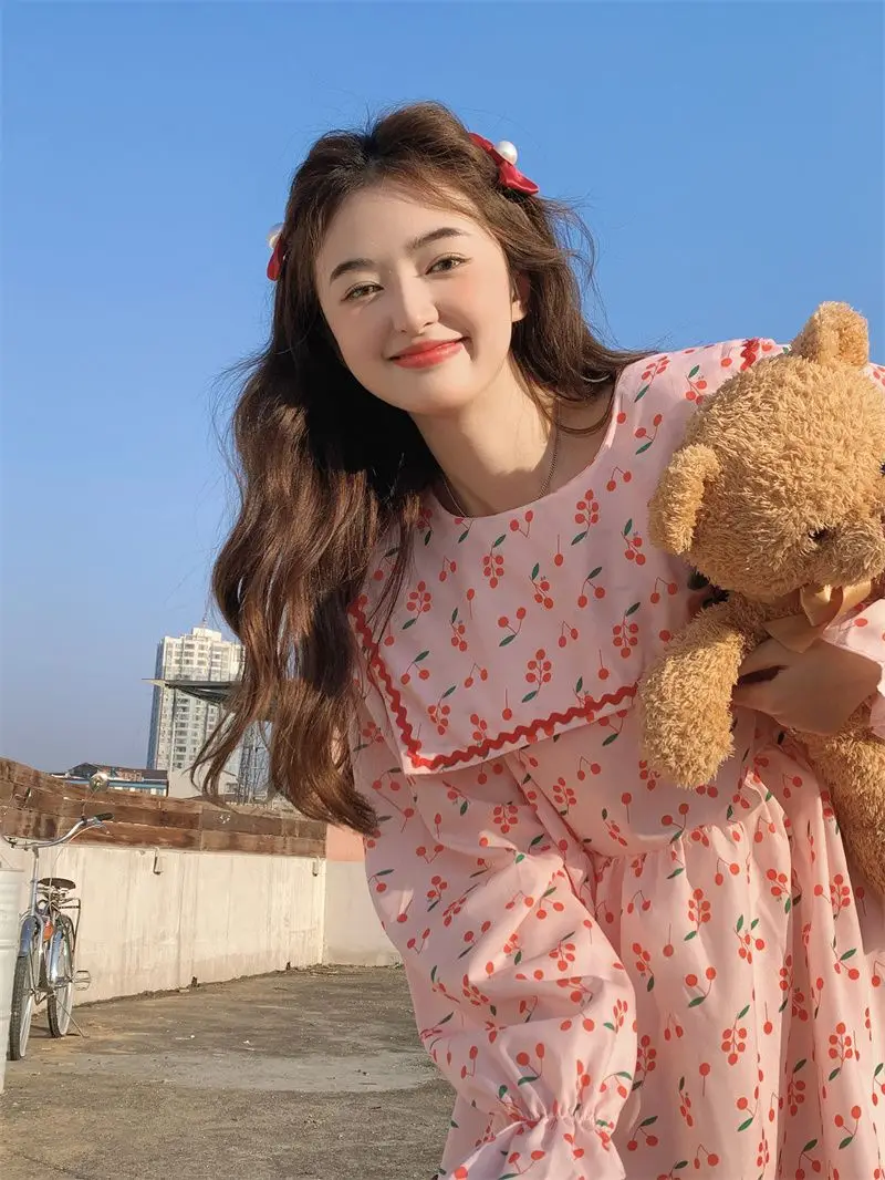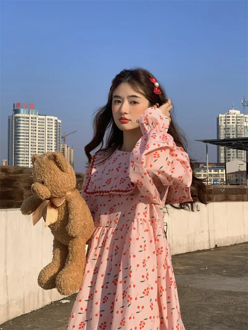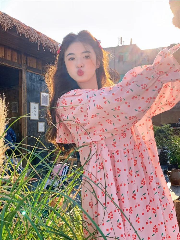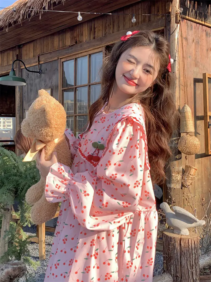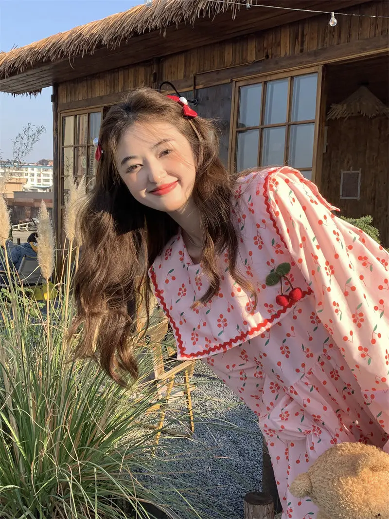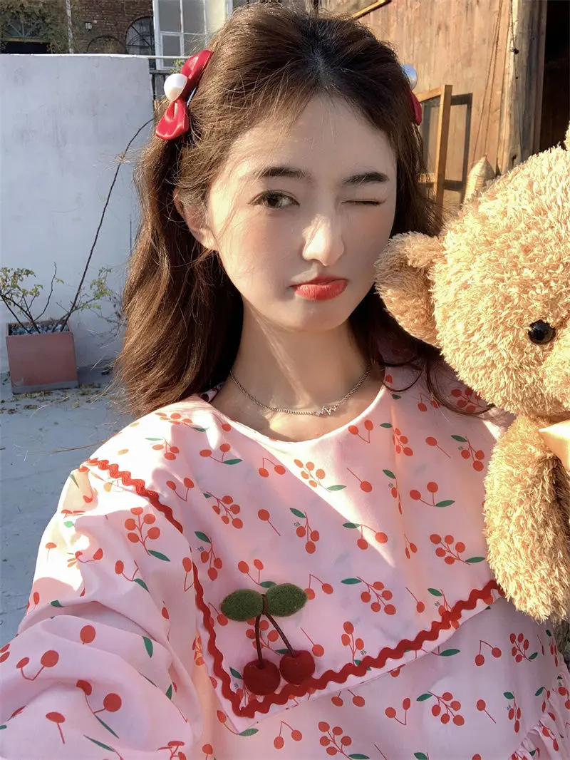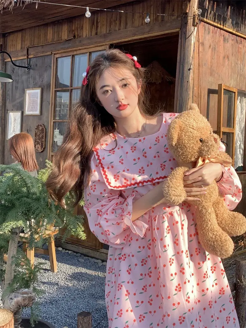Advbridge Sweet Cherry Printed Long Sleeve Dress Women Ruffle Big Lapel Loose A Line Short Dresses Japanese Kawaii Casual Vestido