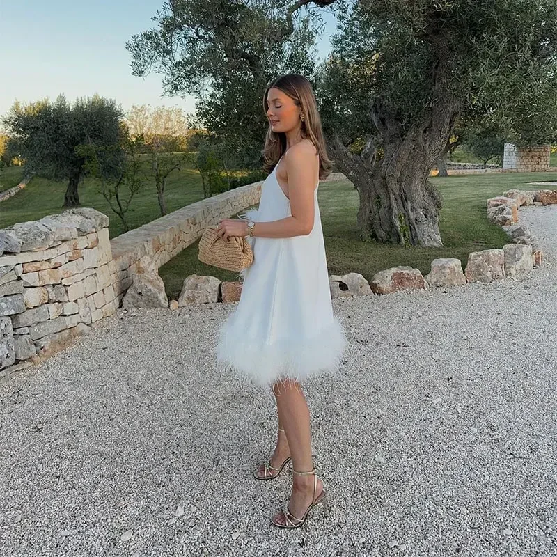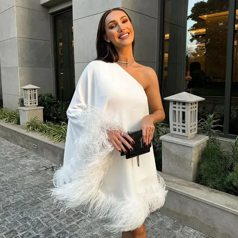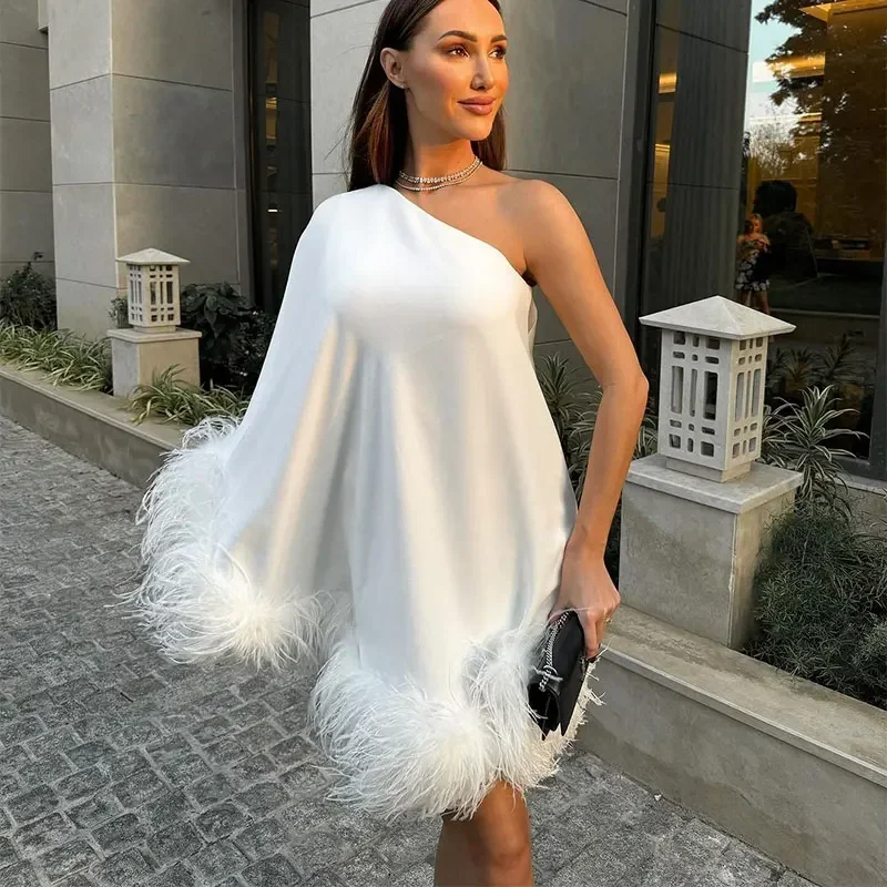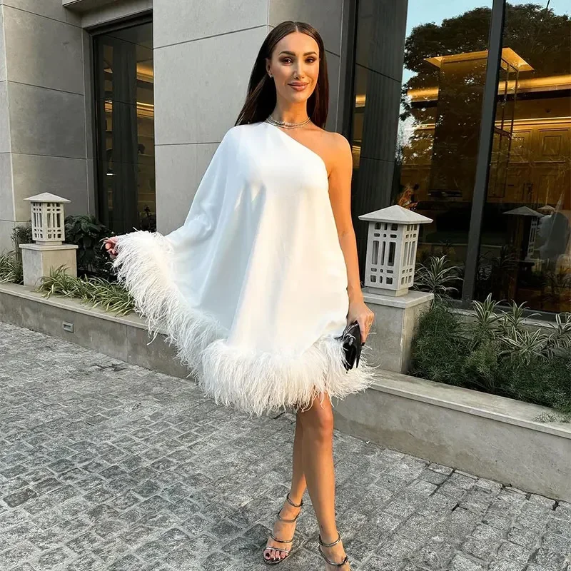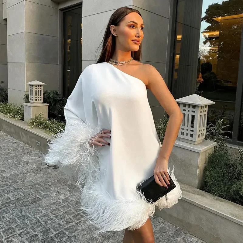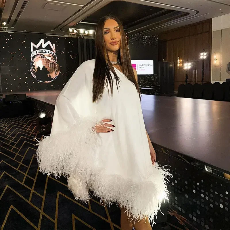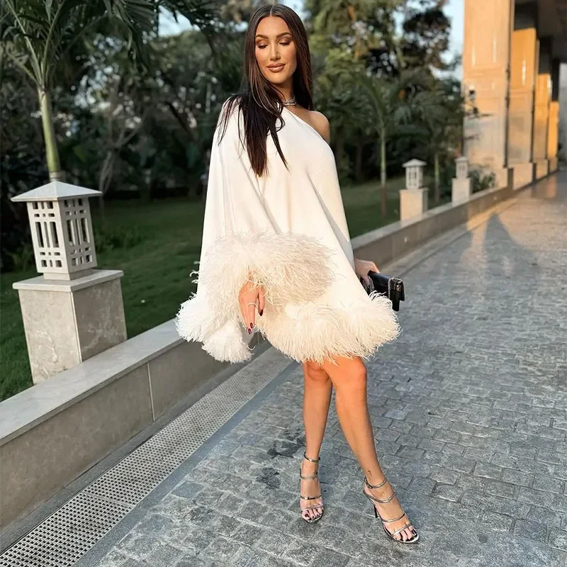 Advbridge Women One Shoulder Feather Spliced Mini Dress Sexy Backless Long Sleeves Loose Vestidos Elegant Fashion Party Club Robes 2024