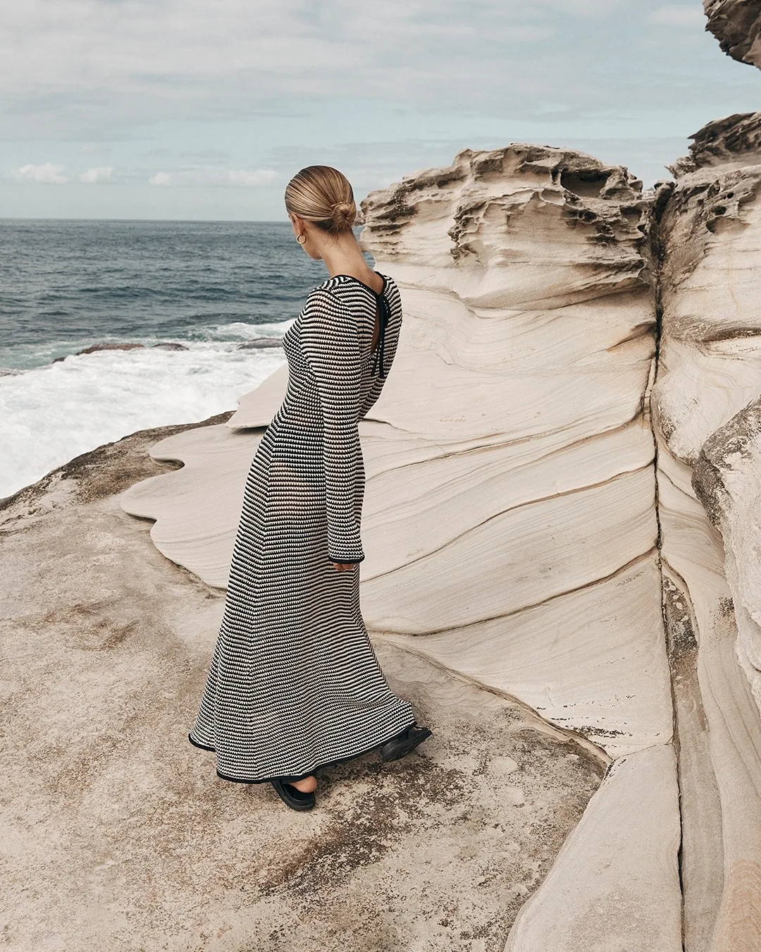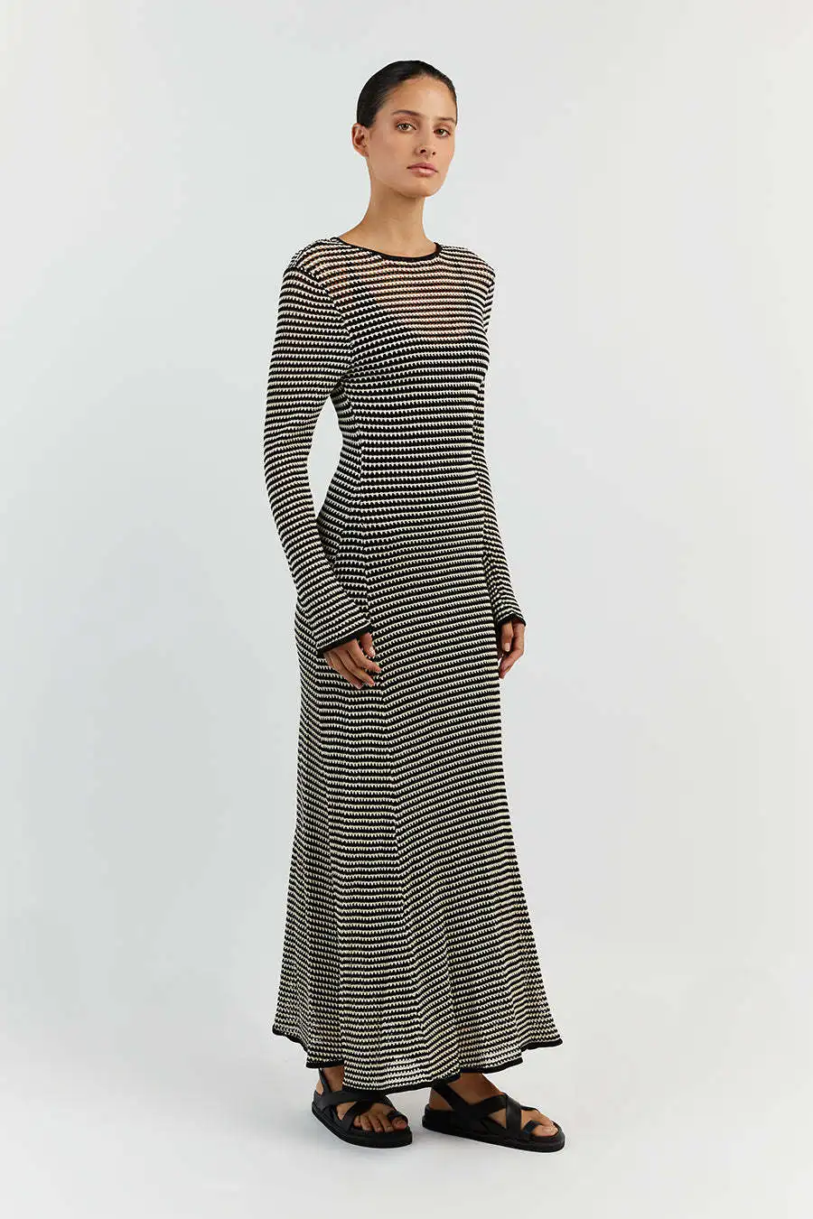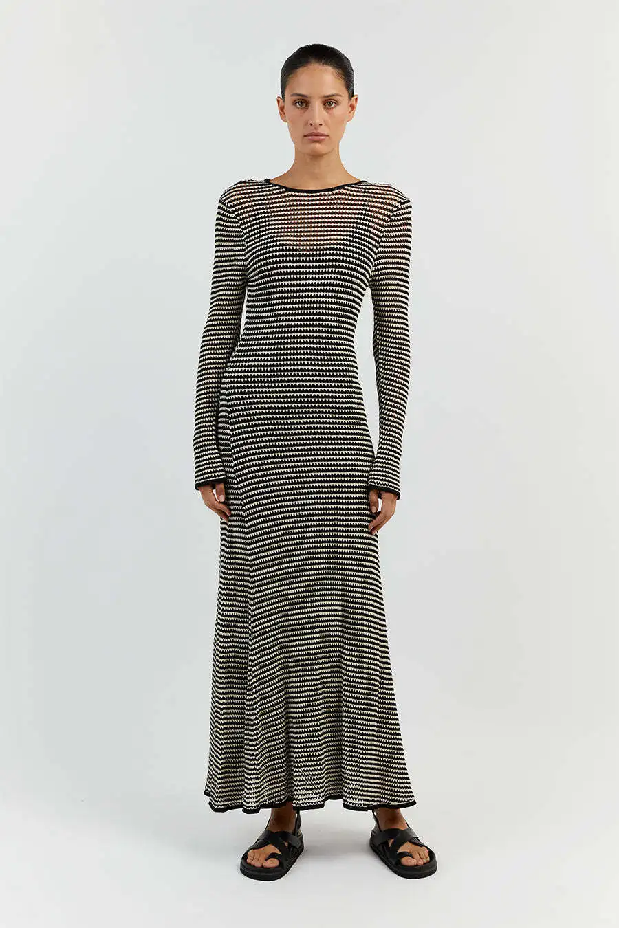 Advbridge Women Sexy Striped Knitted Cotton Hollow Out Long-sleeved Dresses See Through Cover-ups Beach Vacation Wrap Buttock Vestidos