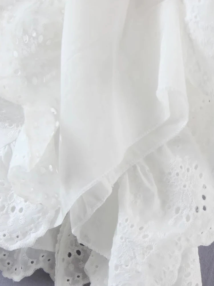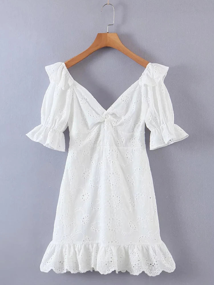 Foridol Ruffles Puff Sleeve White Lace Dress Flower Embriodery Hollow Out Cotton Beach Dress Women Backless Party Mini Dress