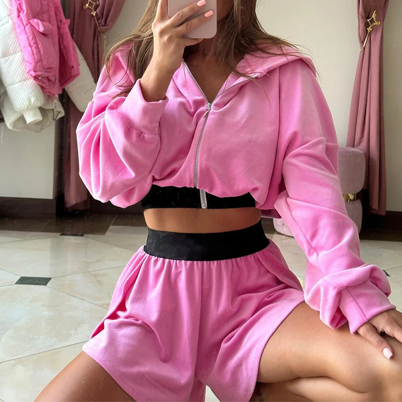 Advbridge Elegant Velvet Sportswear Outifts Fashion Zip Hoodies Coats and High Waist Shorts Suit Women Casual Long Sleeves Solid 2Pc Sets