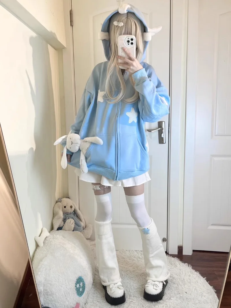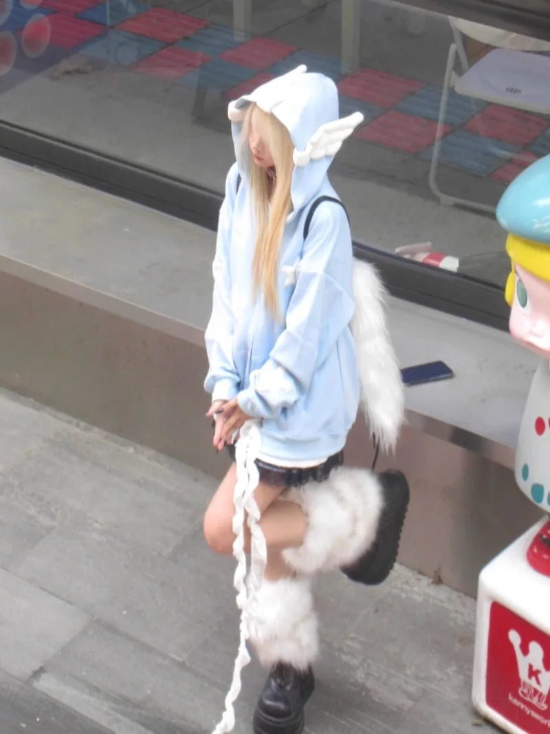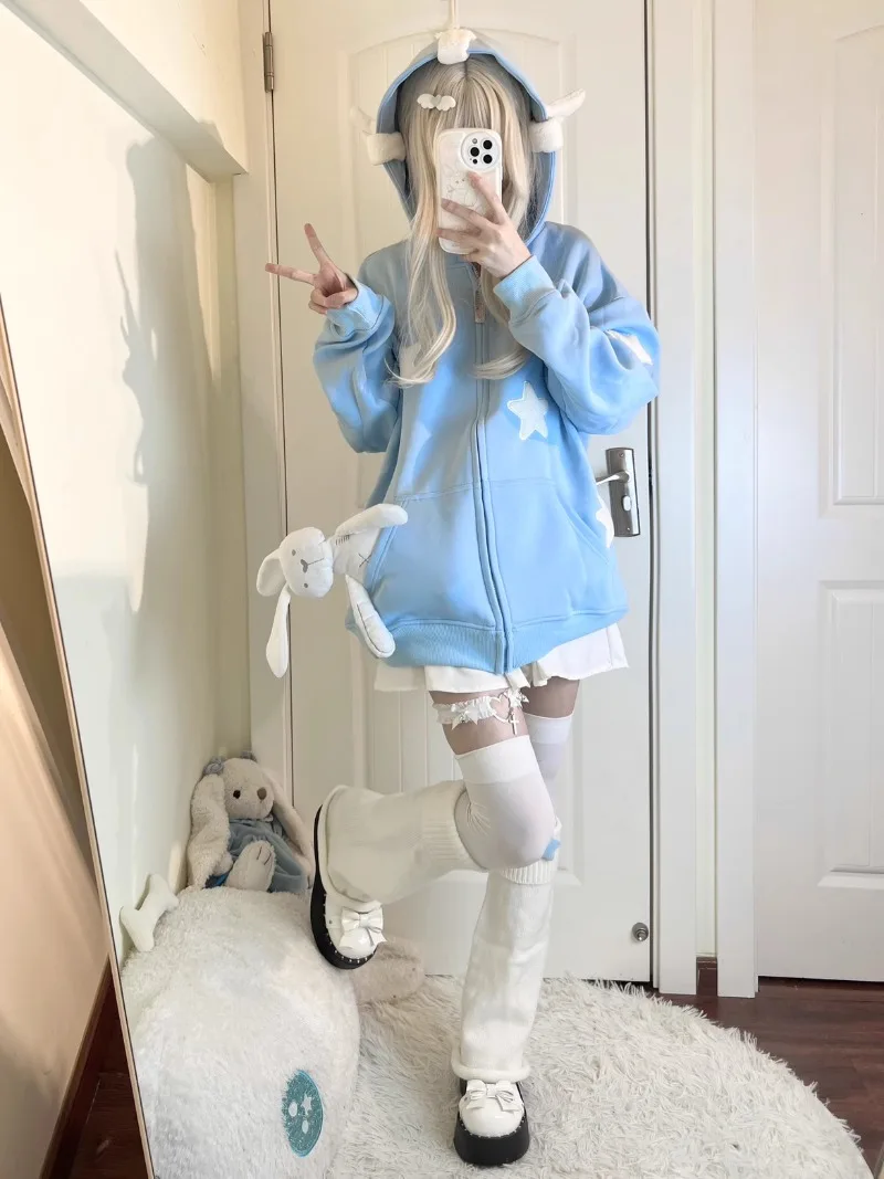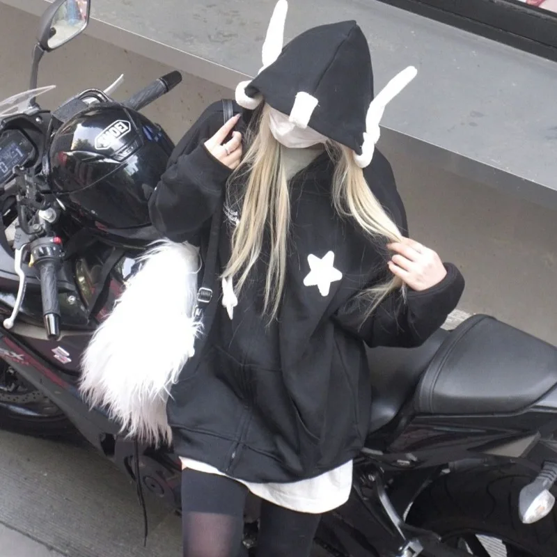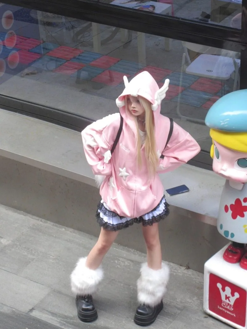 Advbridge Japanese Y2K Zip Up Blue Hoodie Women Harajuku Kawaii Angel Wings Pink Sweatshirts Oversized Subculture Star Black Jacket