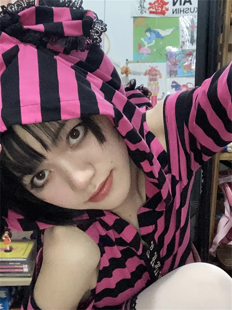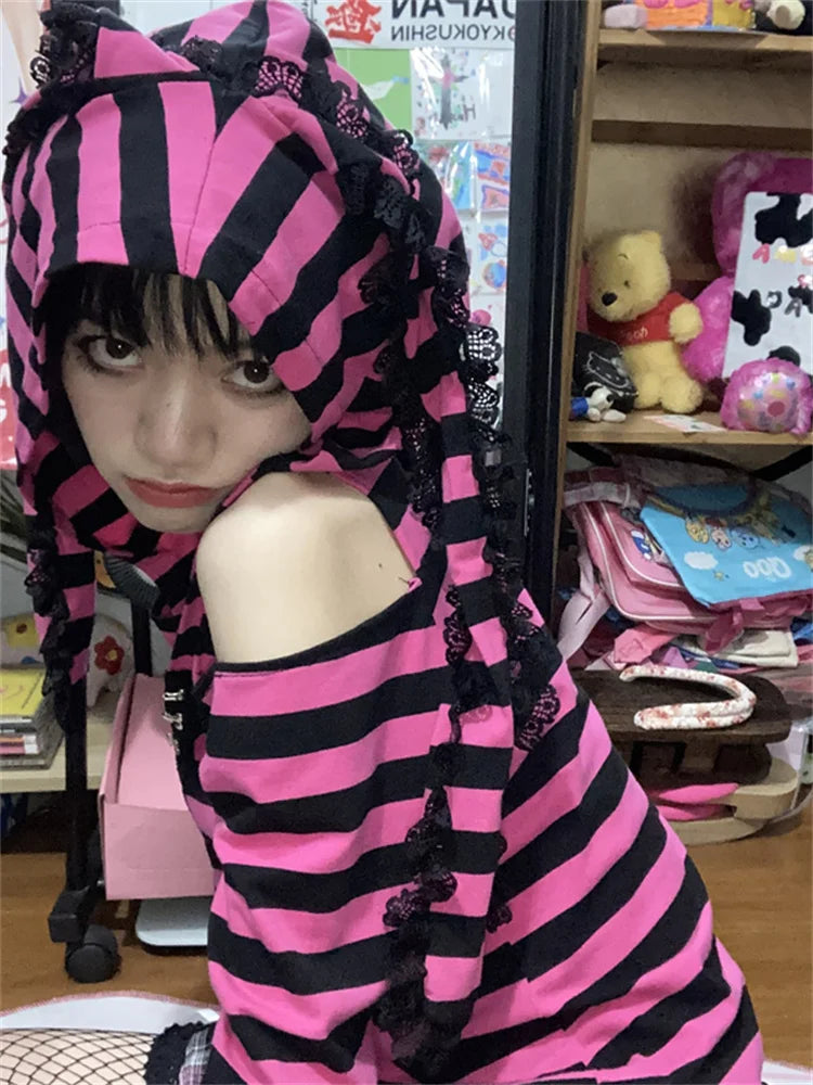 Advbridge Striped Print Goth Grunge Hoodie Pink Black Gothic Style Bunny Ears Hoodies Female Fairy Harajuku Kawaii Slim Hoodied Egirl Top