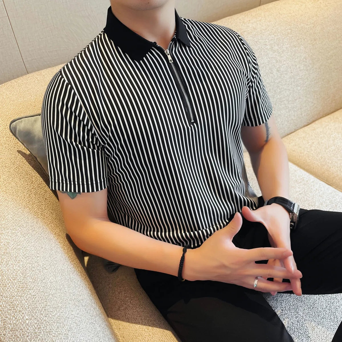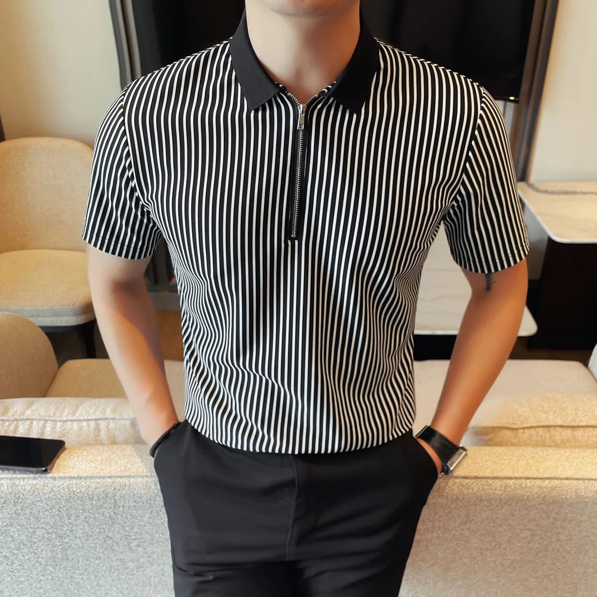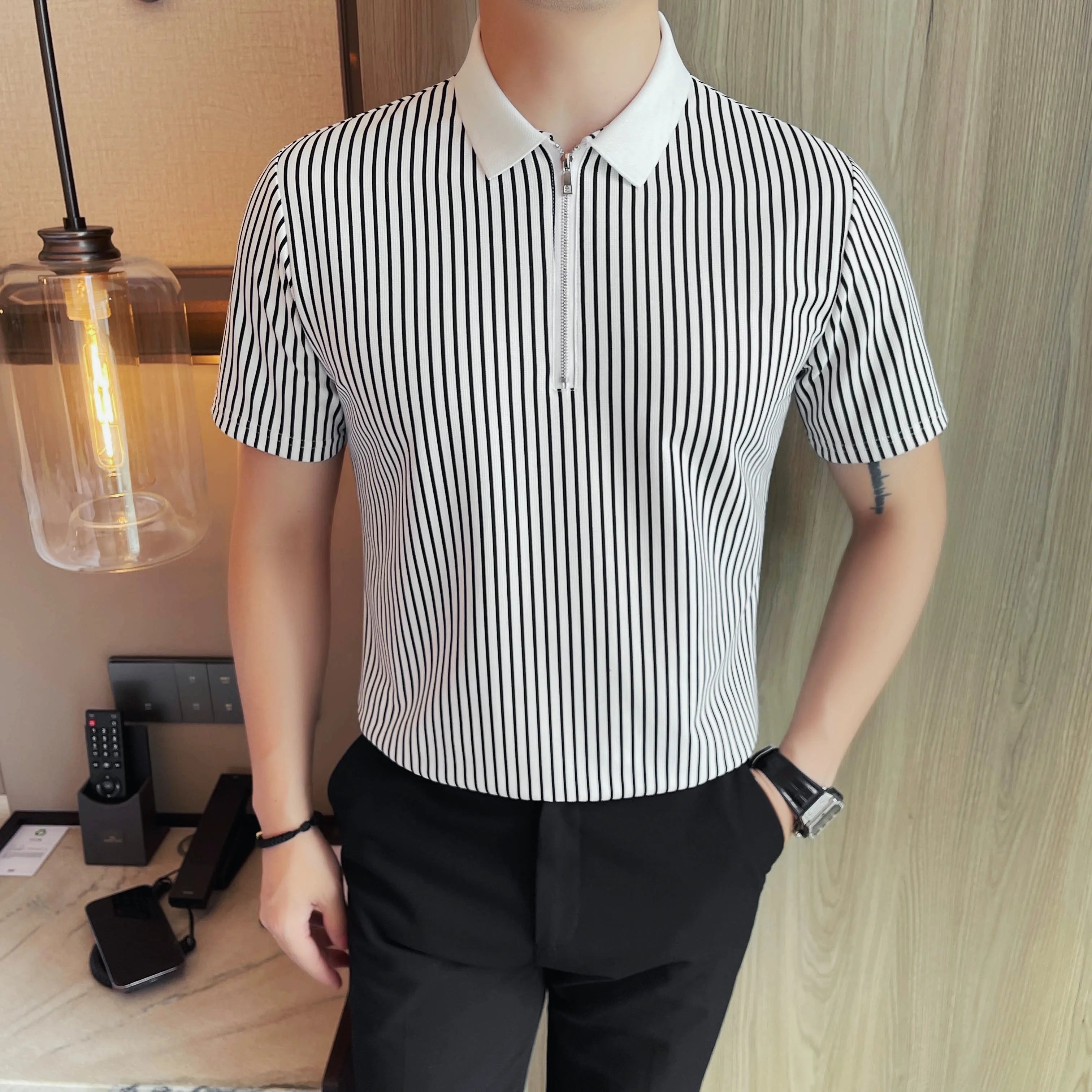 Advbridg Men Pinstripe Polo Shirt - Summer Business Casual Half-Zipper Turn-Down Collar Versatile Short Sleeve Top Stylish Everyday Wear