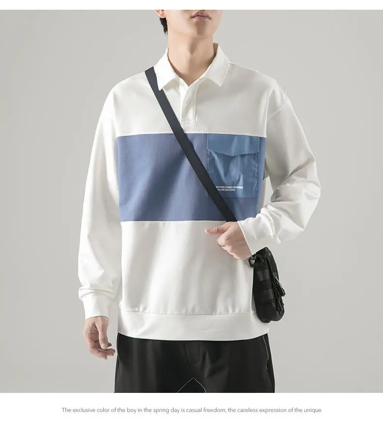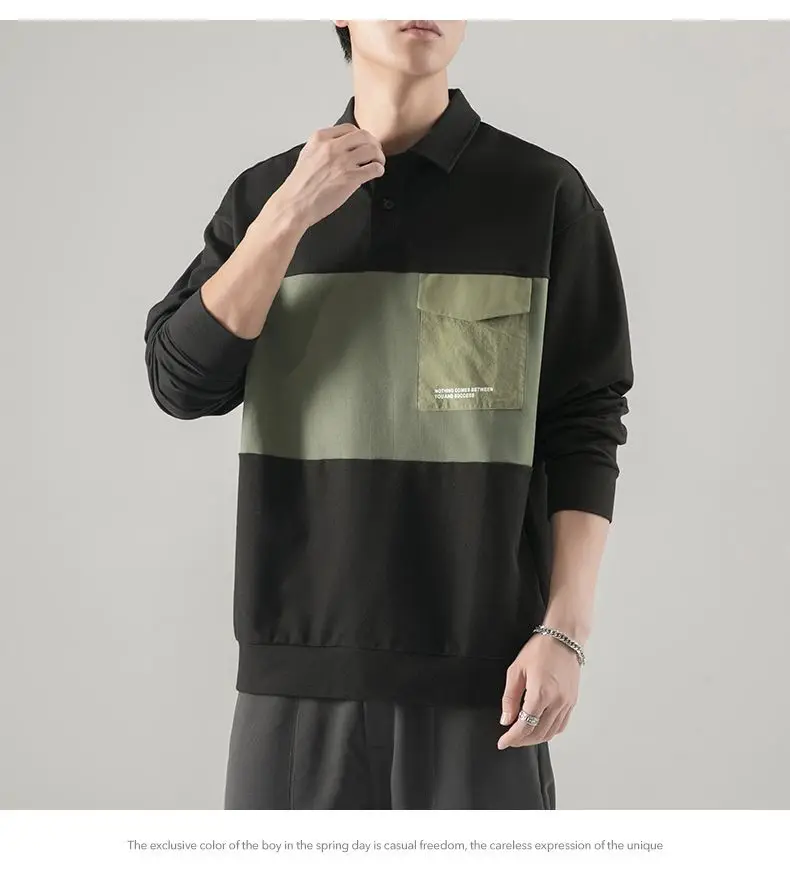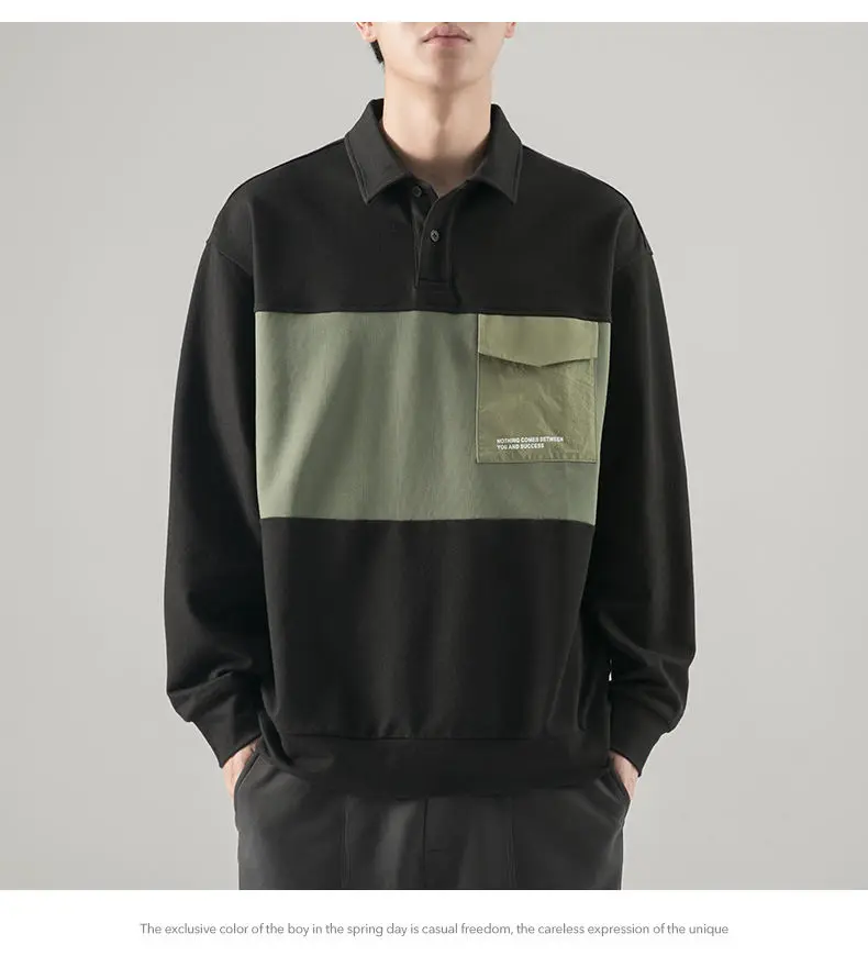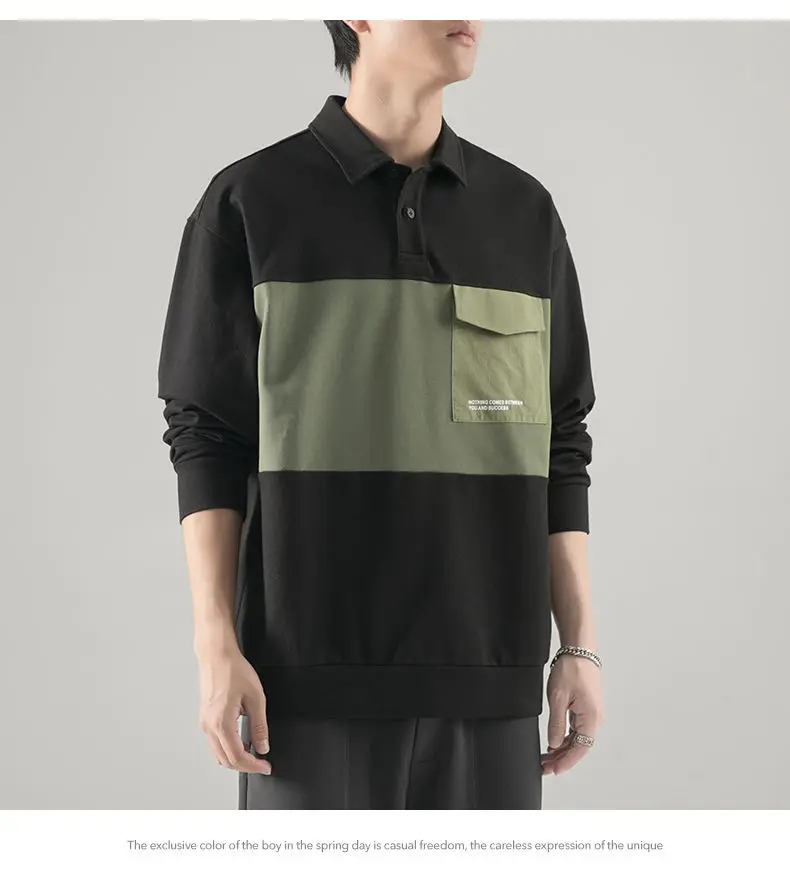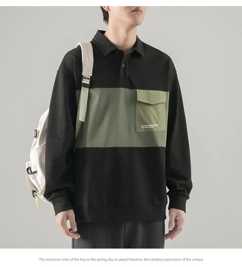 Advbridge Autumn New Polo Collar Long Sleeve Shirt Men's Japanese Large Loose Contrast Panel Pocket Bottoming Shirt Fashion Top