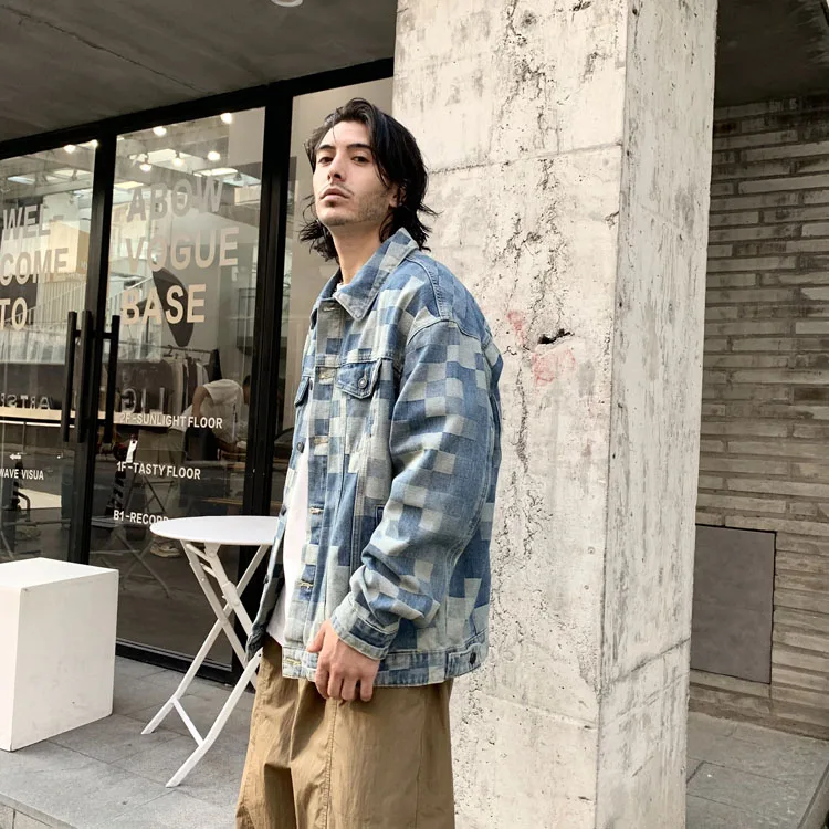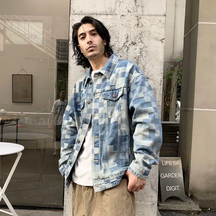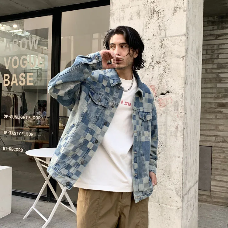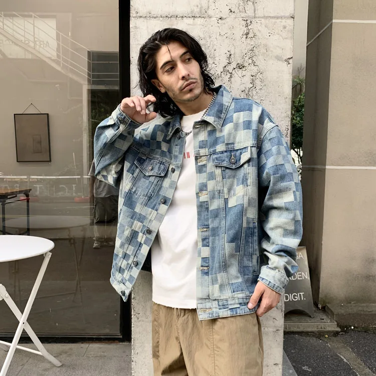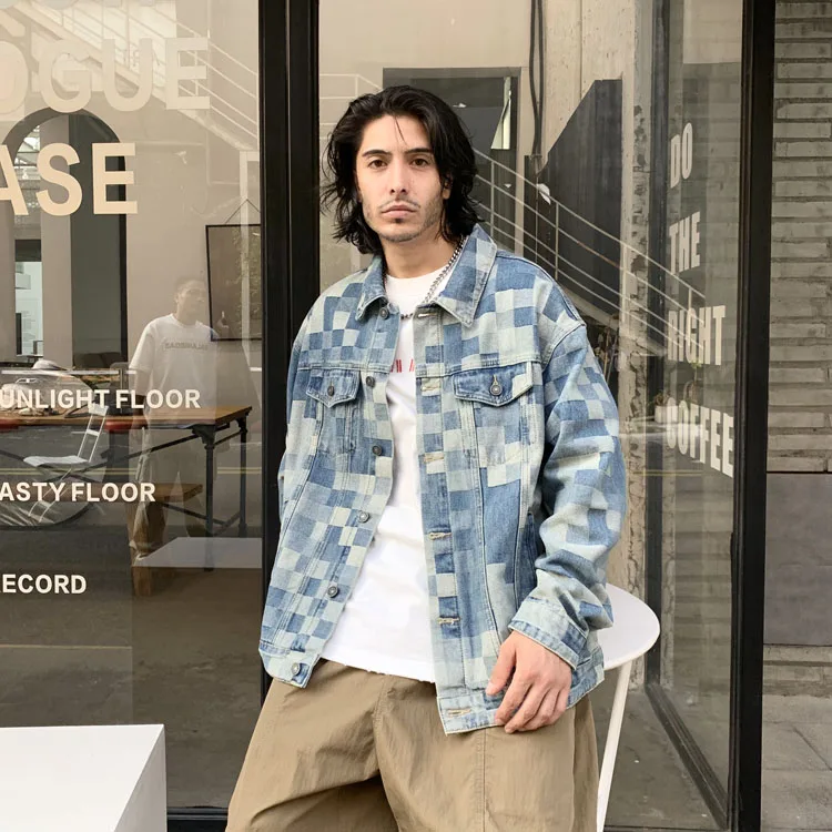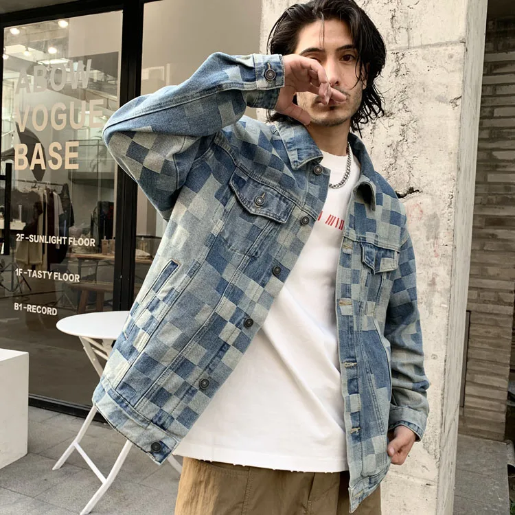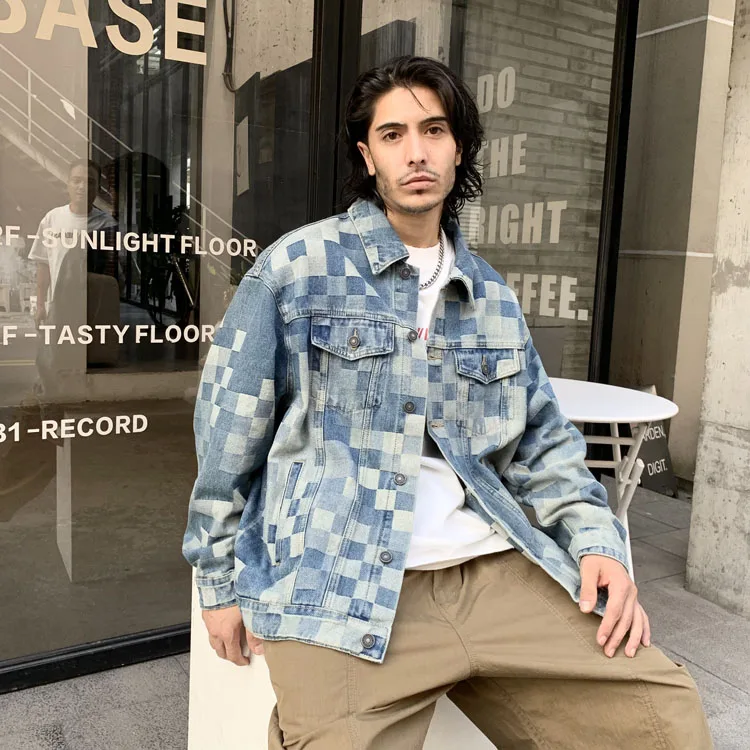 Advbridge Check Mosaic Pattern Men Denim Jacket Loose Plaid Jacquard Weave Cotton Coat Long Sleeve loose Turn Down Collar Outerwear