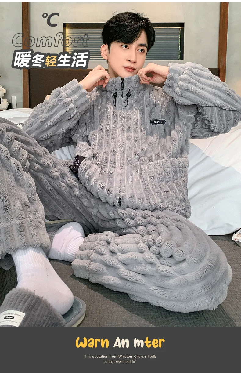 Advbridge Coral Fleece Men Winter Warm Pajamas Sets Stand Collar Fluffy Coat + Long Pants Sleepwear for Sleeping Men's 2 Pieces Loungwear