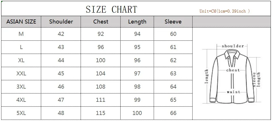 Note: We sell ASIAN SIZE is about2-3 sizeSMALLER than US,UK,AU,EU size.Please choose the size according to our size form.All the dimensions we have personally measured and reality try. When you place the order please live the message with your Shoulder(CM) and Chest(CM) .We will help you to confirm the size.Think you for buying !